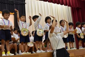 幼稚園で走り、鉄棒、絵を描く、小学校では、国語、算数、教科の成績をもらってくる