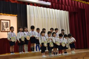 幼稚園で走り、鉄棒、絵を描く、小学校では、国語、算数、教科の成績をもらってくる