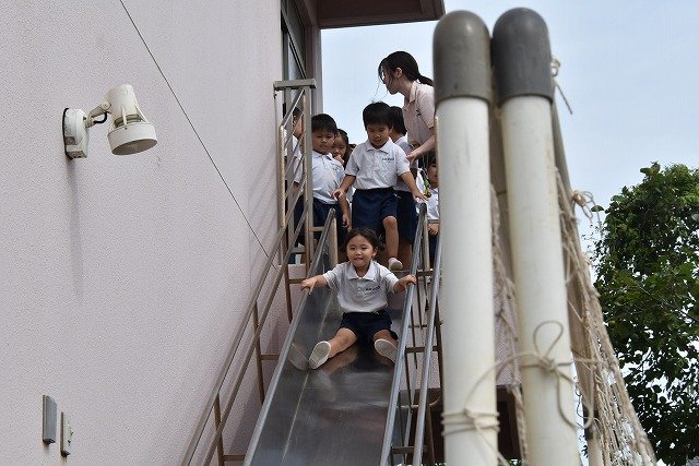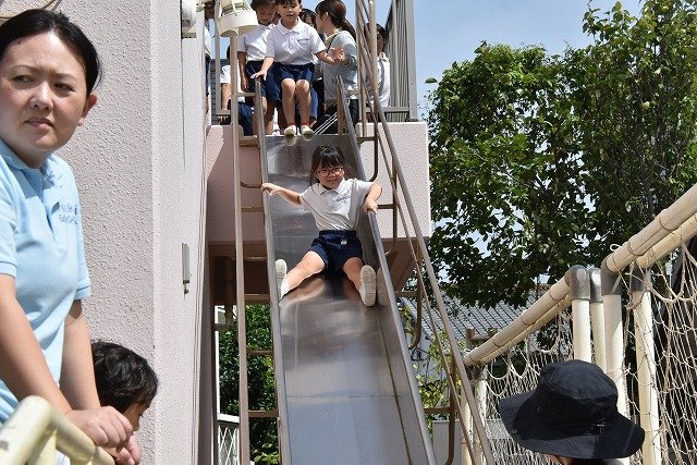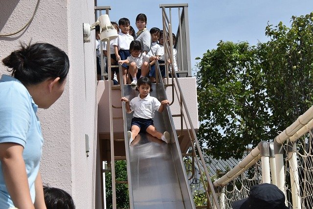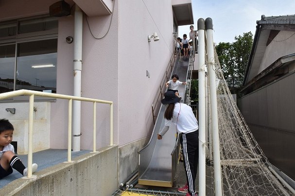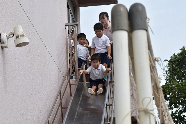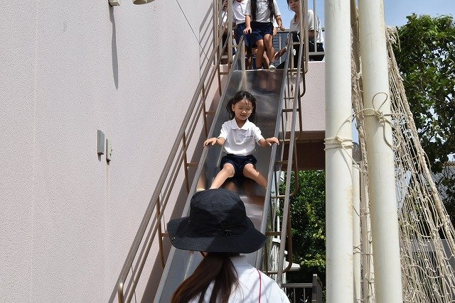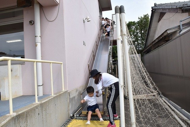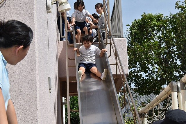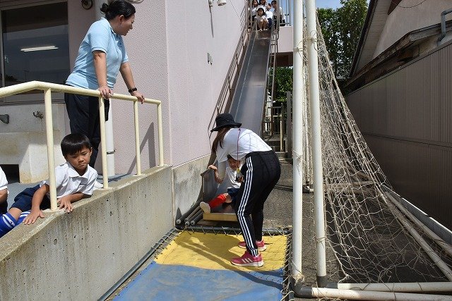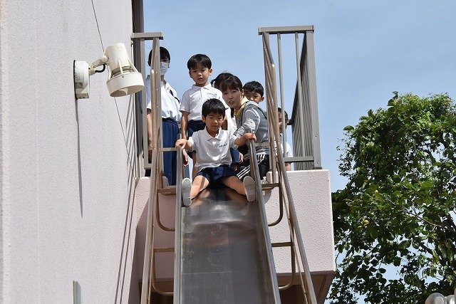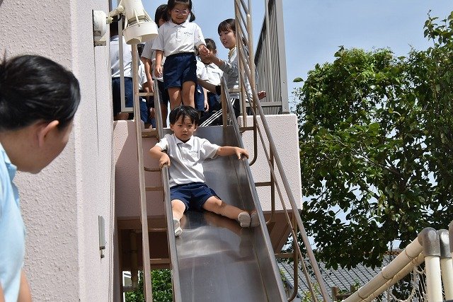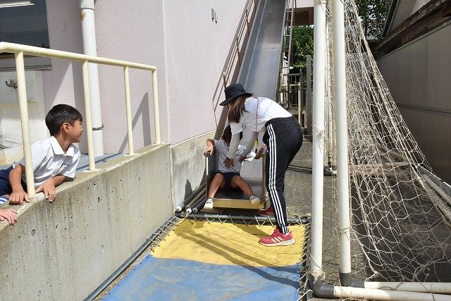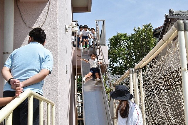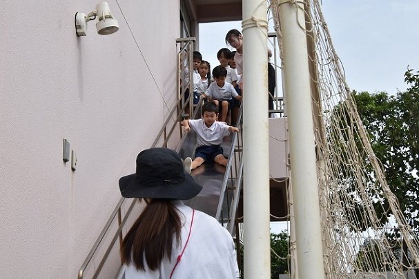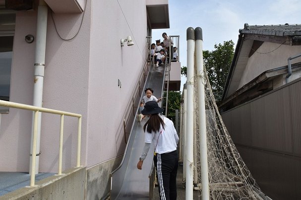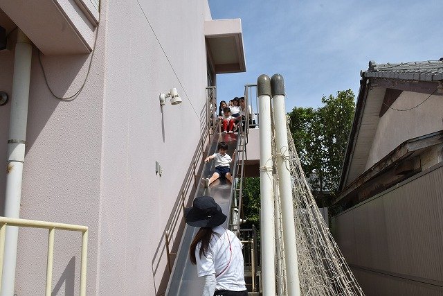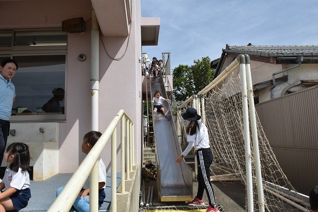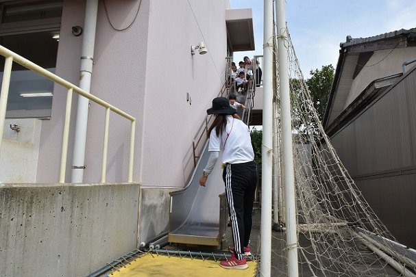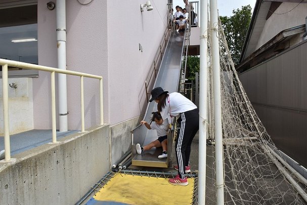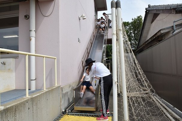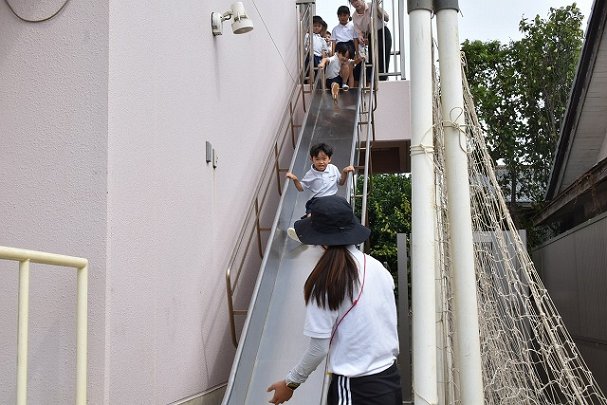 年長組のお友達が避難用滑り台を使って避難する練習を行いました。