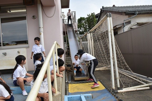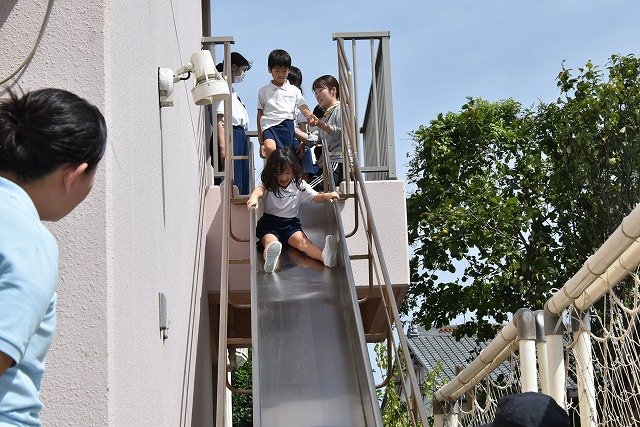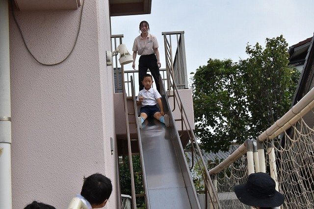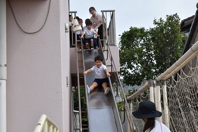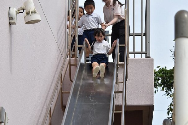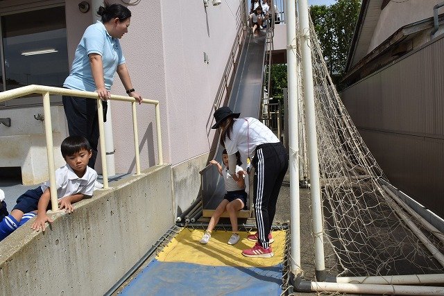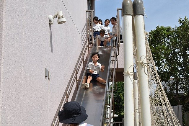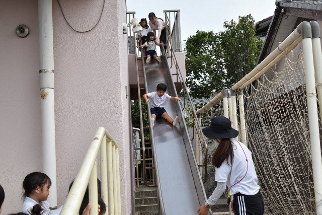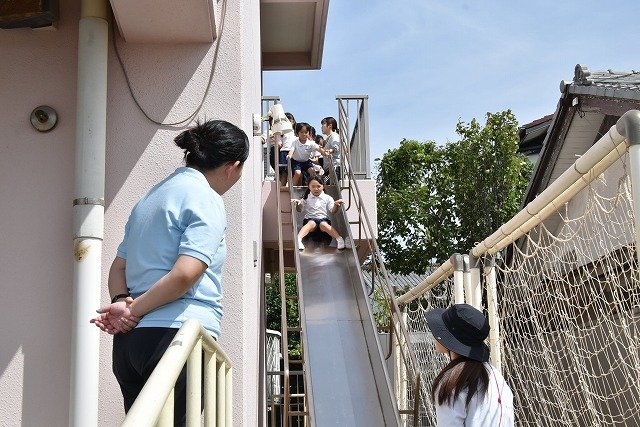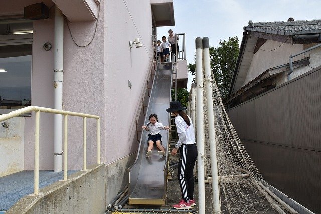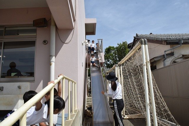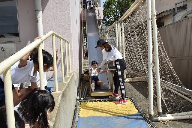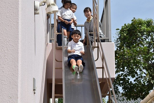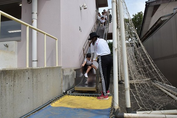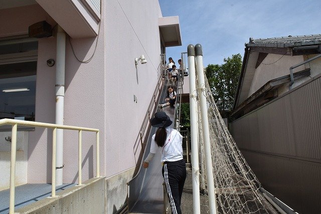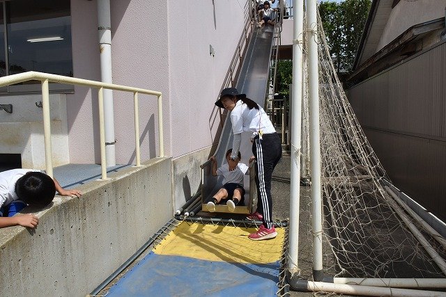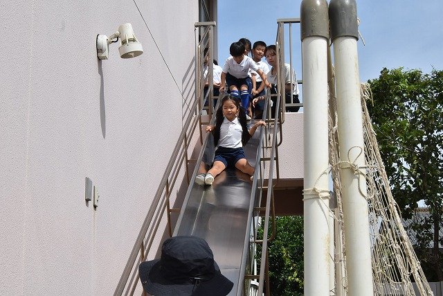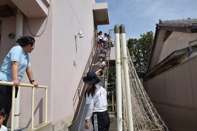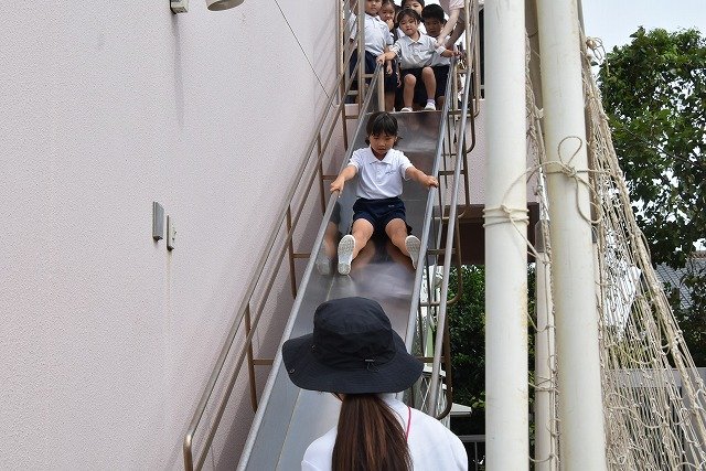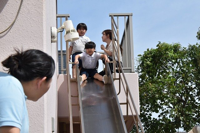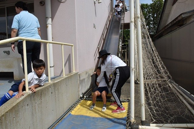年長組のお友達が避難用滑り台を使って避難する練習を行いました。
