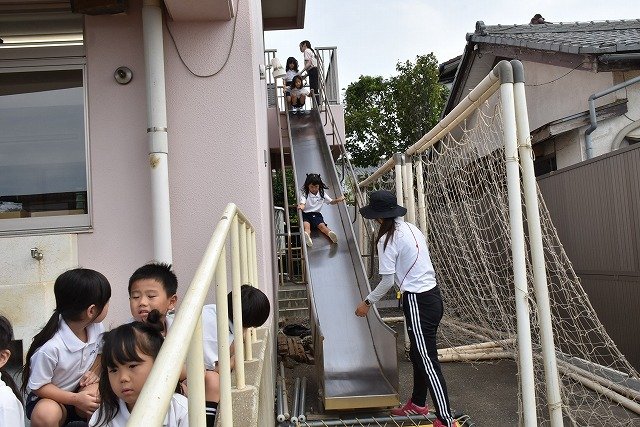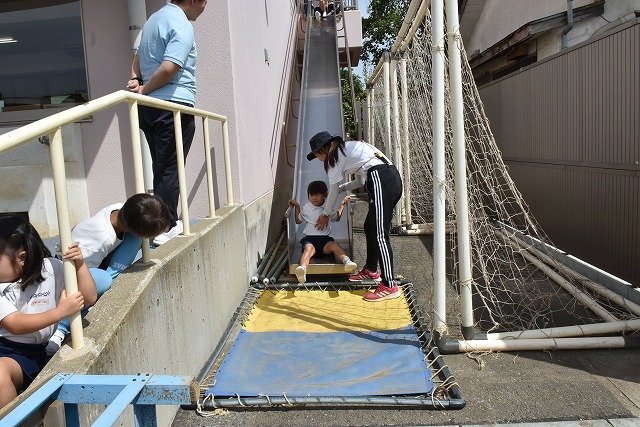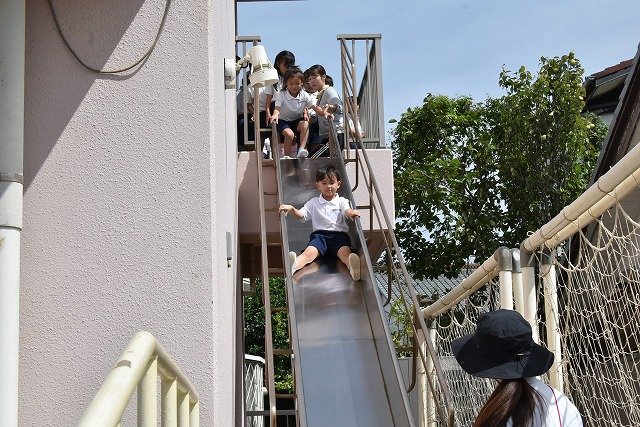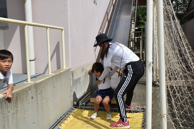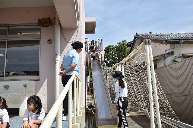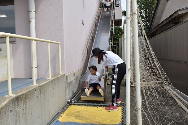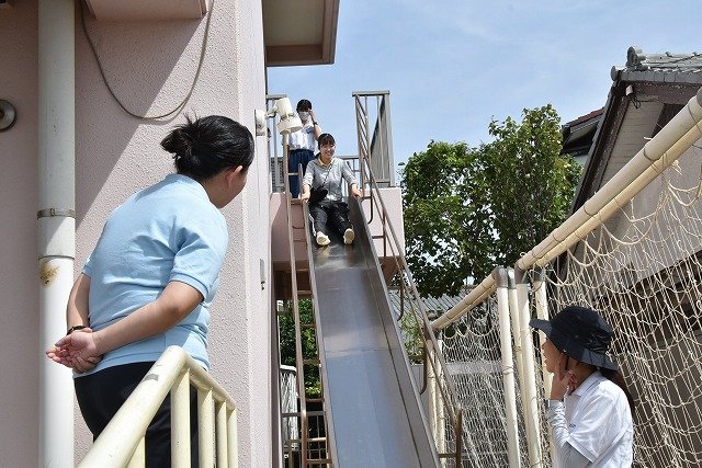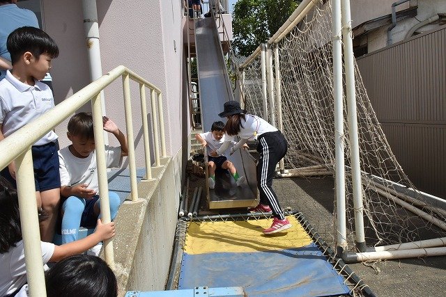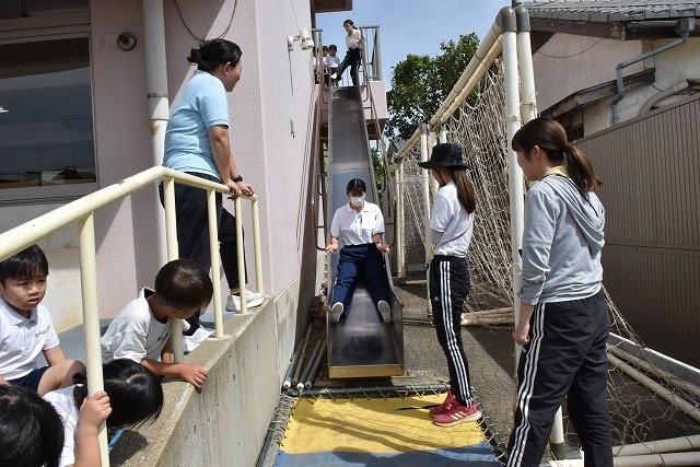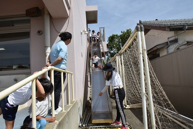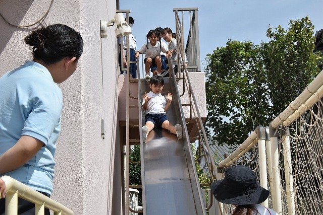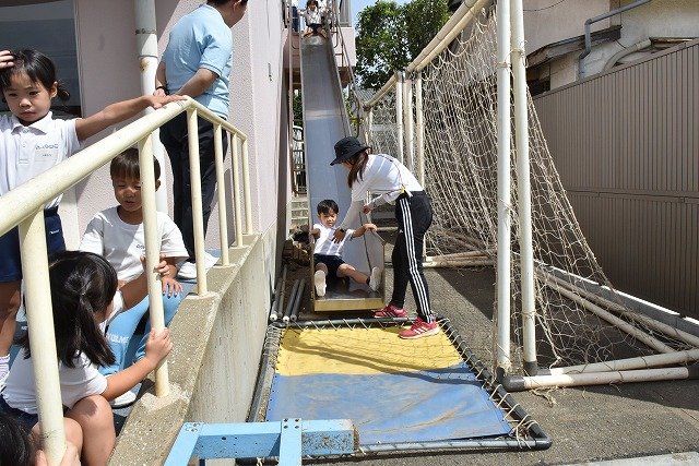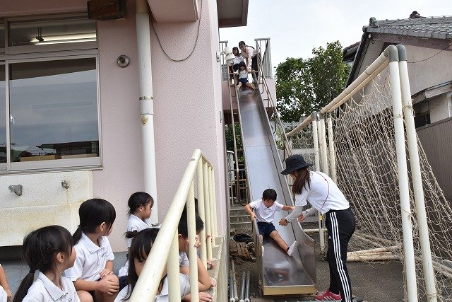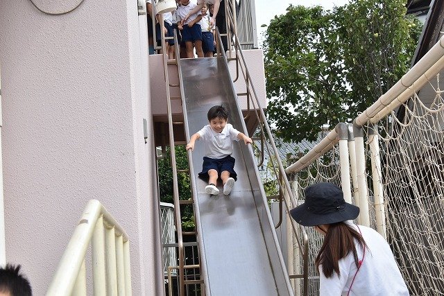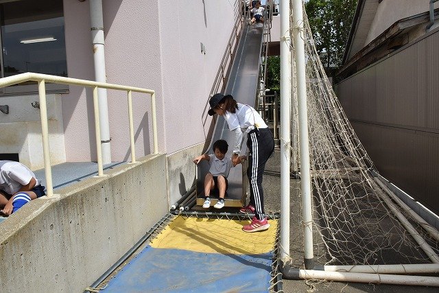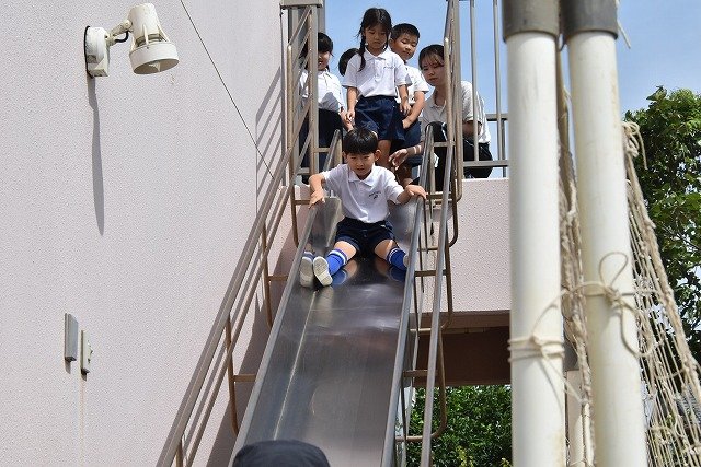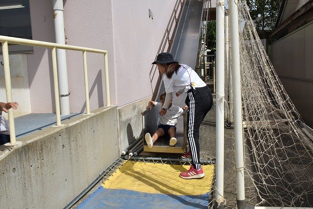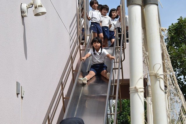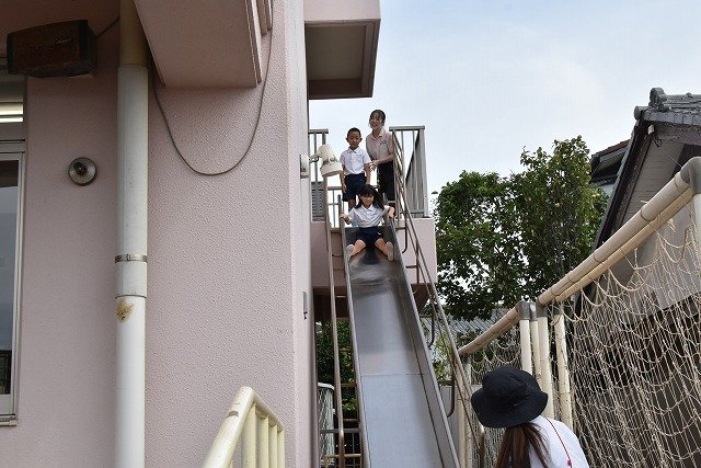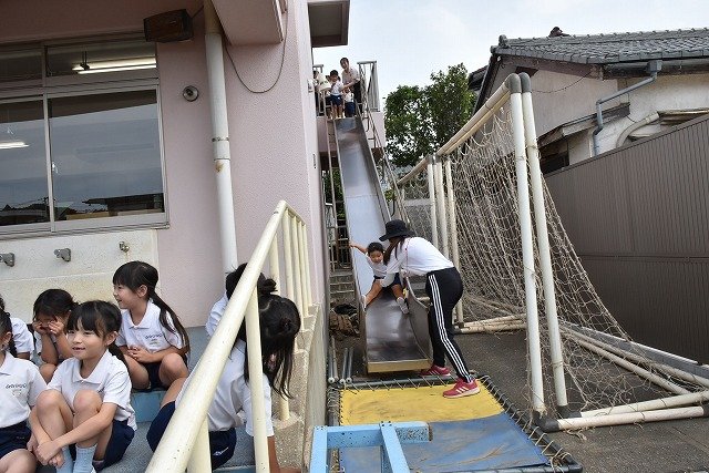 年長組のお友達が避難用滑り台を使って避難する練習を行いました。