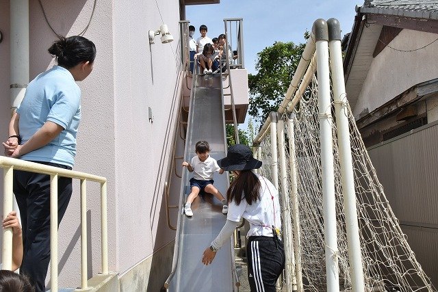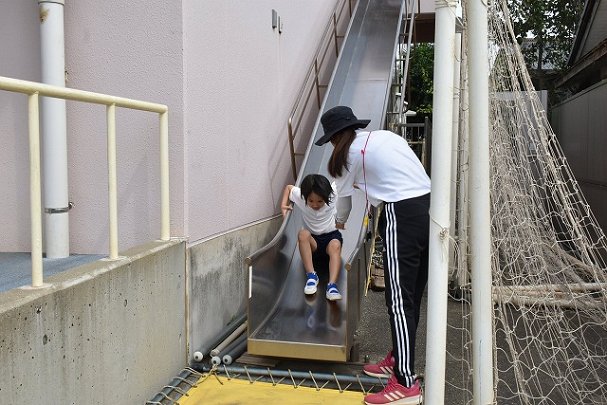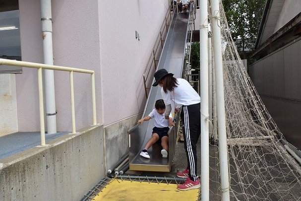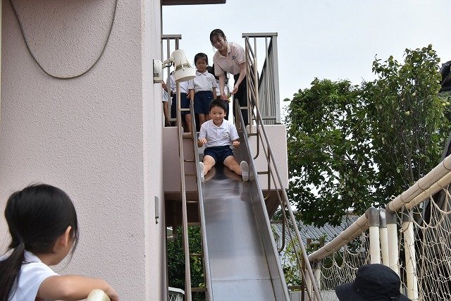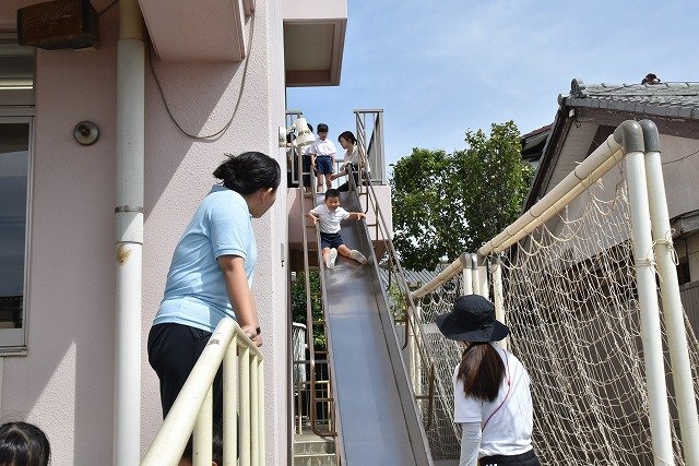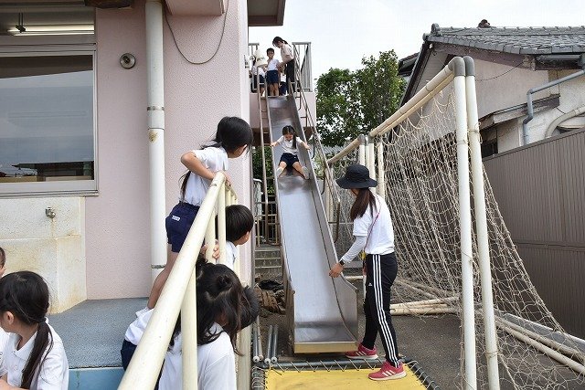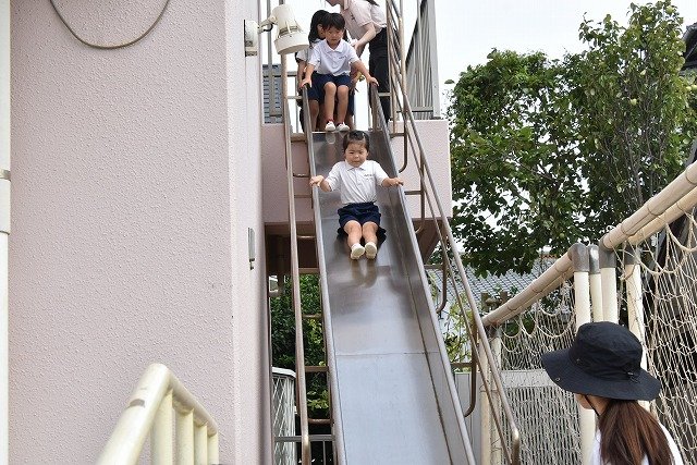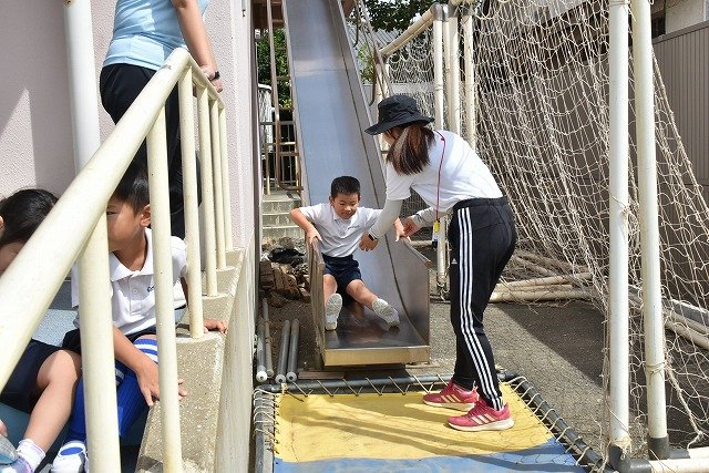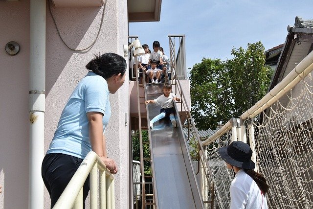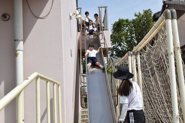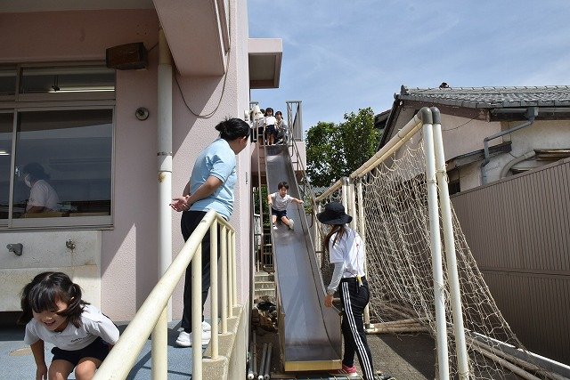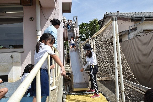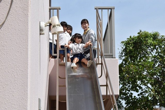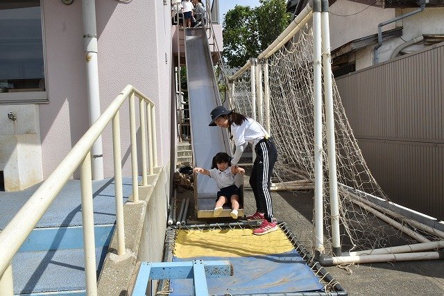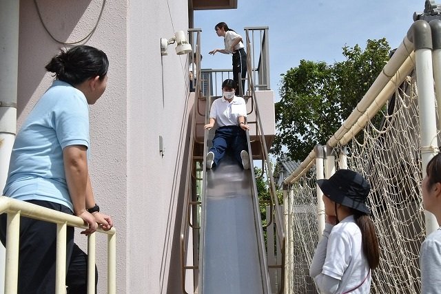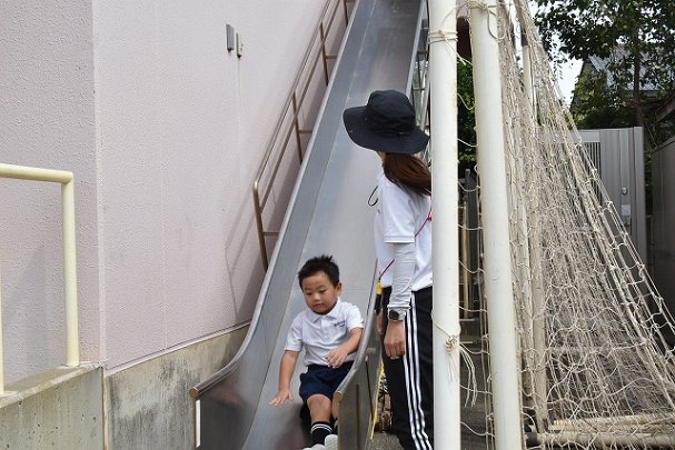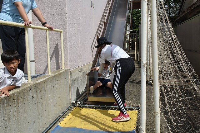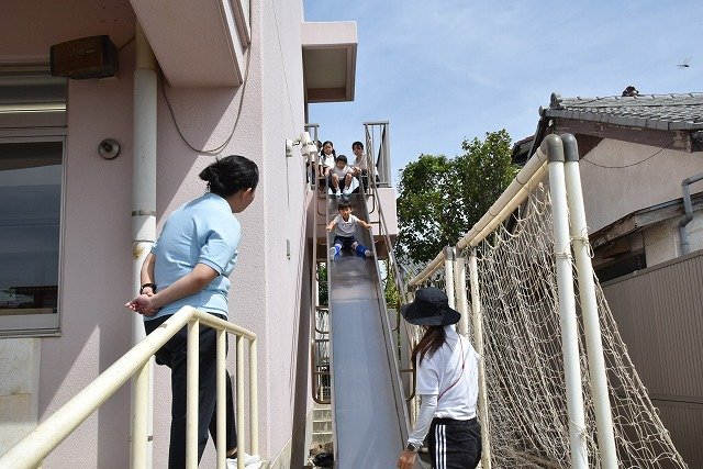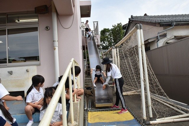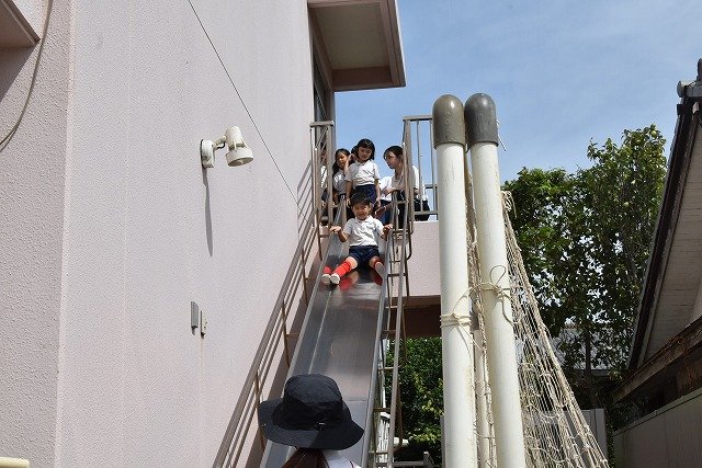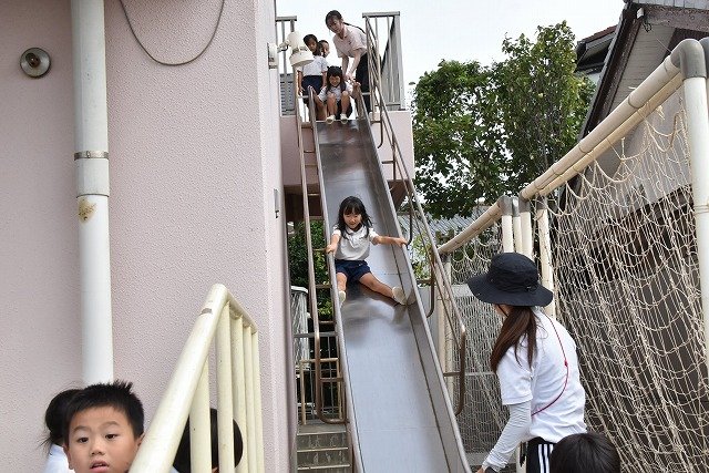 年長組のお友達が避難用滑り台を使って避難する練習を行いました。