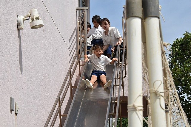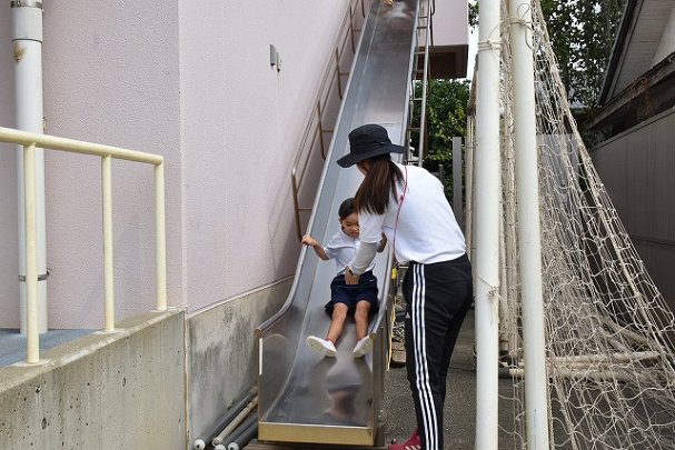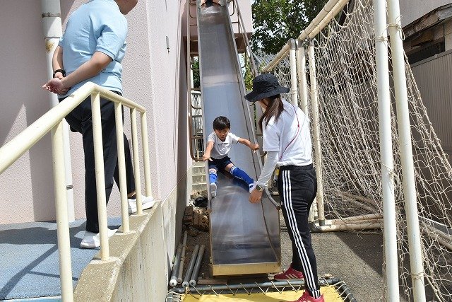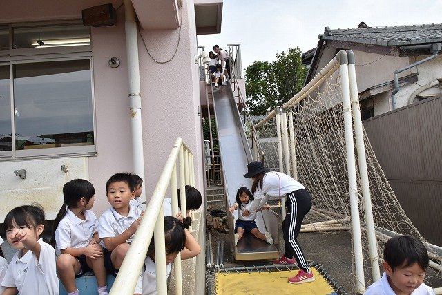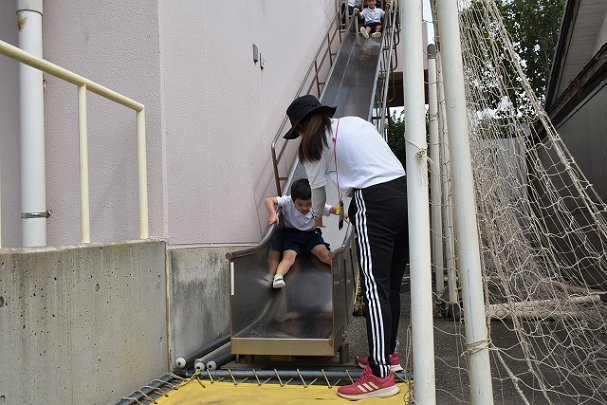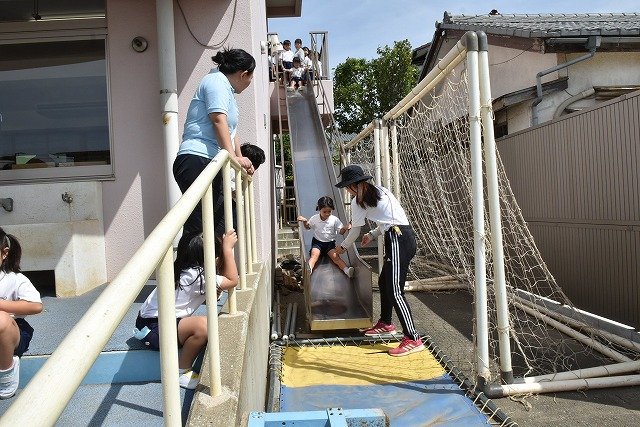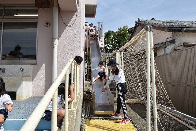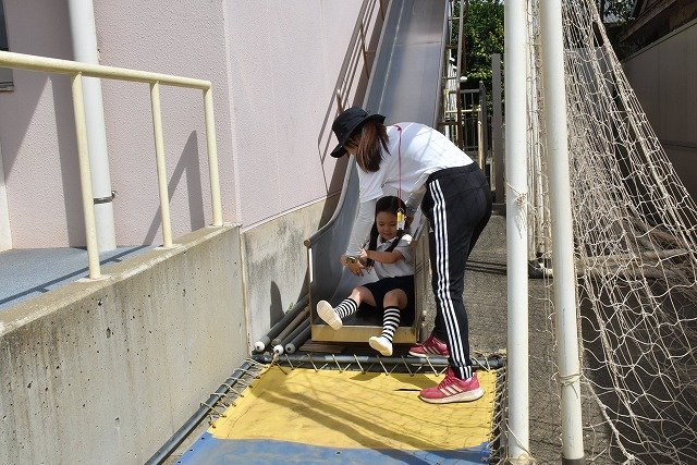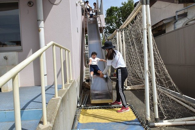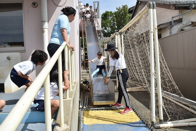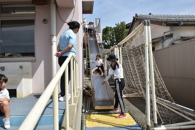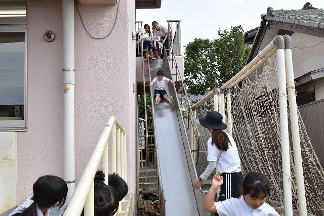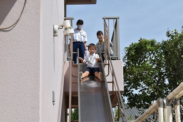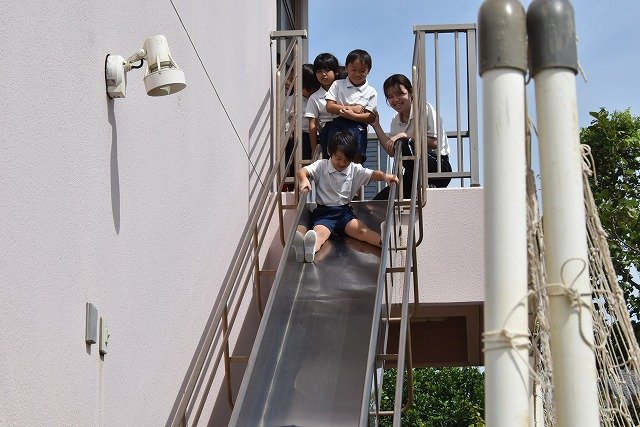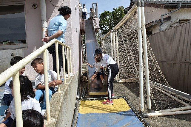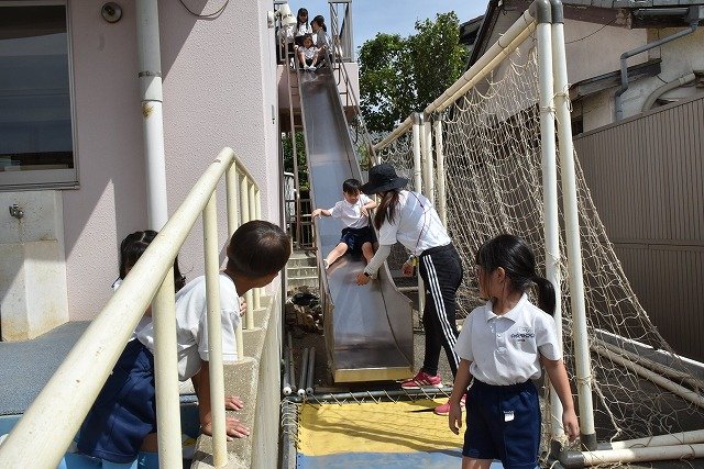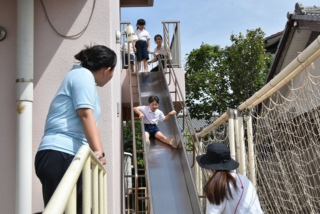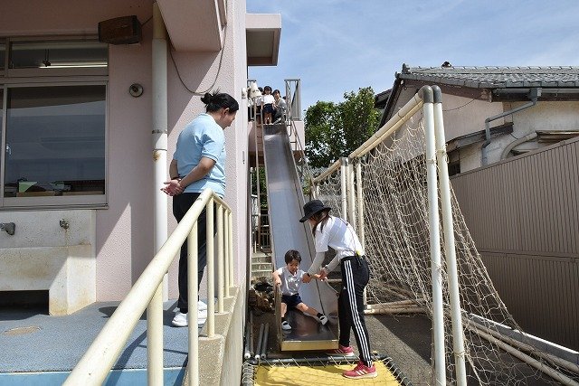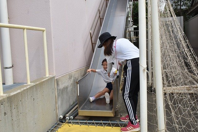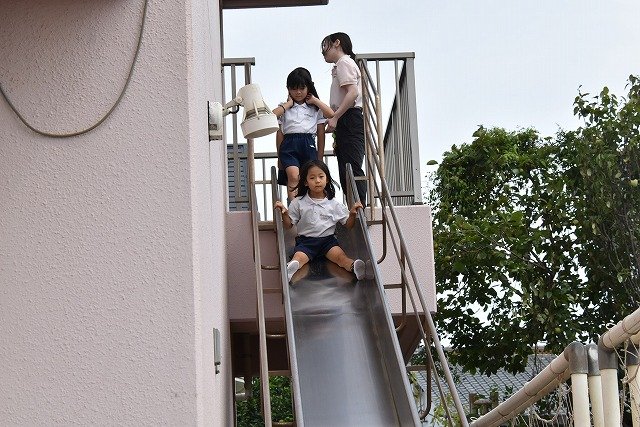 年長組のお友達が避難用滑り台を使って避難する練習を行いました。