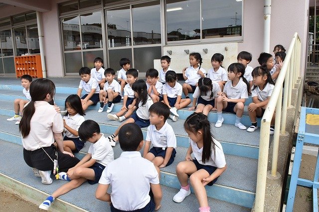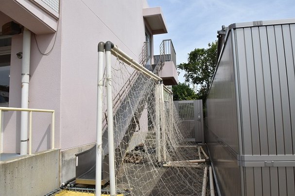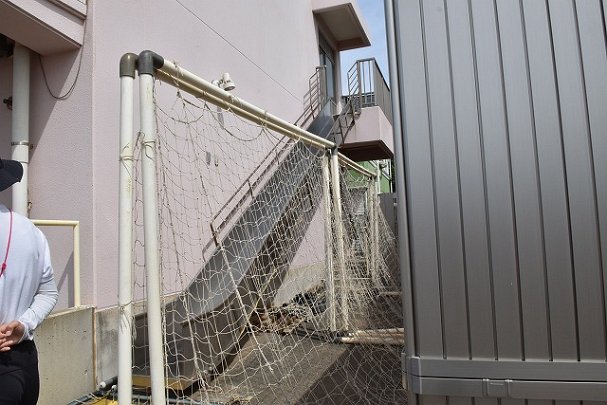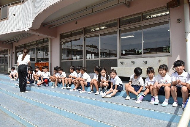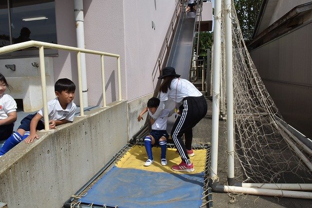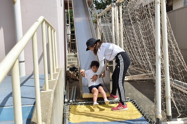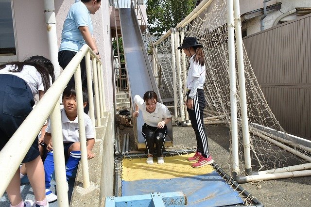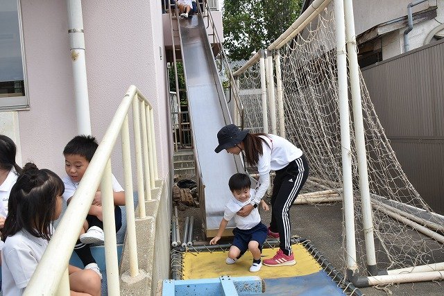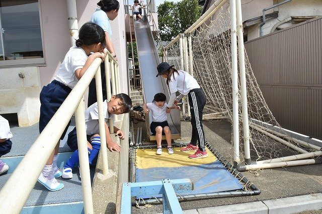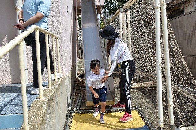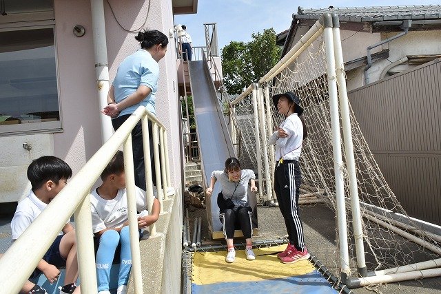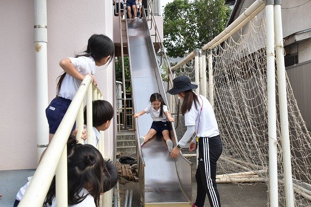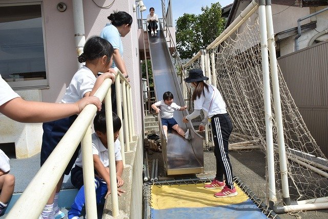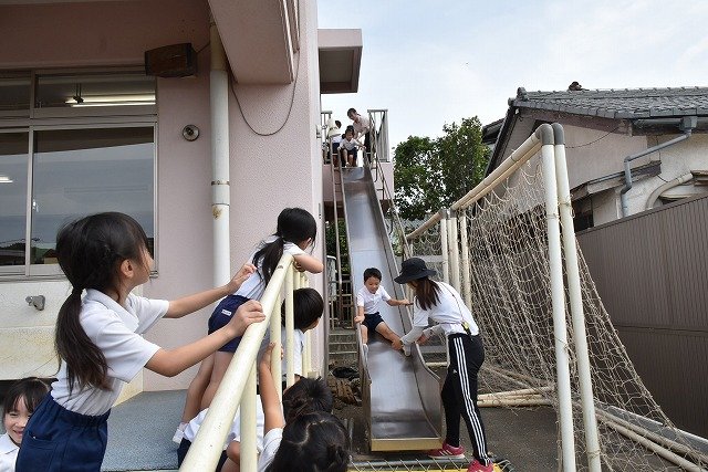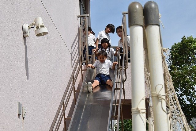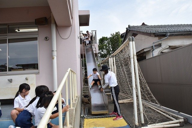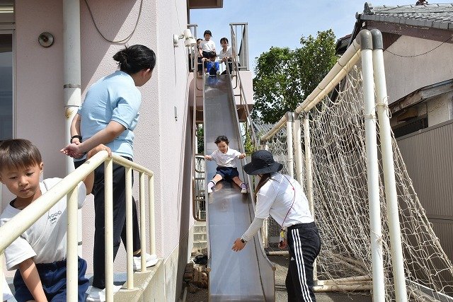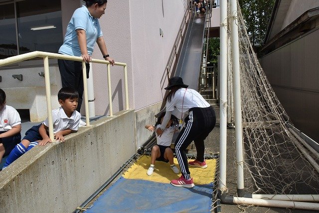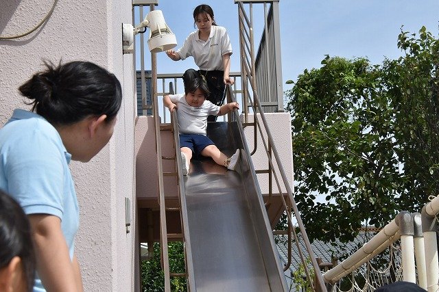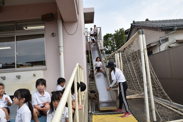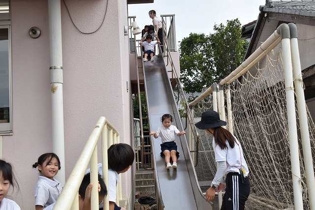 年長組のお友達が避難用滑り台を使って避難する練習を行いました。