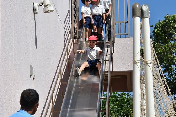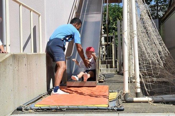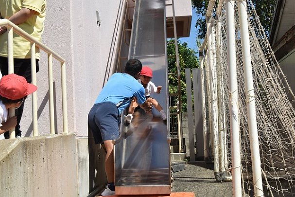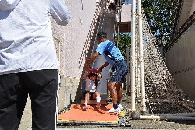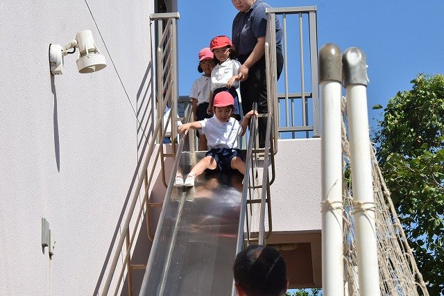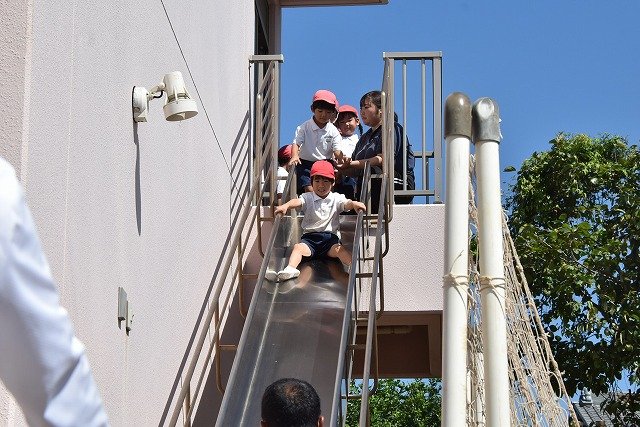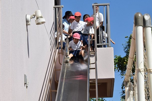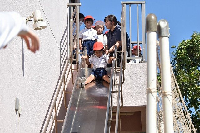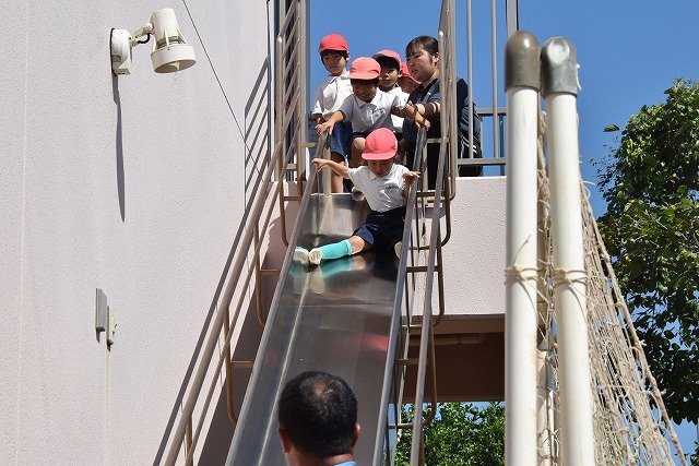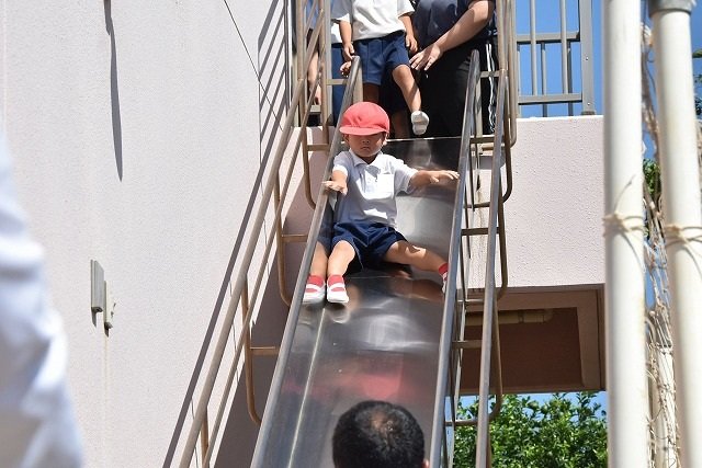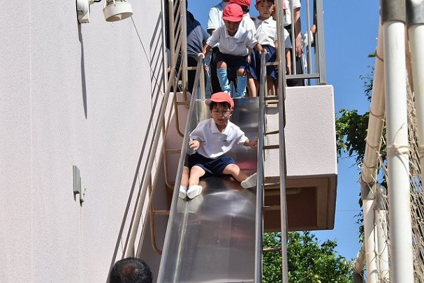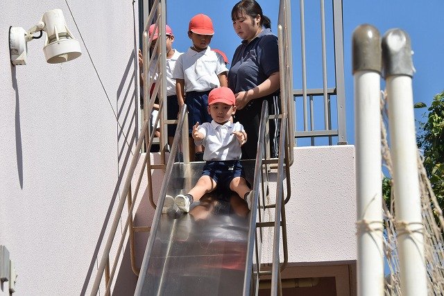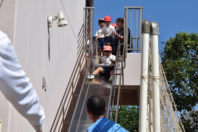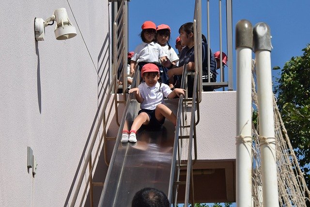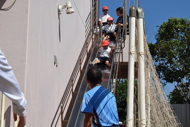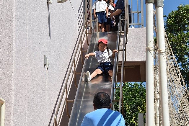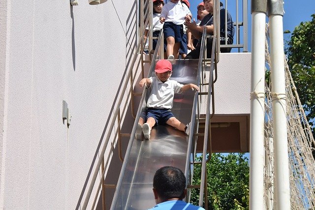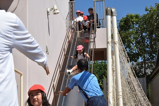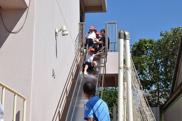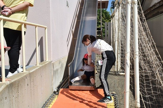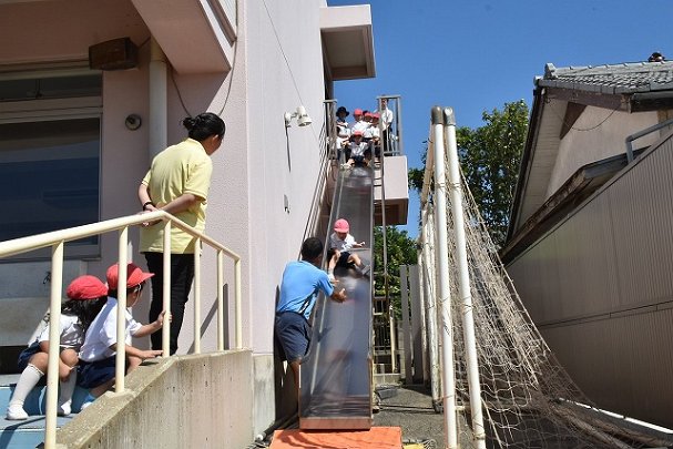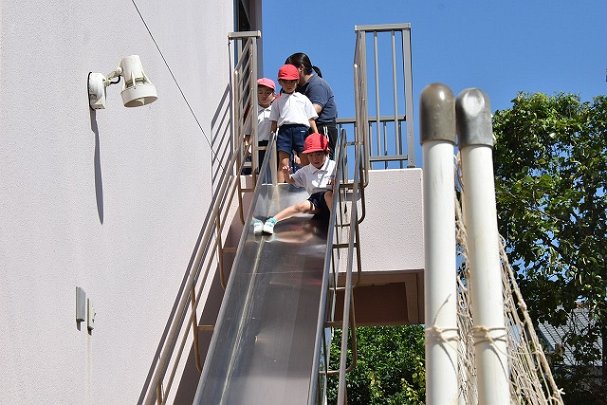 年中組のお友達が避難用滑り台を使って避難する練習を行いました。