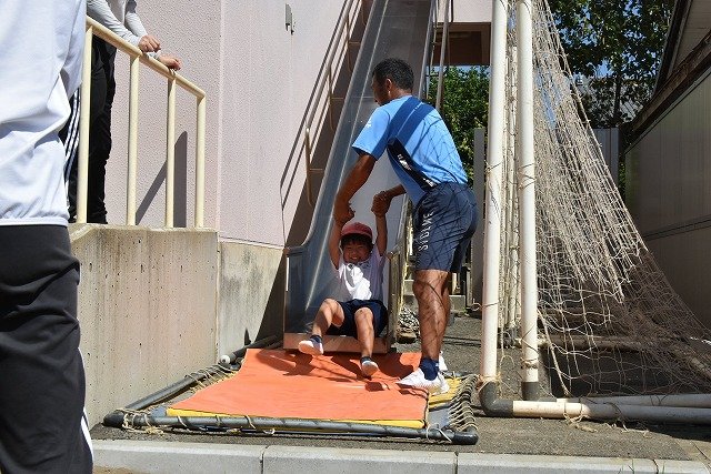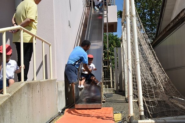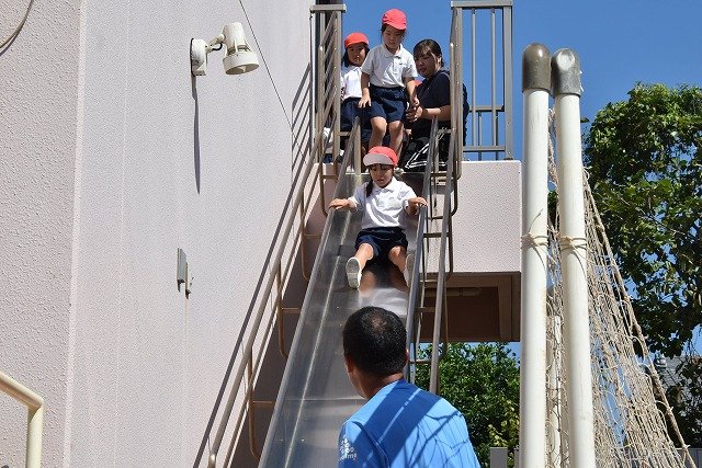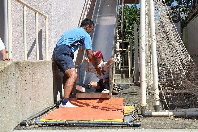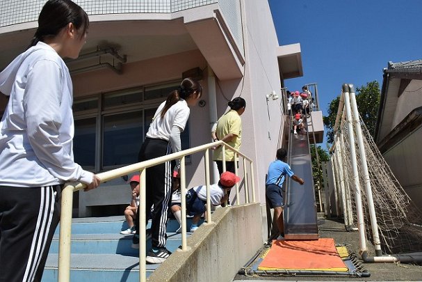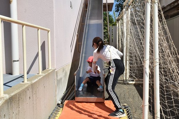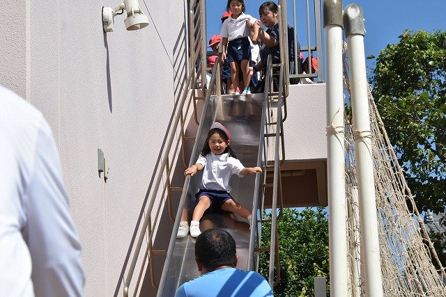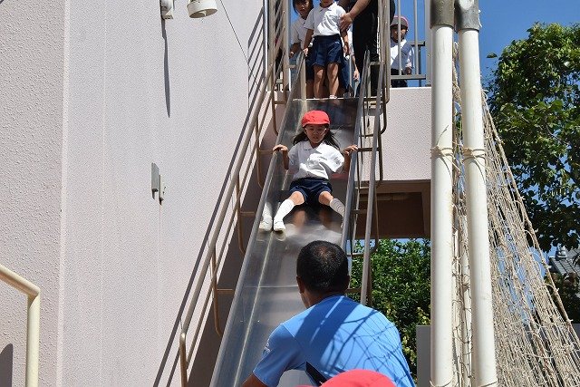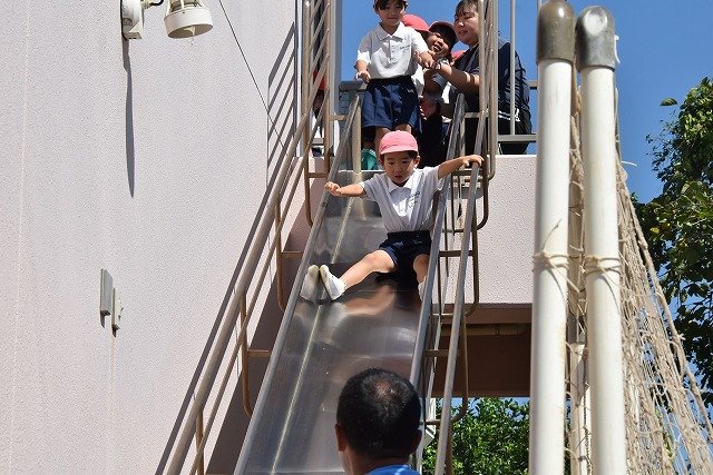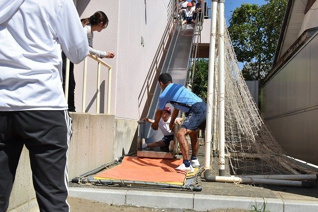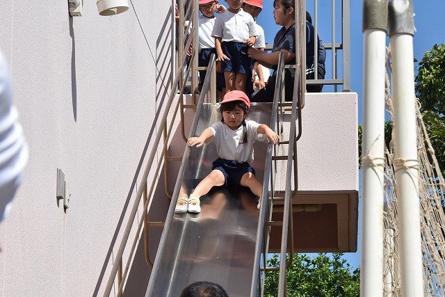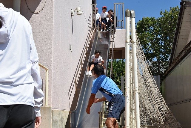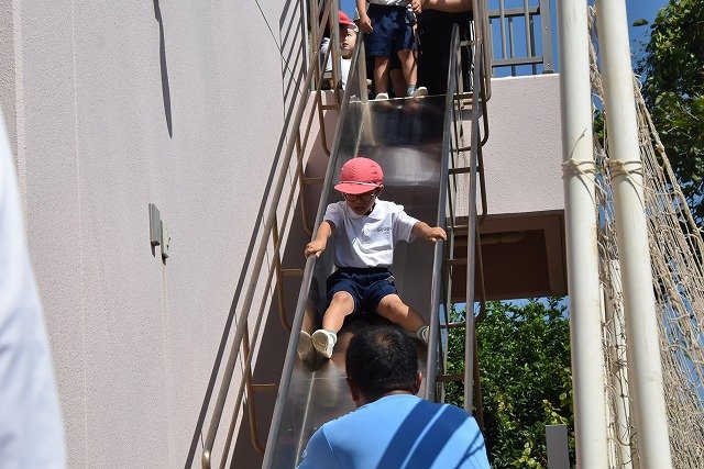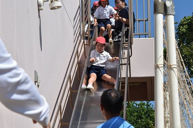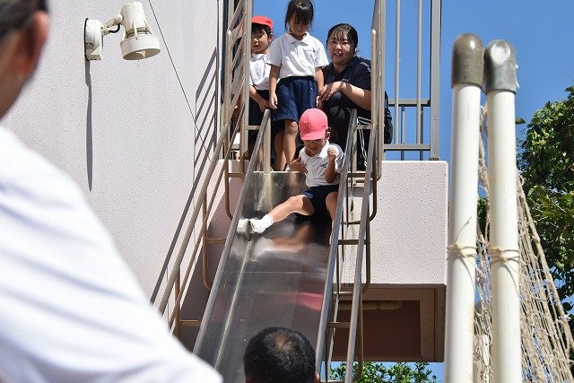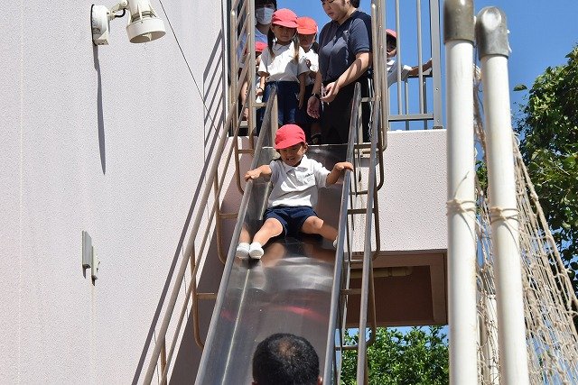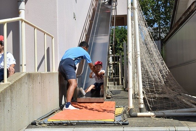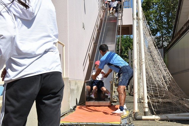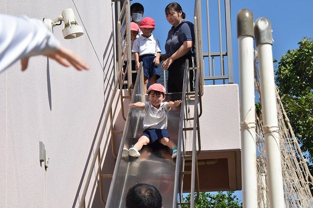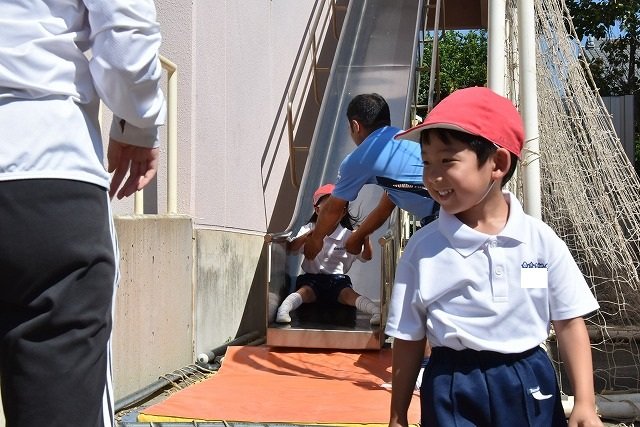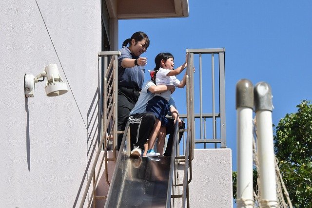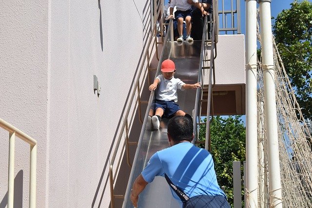 年中組のお友達が避難用滑り台を使って避難する練習を行いました。