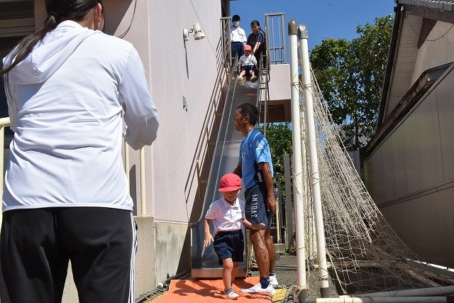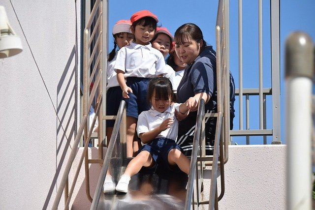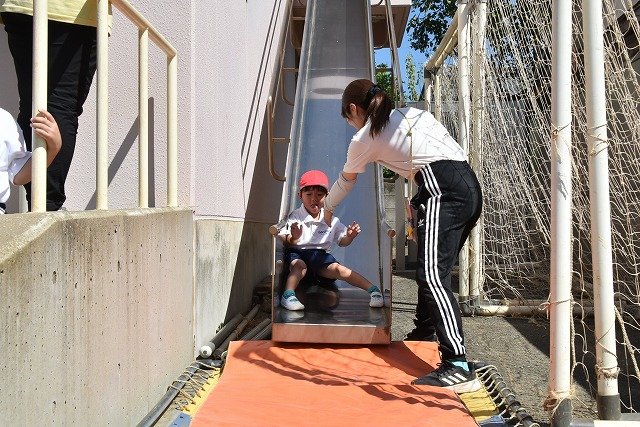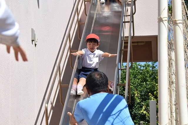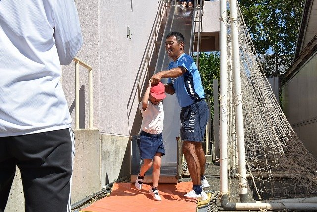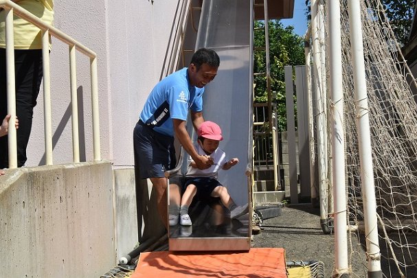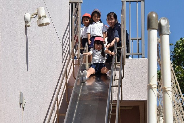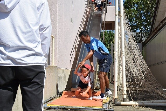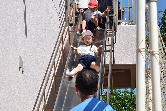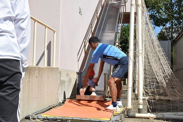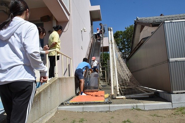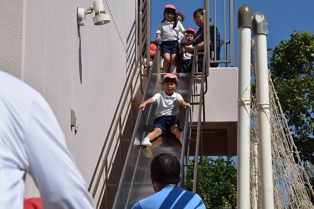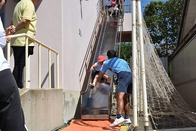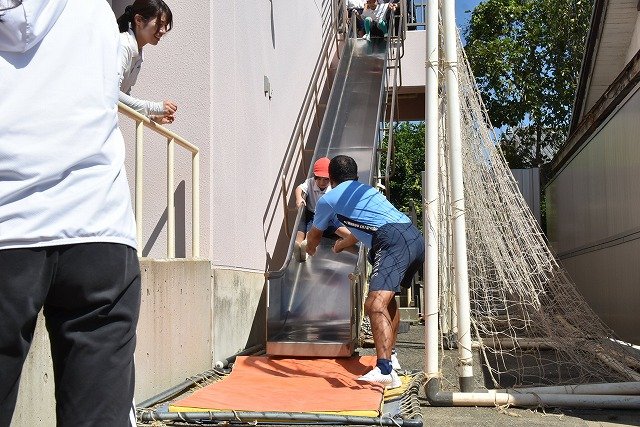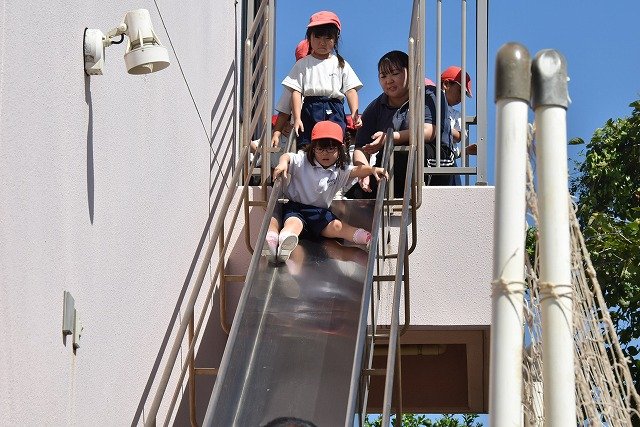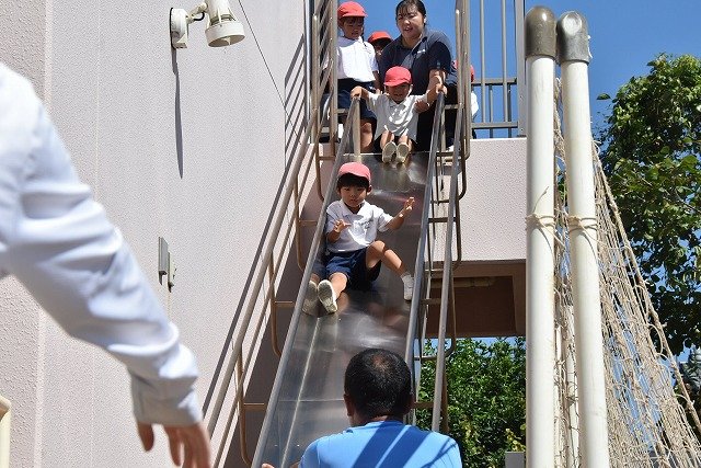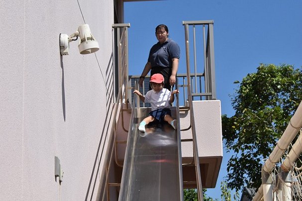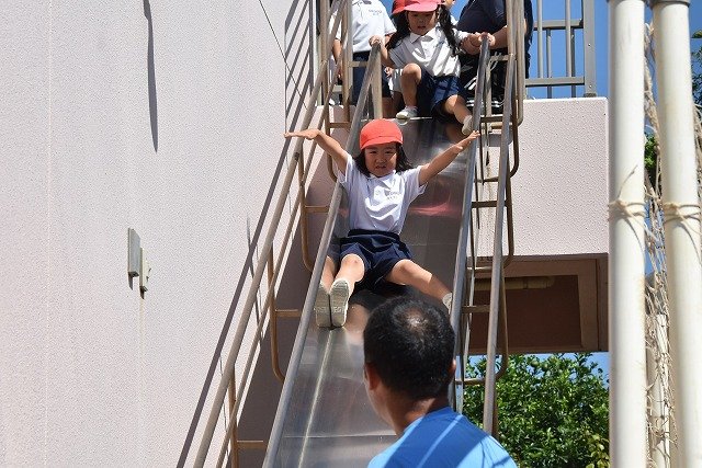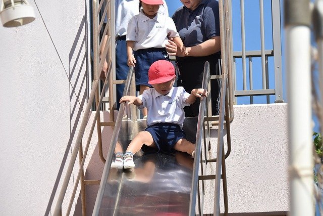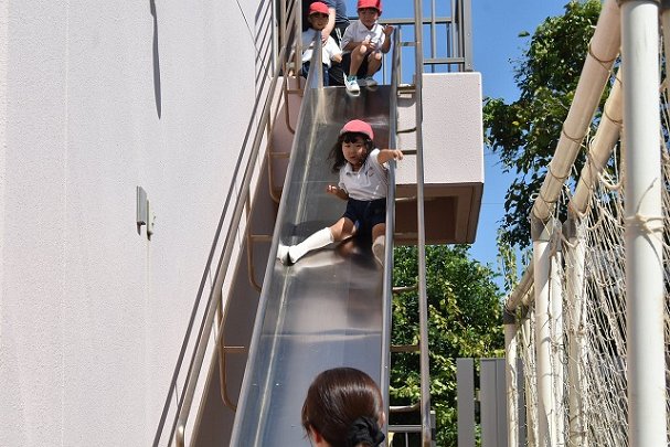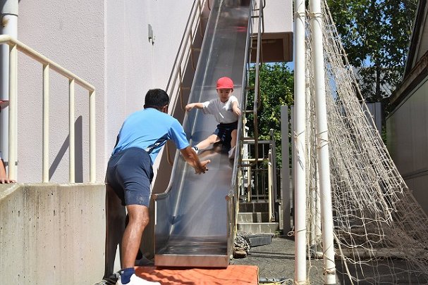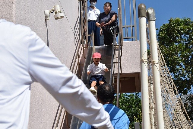 年中組のお友達が避難用滑り台を使って避難する練習を行いました。