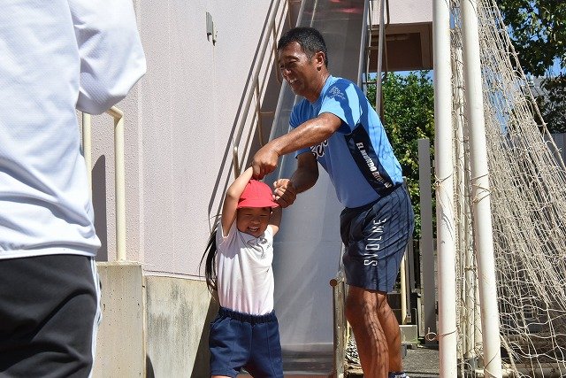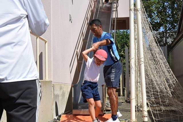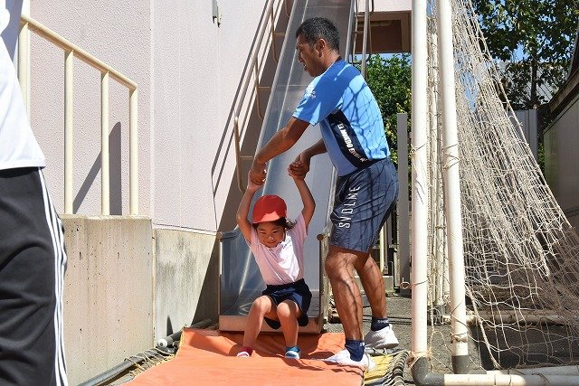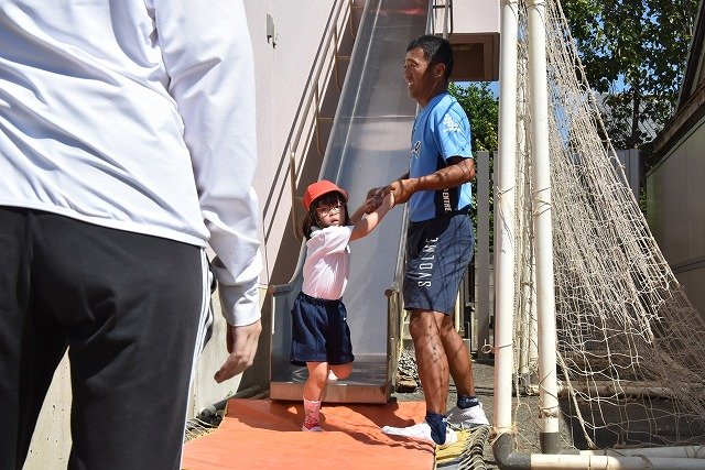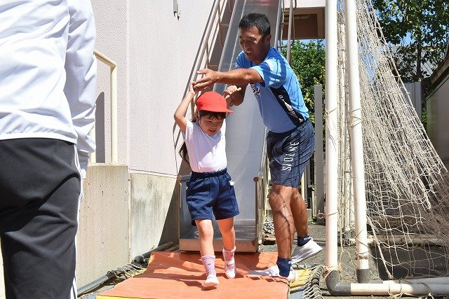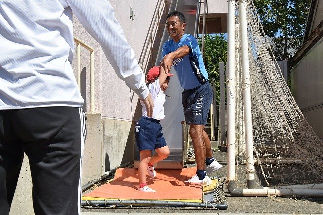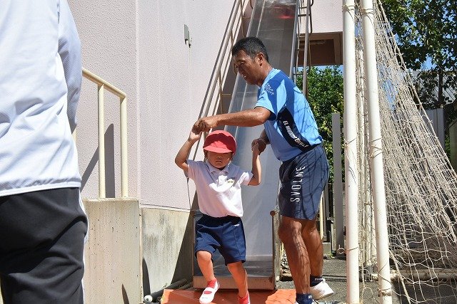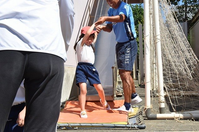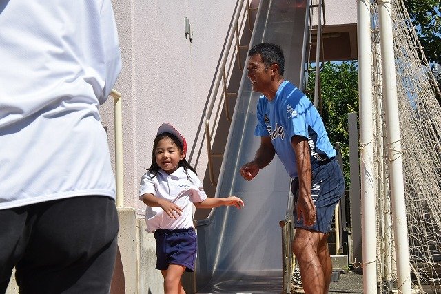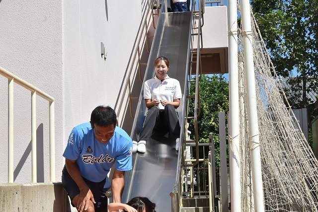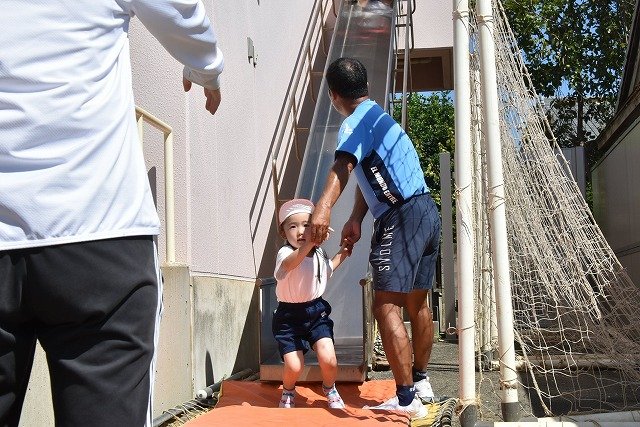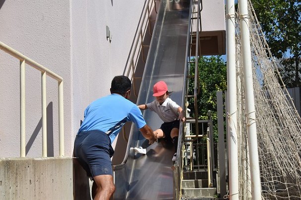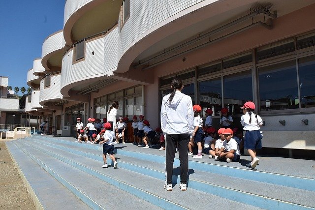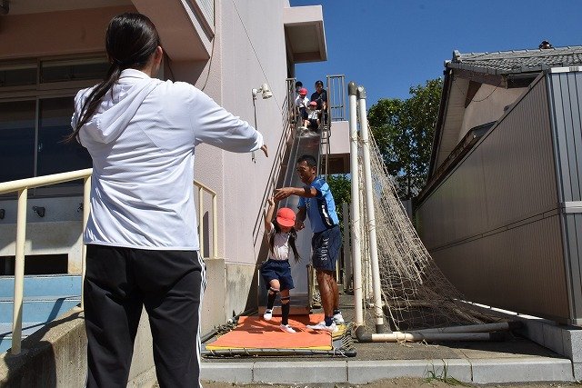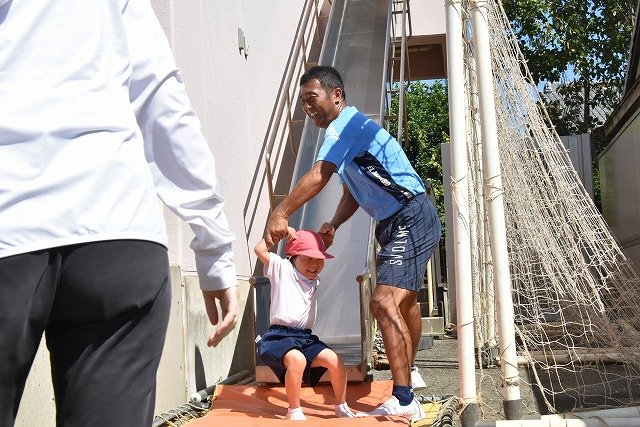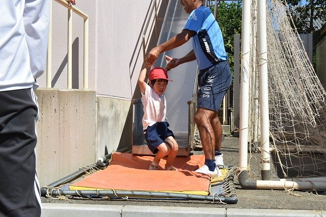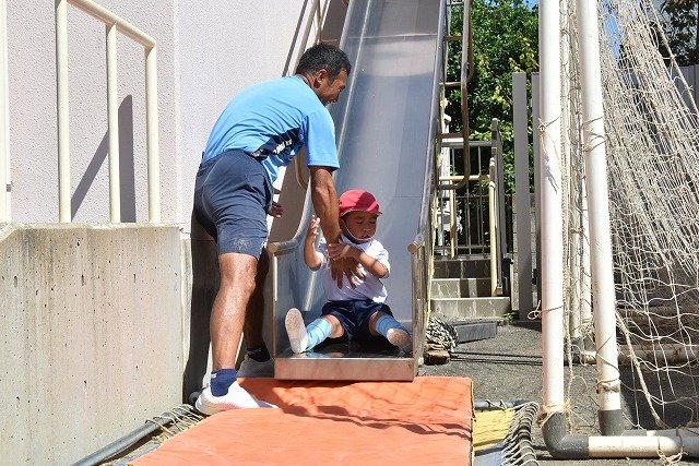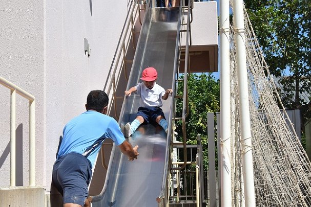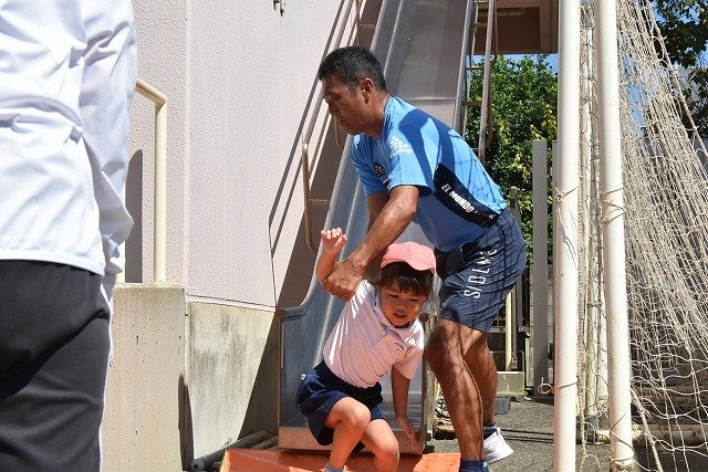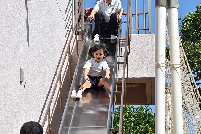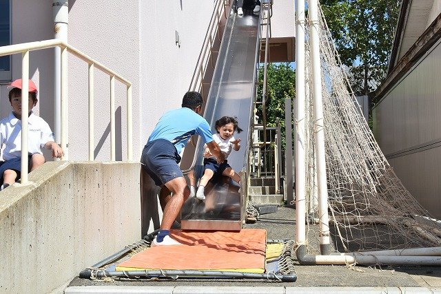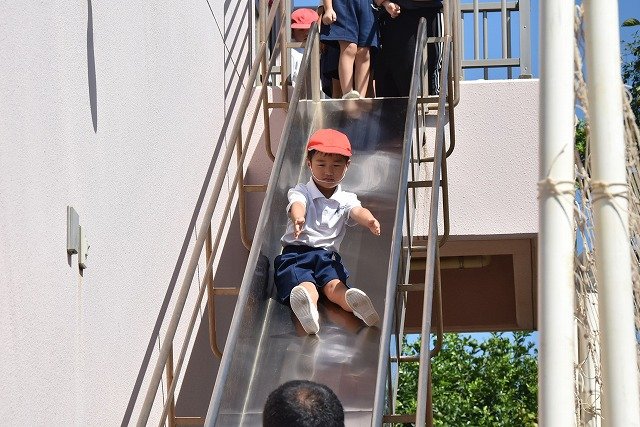 年中組のお友達が避難用滑り台を使って避難する練習を行いました。