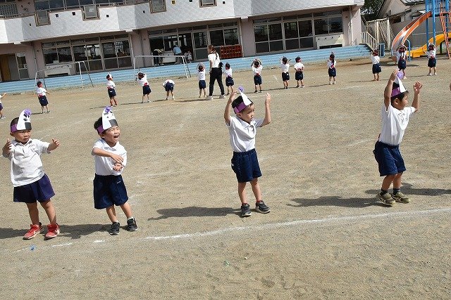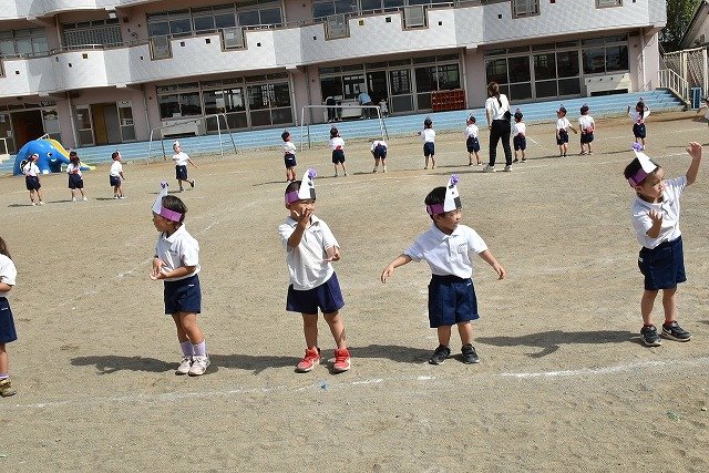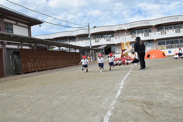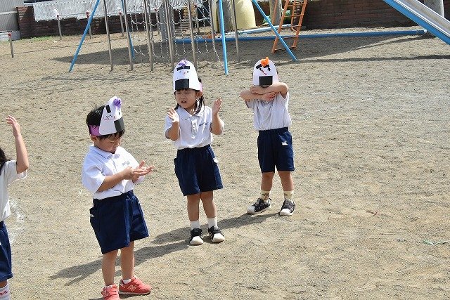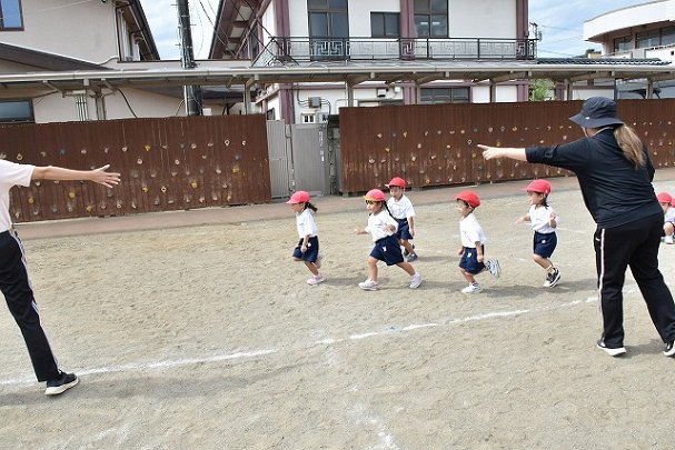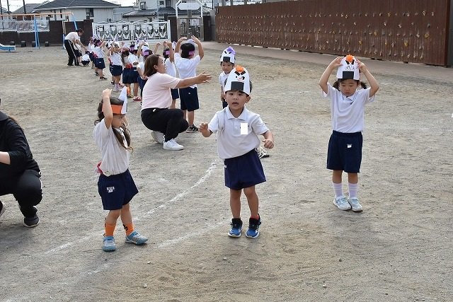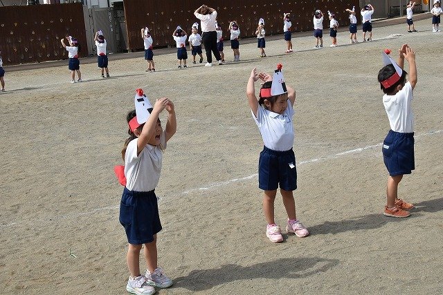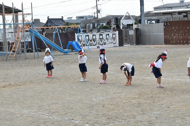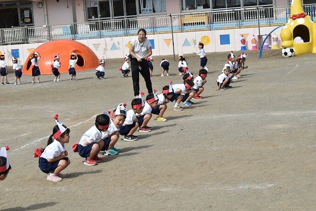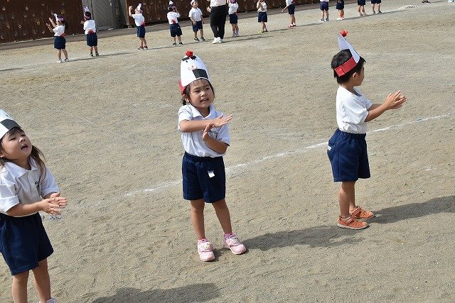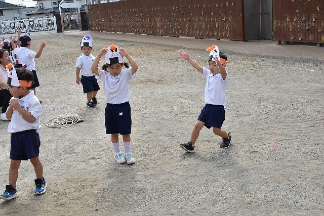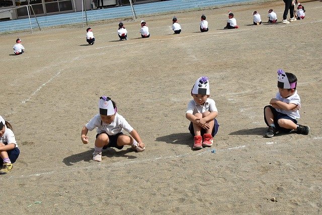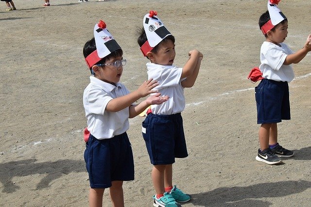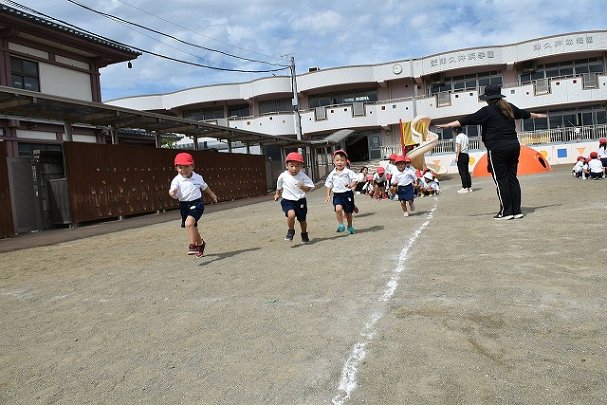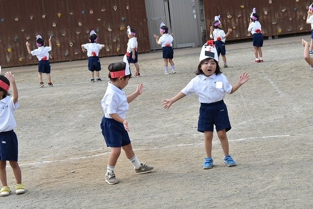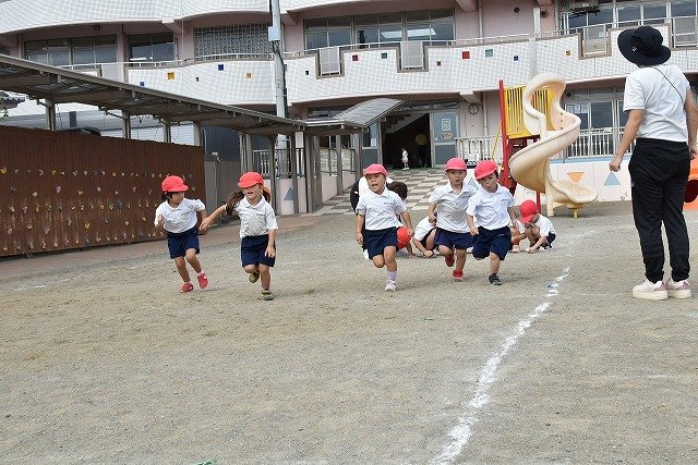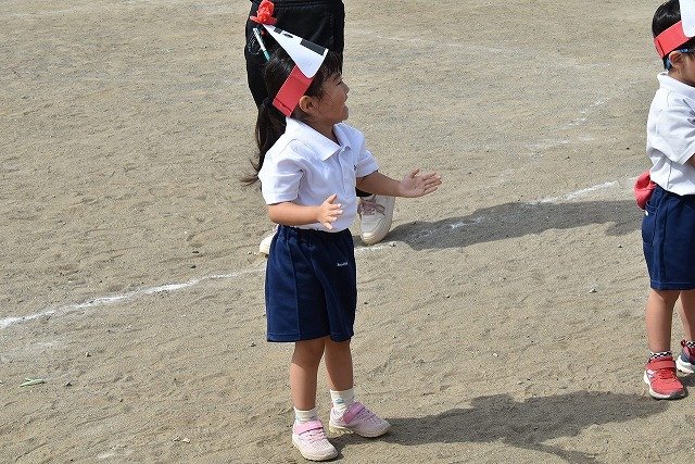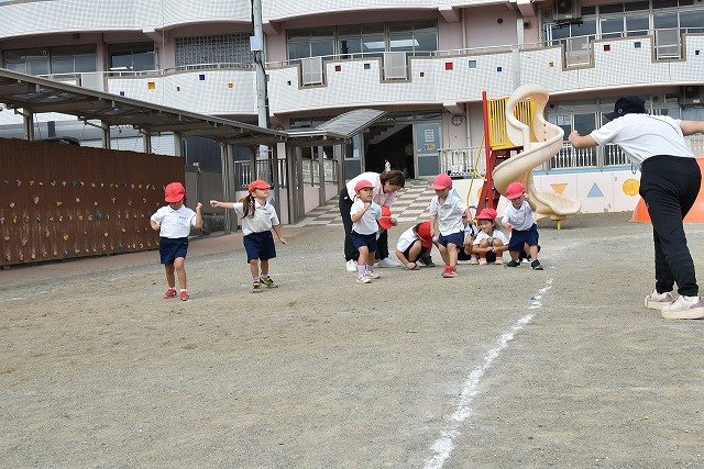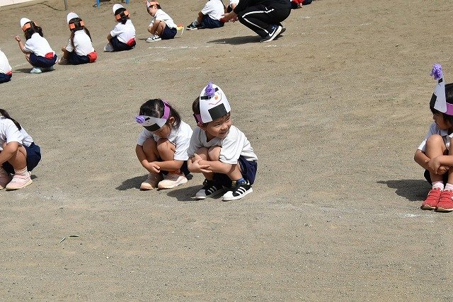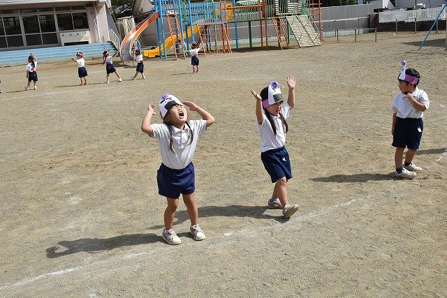 年少組 徒競走の練習とあいうえおにぎりを踊りました。