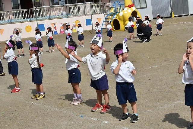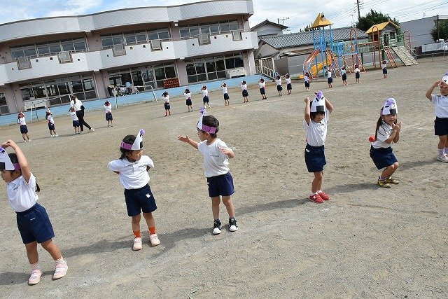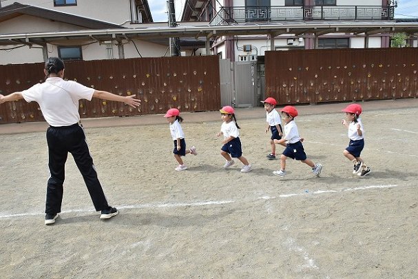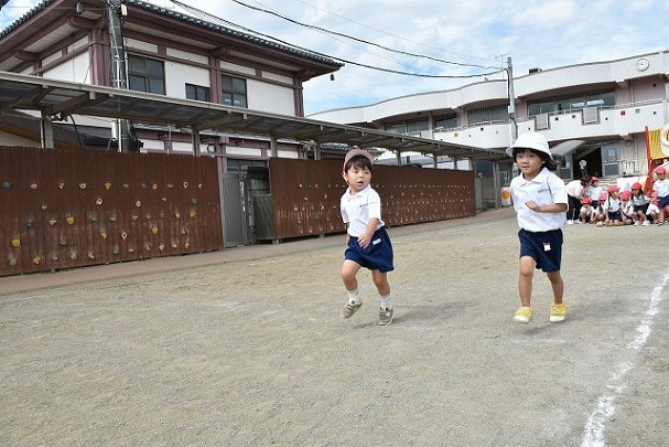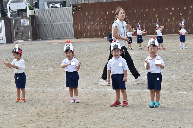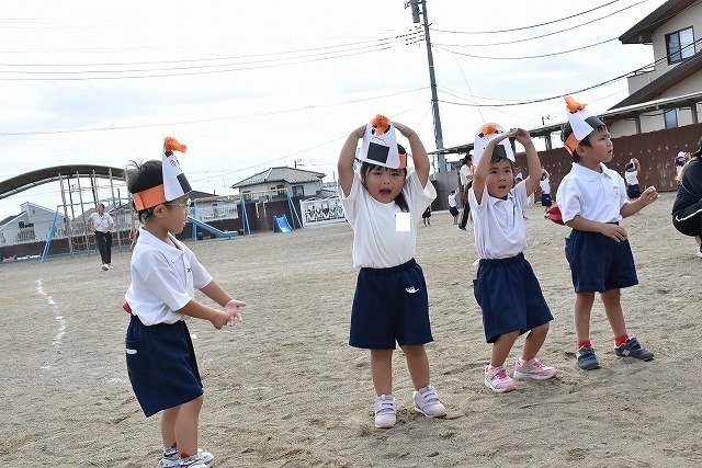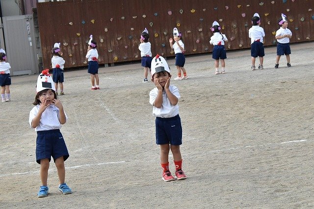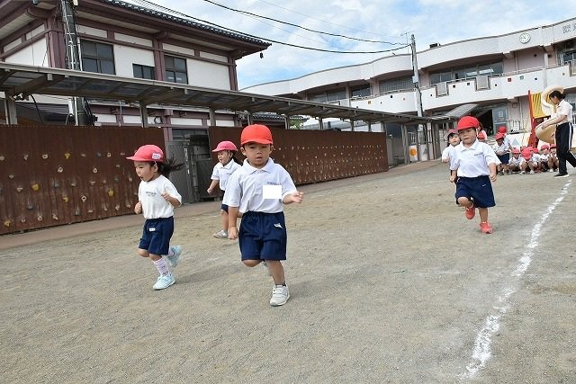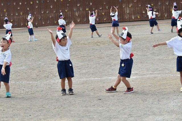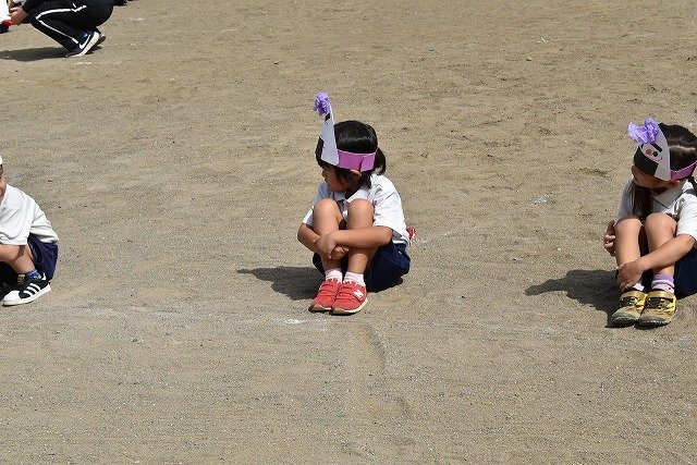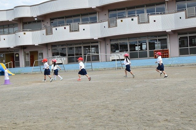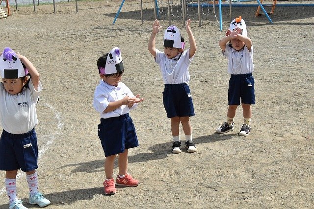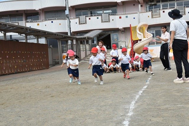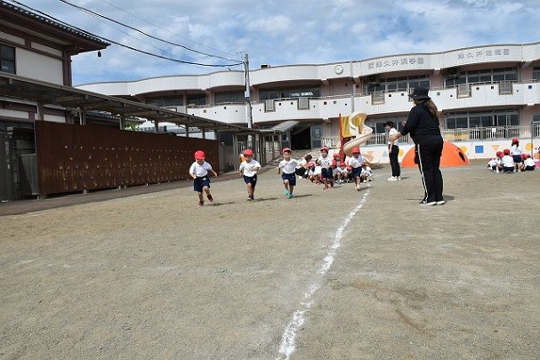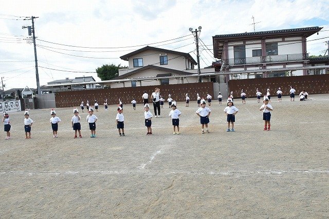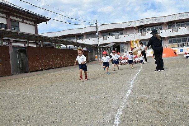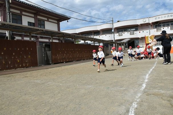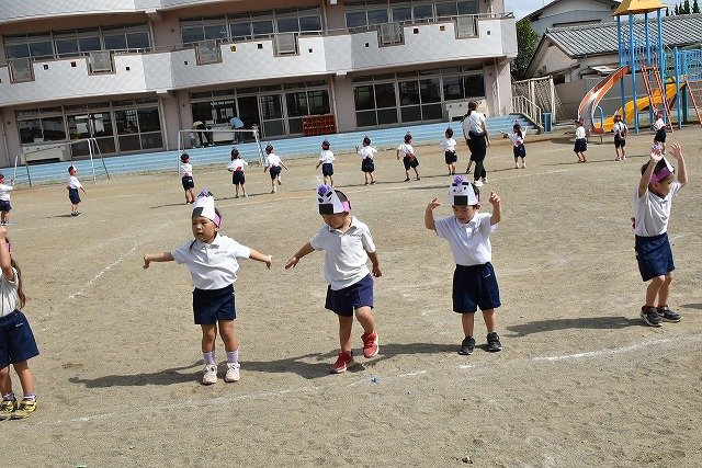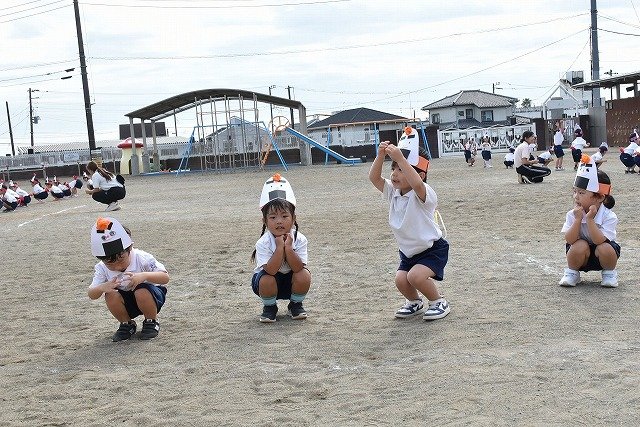 年少組 徒競走の練習とあいうえおにぎりを踊りました。