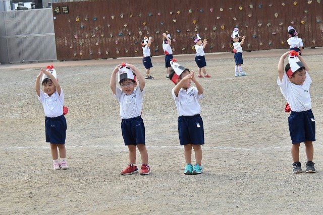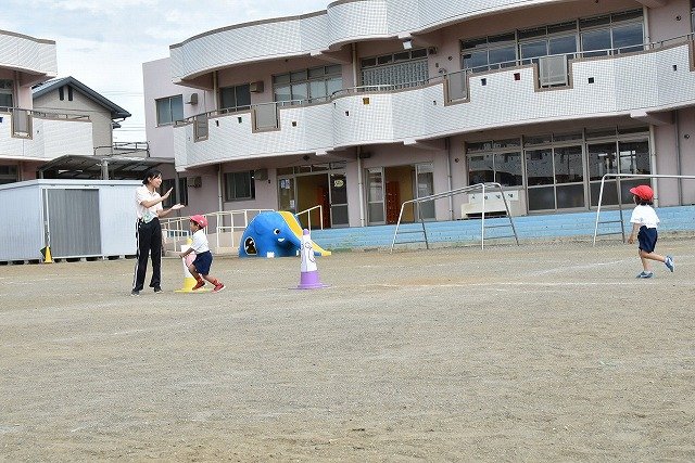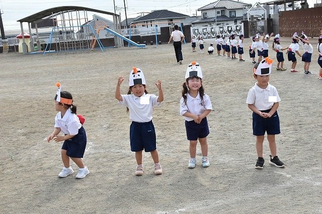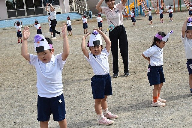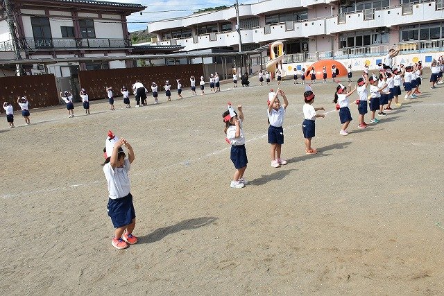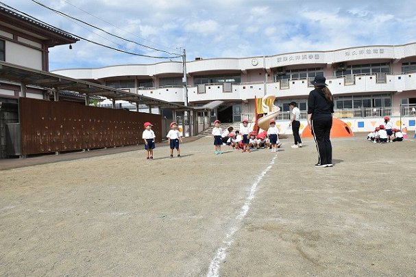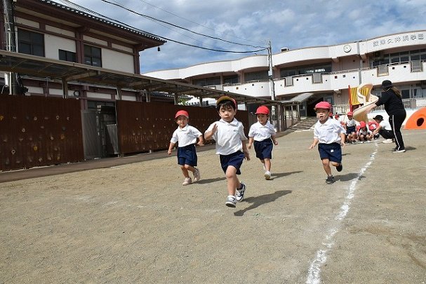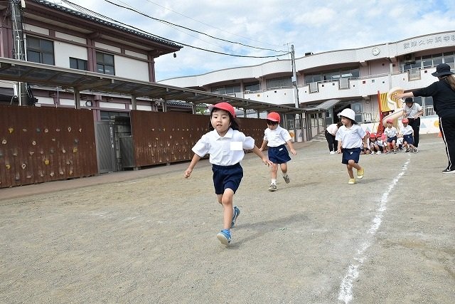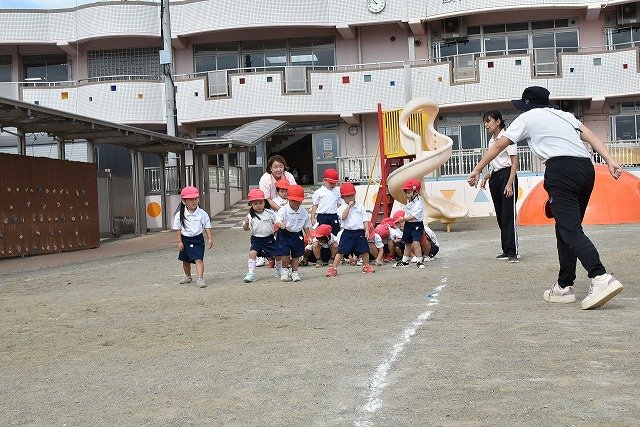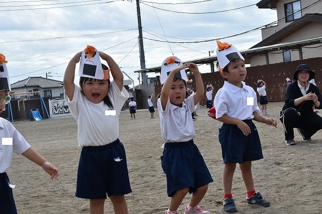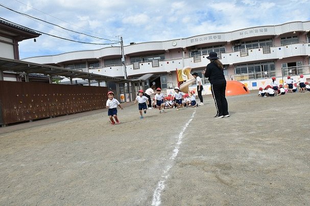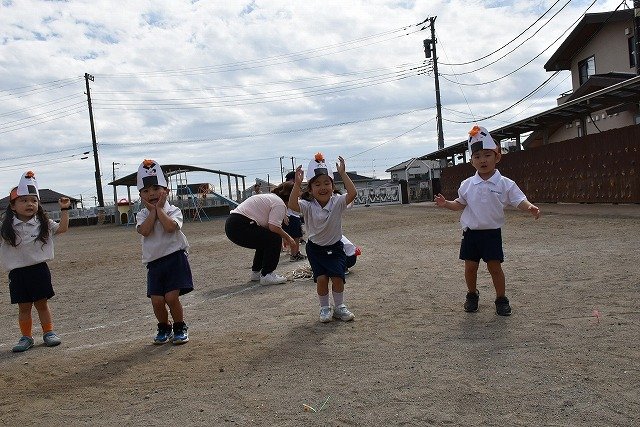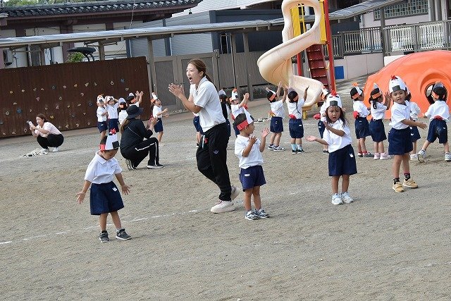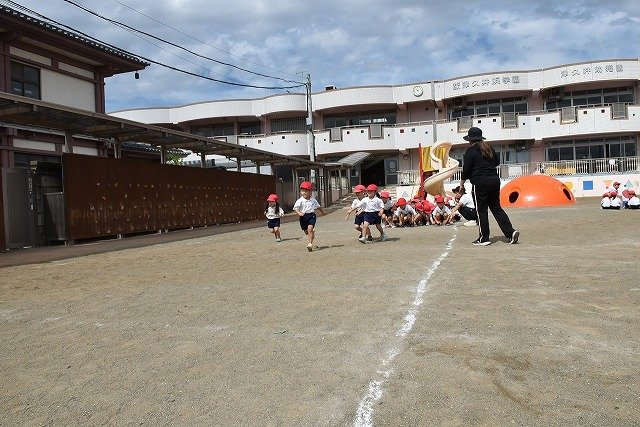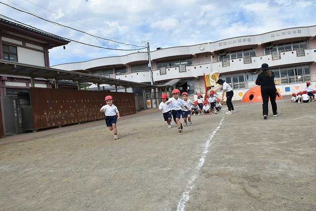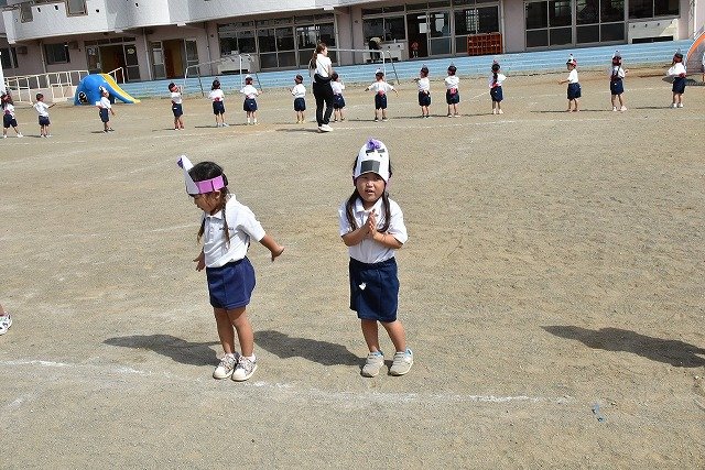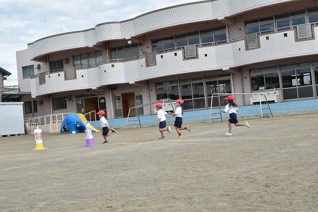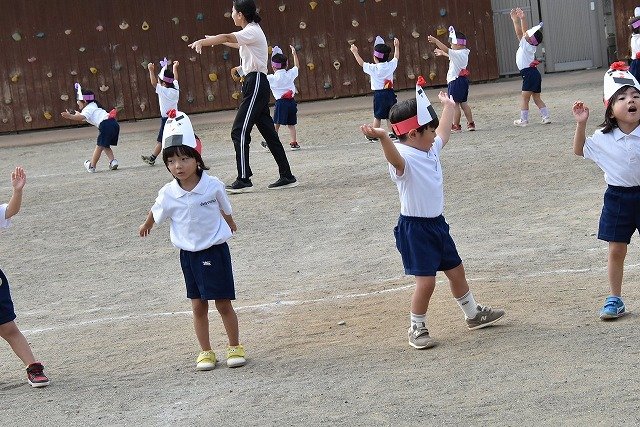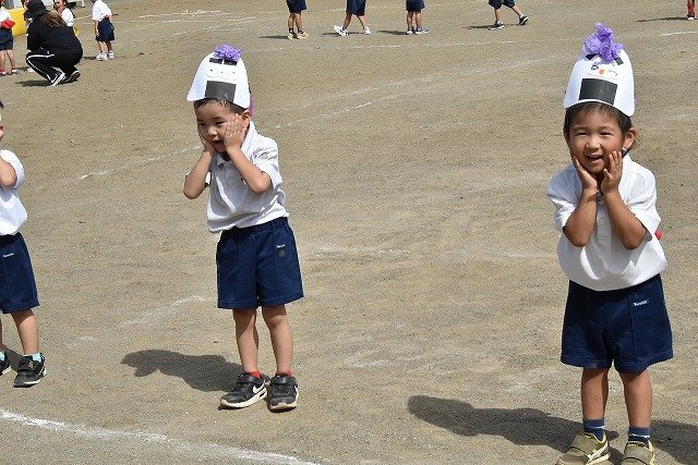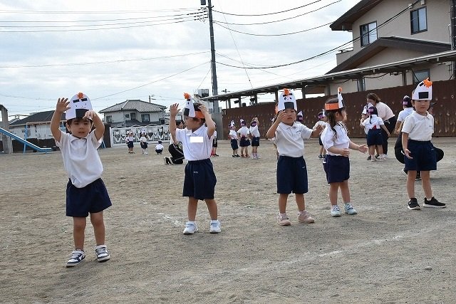 年少組 徒競走の練習とあいうえおにぎりを踊りました。