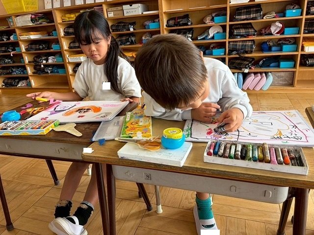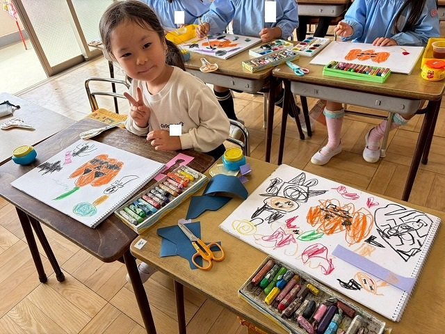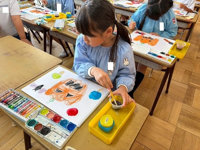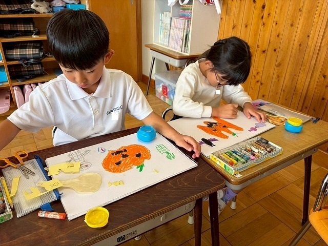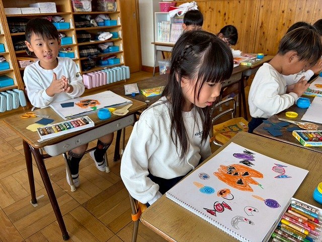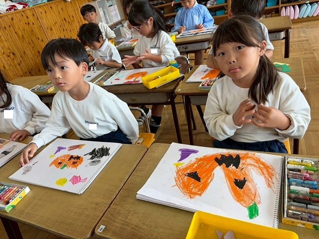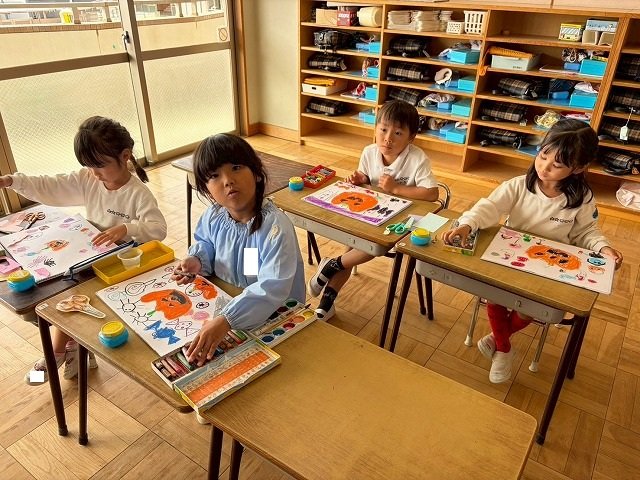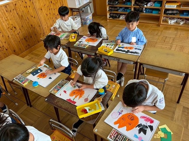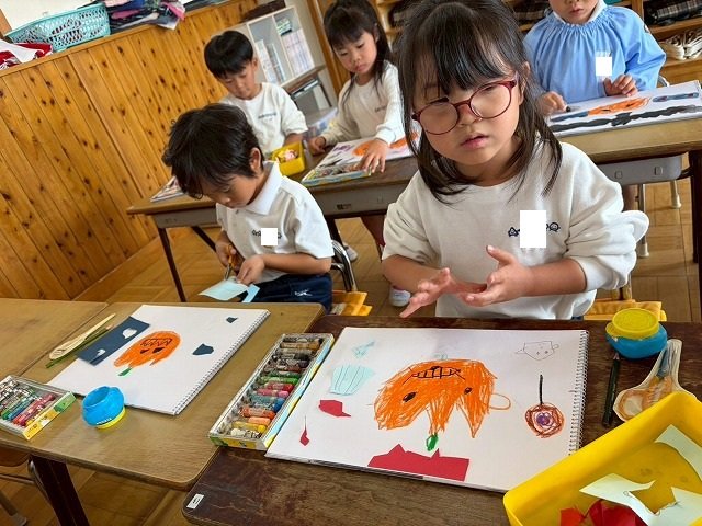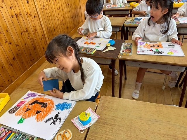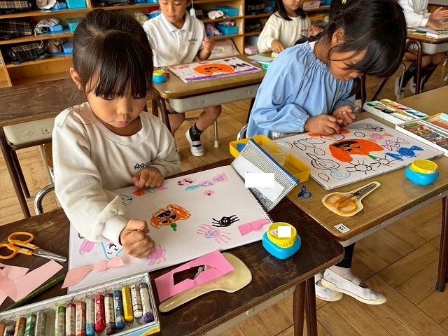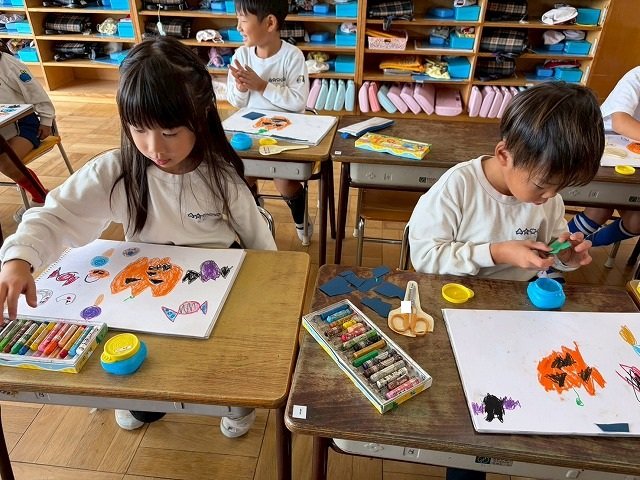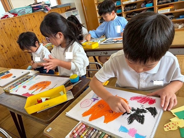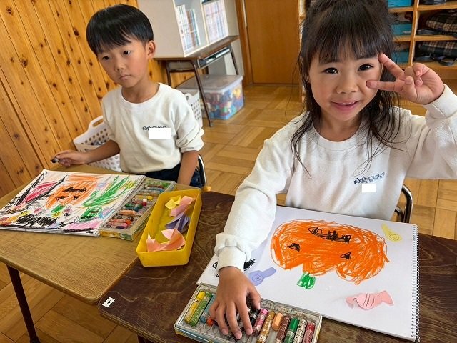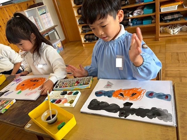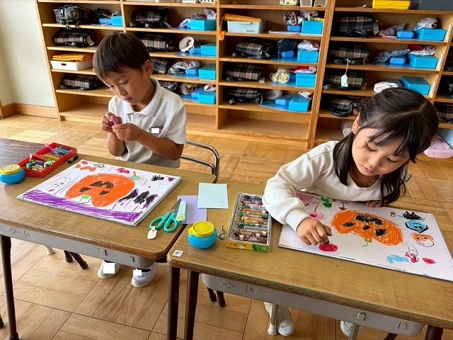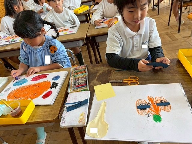 年長組 色画用紙をハサミで切ってのりで貼ったり、ケークカラーで色塗りしたり、思い思いのハロウィンの絵を描きました