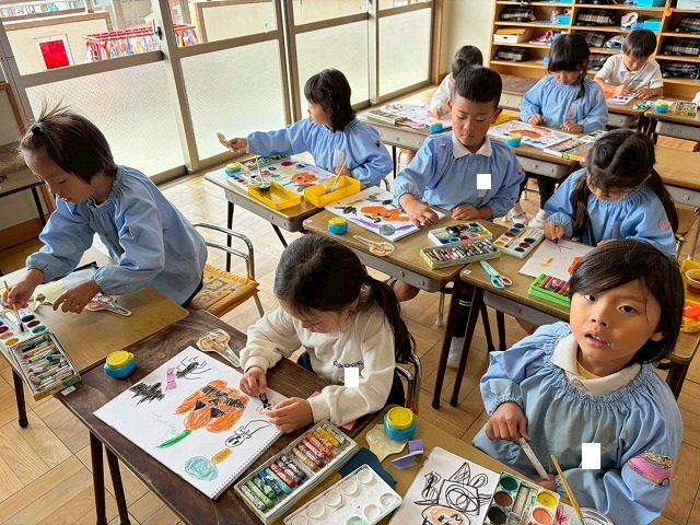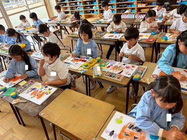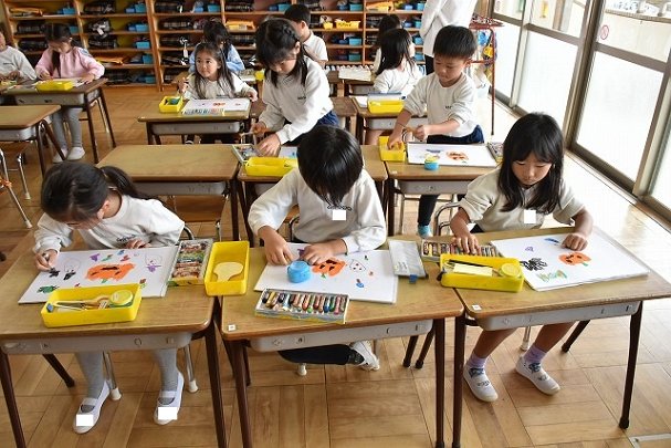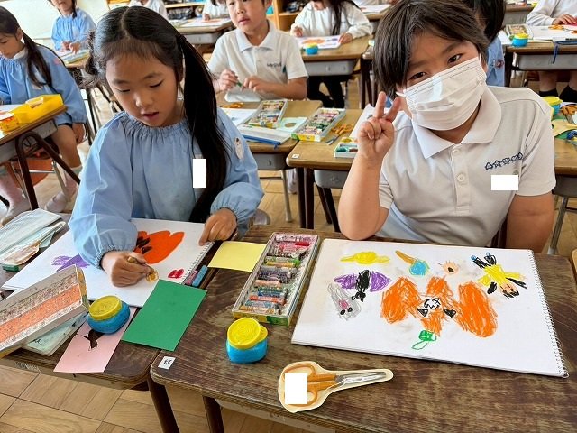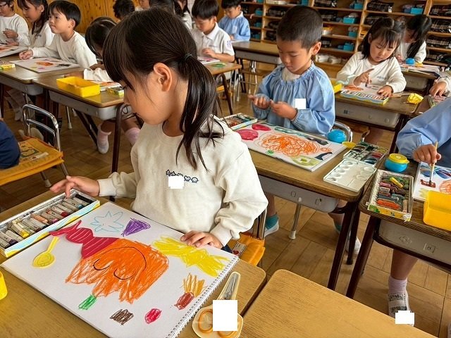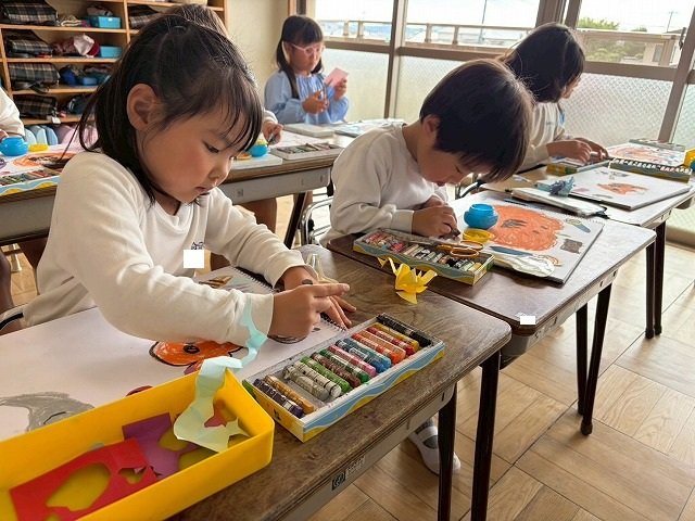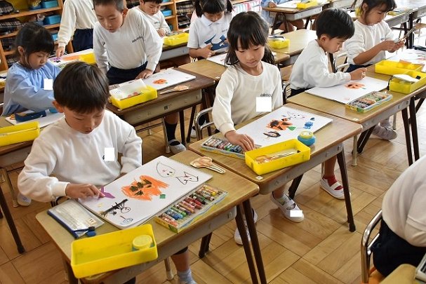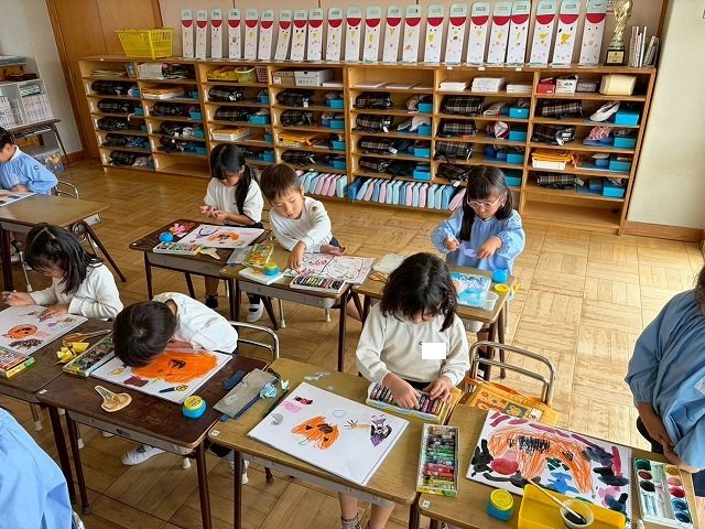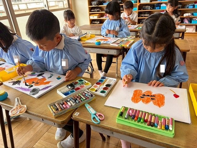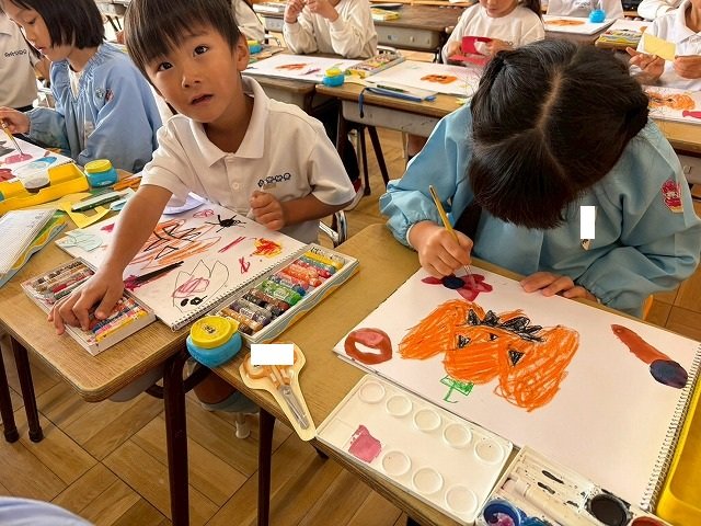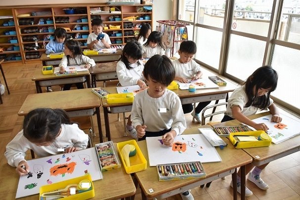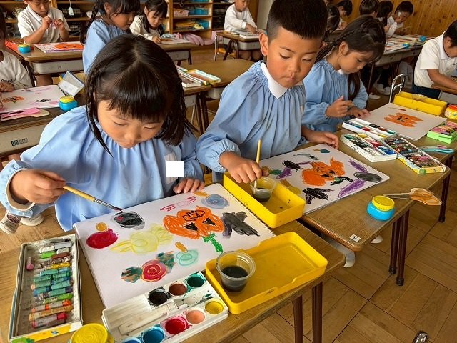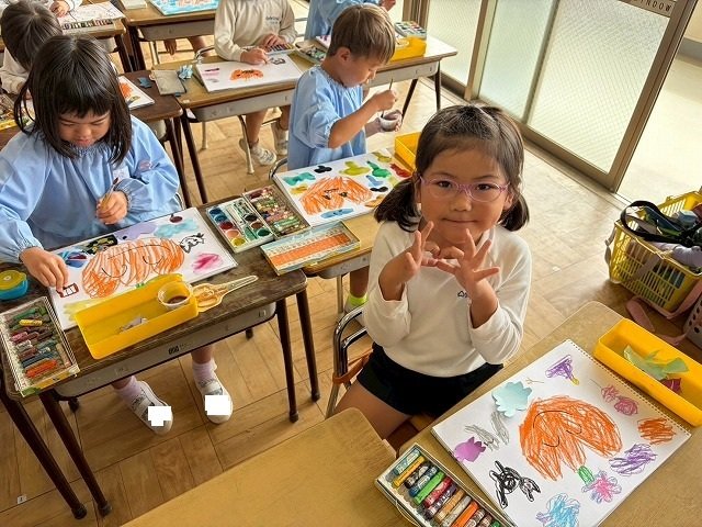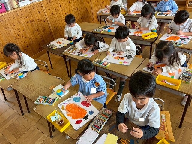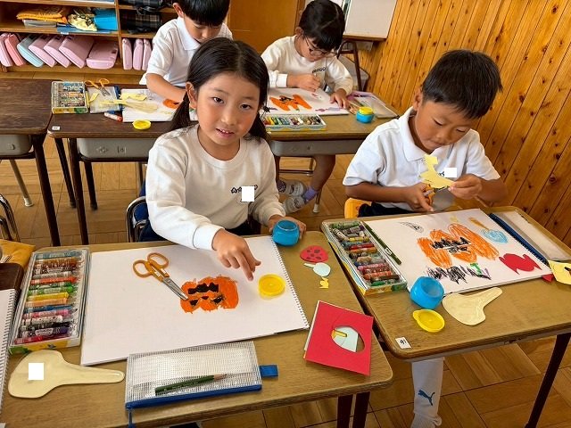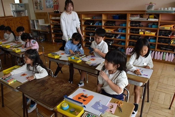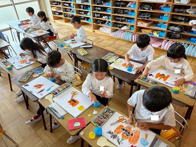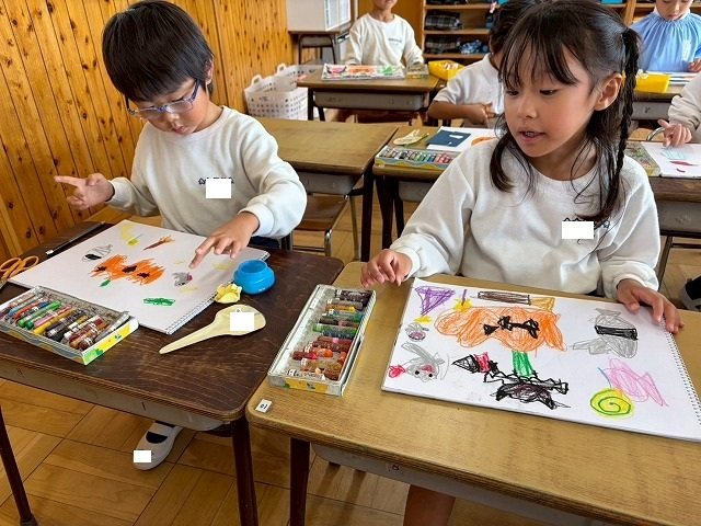 年長組 色画用紙をハサミで切ってのりで貼ったり、ケークカラーで色塗りしたり、思い思いのハロウィンの絵を描きました