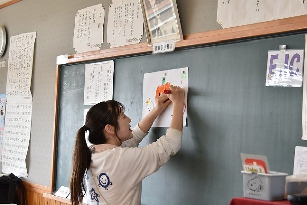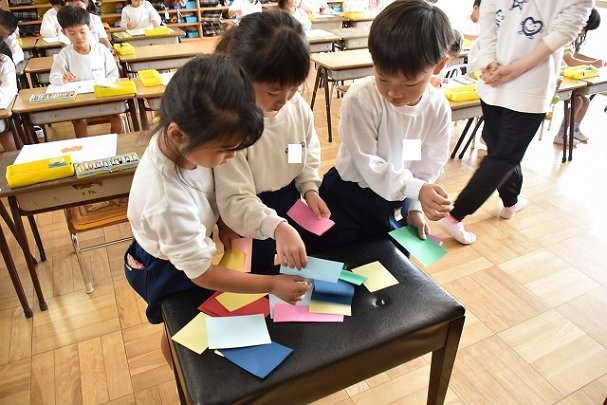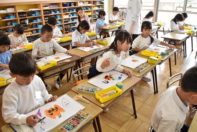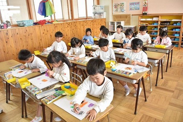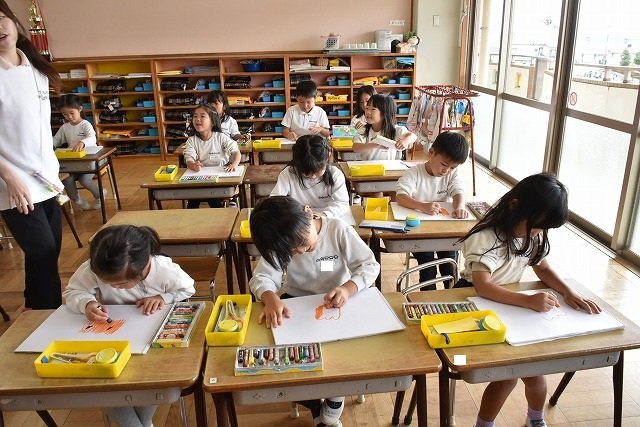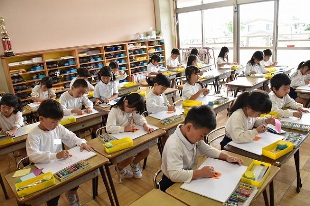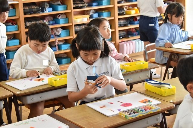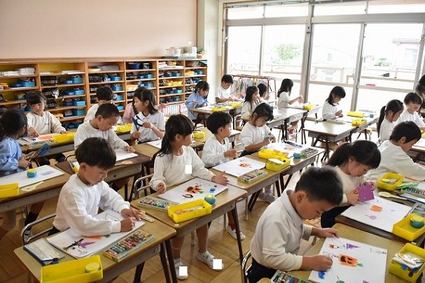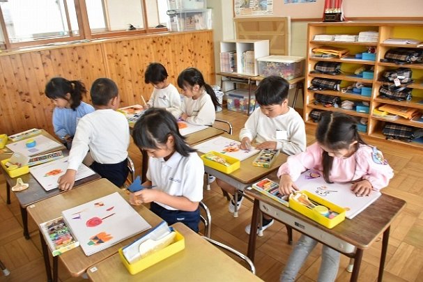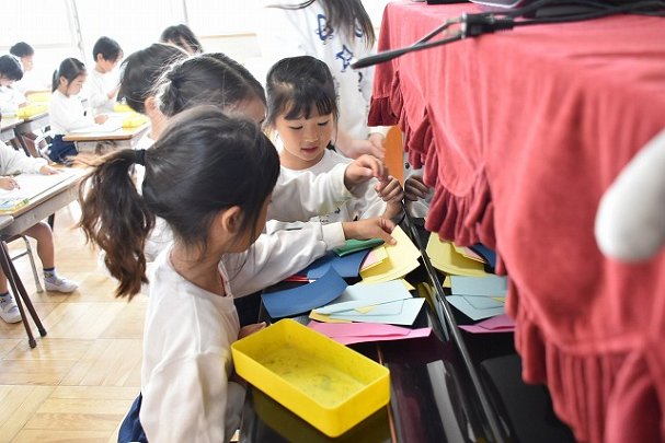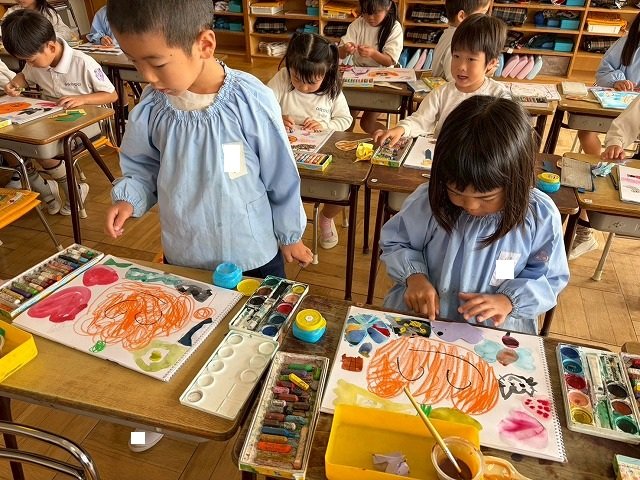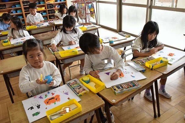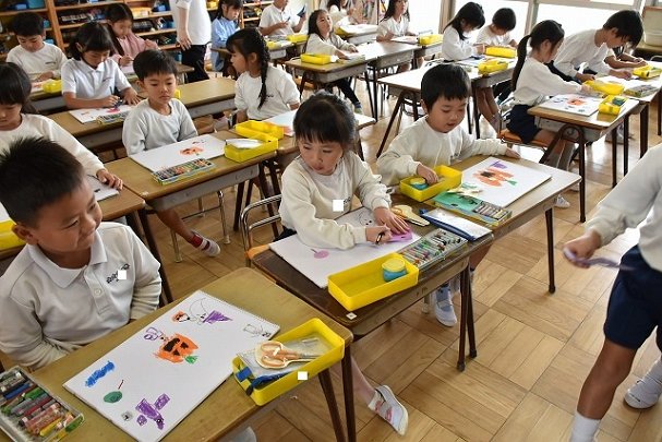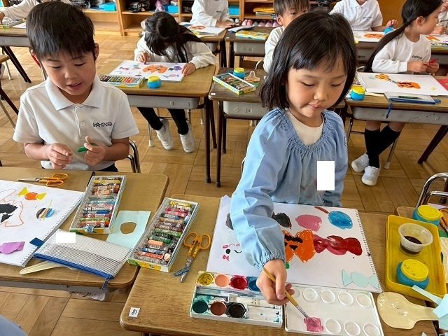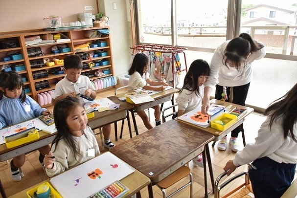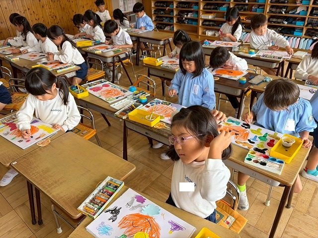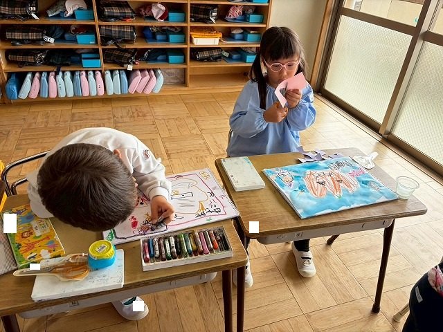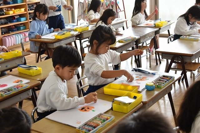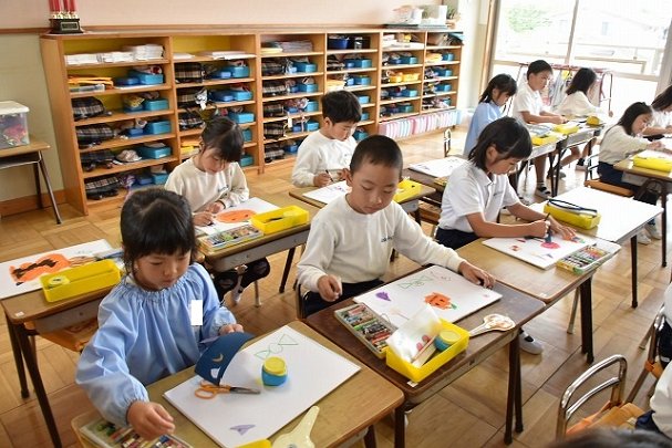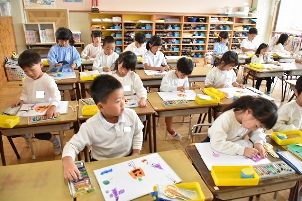 年長組 色画用紙をハサミで切ってのりで貼ったり、ケークカラーで色塗りしたり、思い思いのハロウィンの絵を描きました