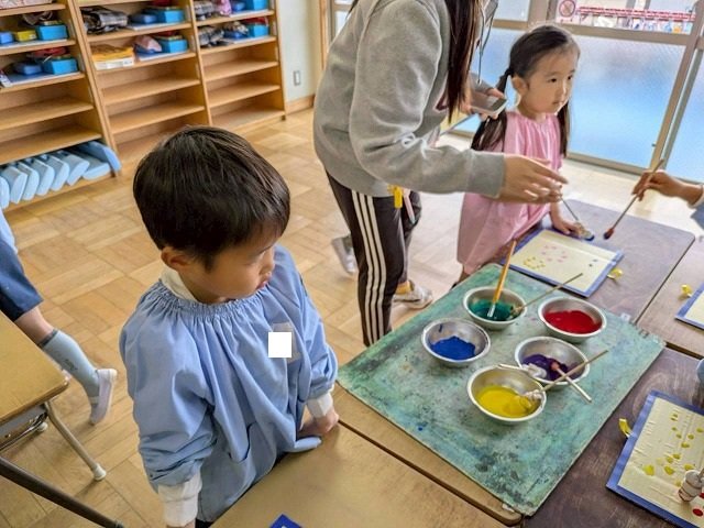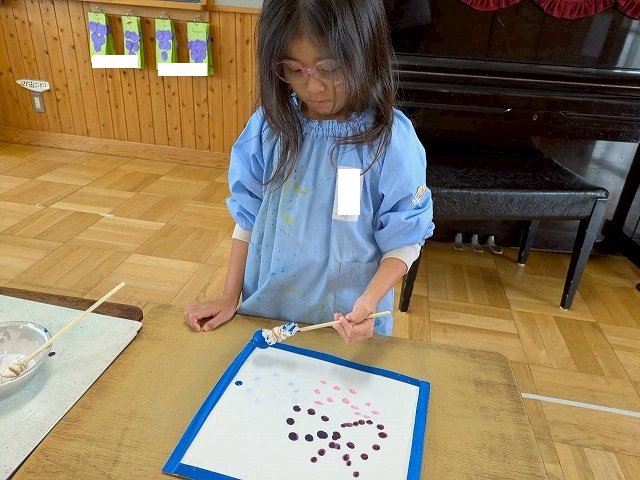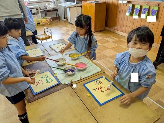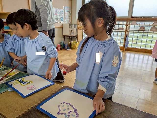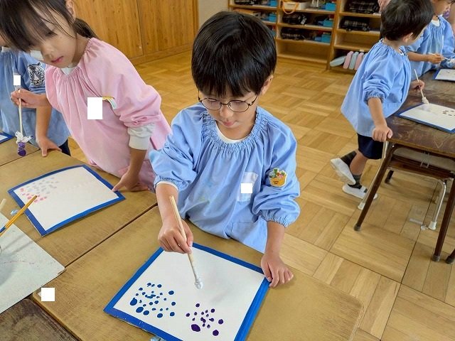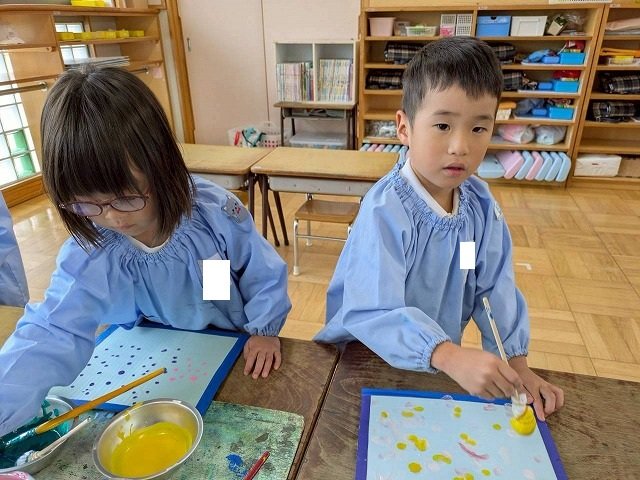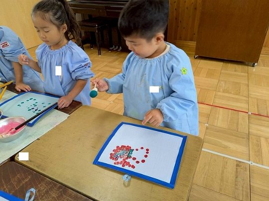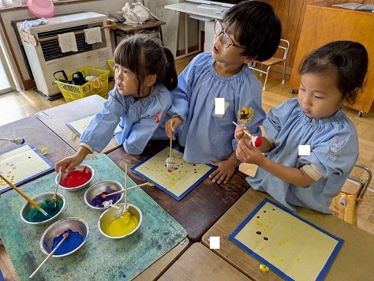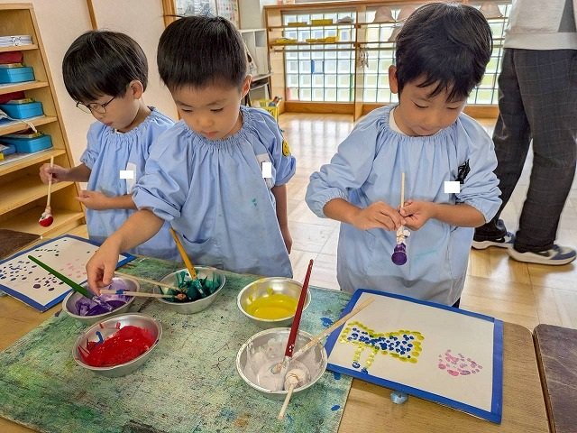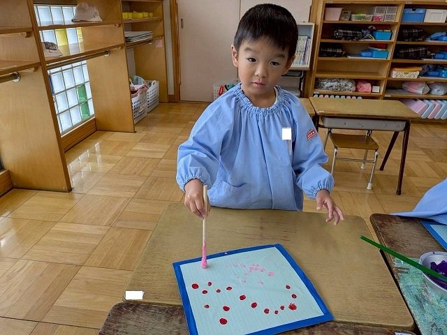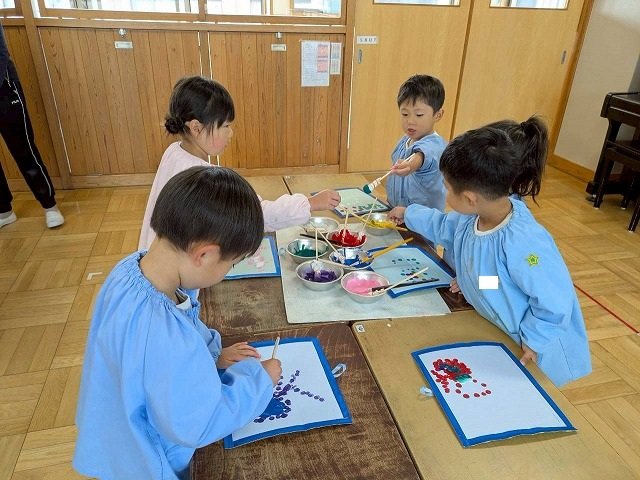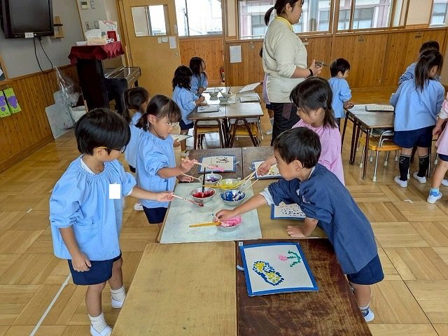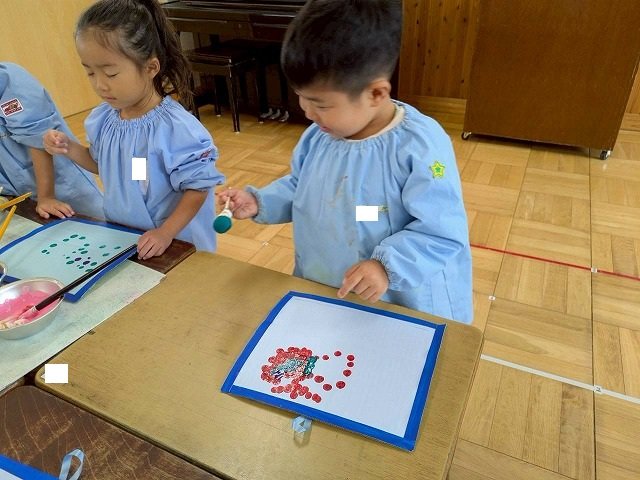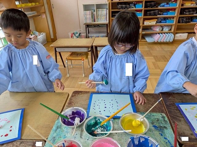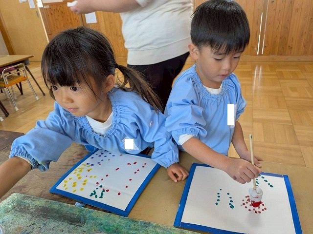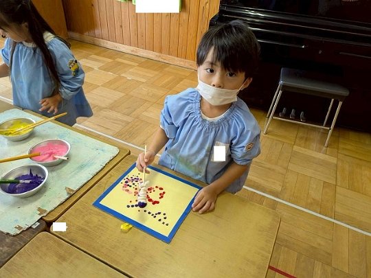 年中組 いろんな色のポスターカラーをポンポンと押して、絵を描きました
