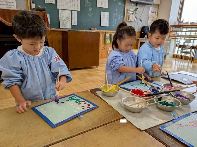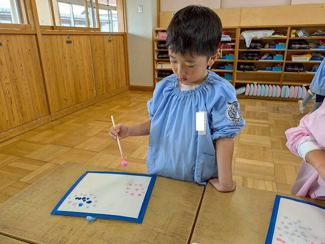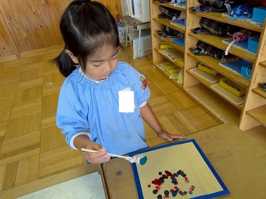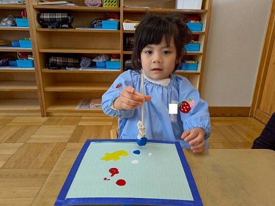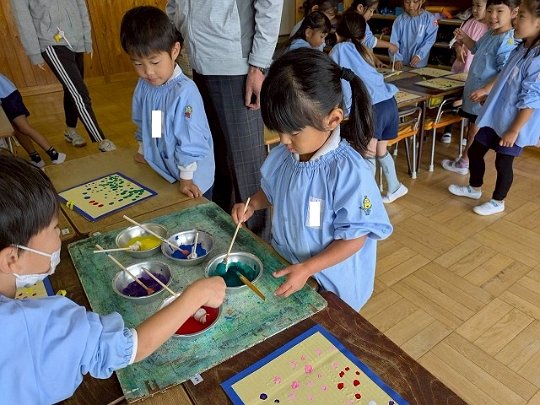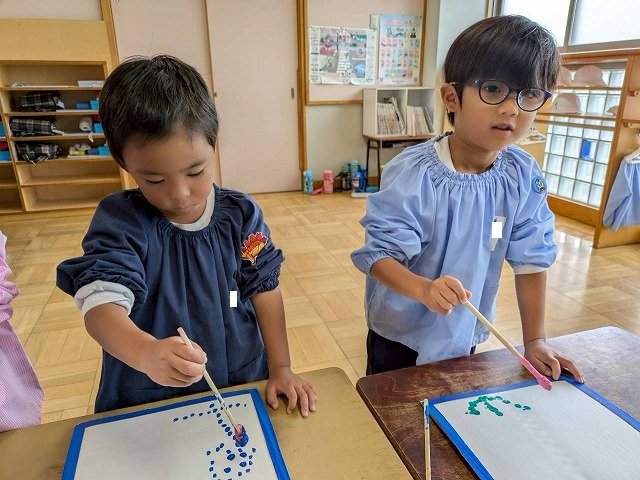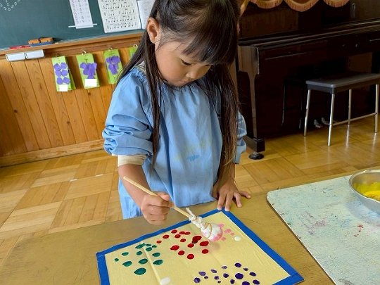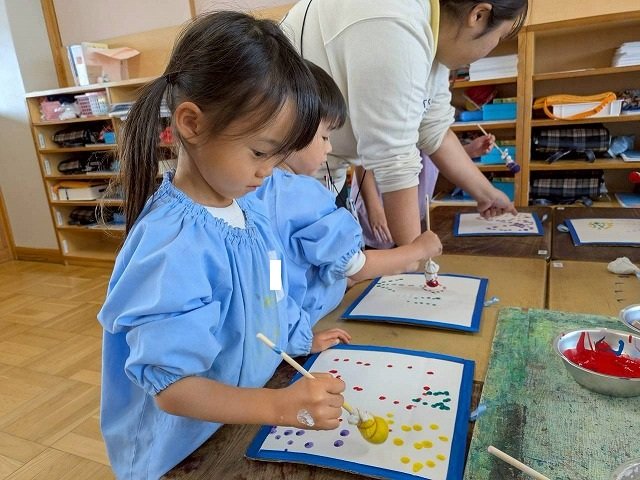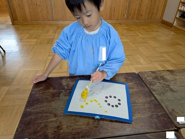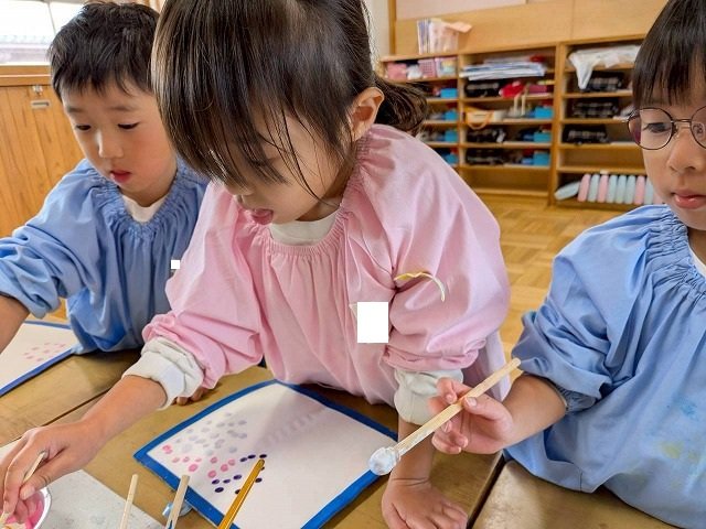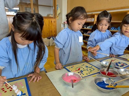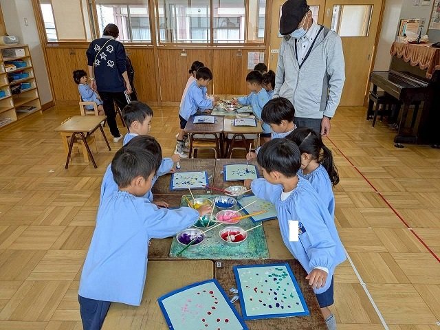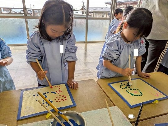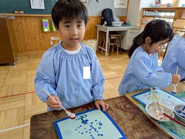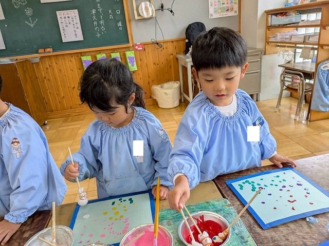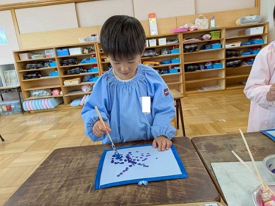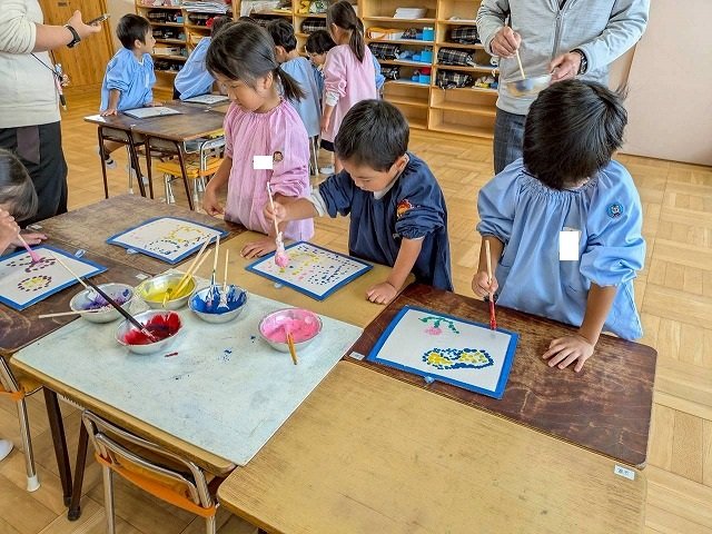 年中組 いろんな色のポスターカラーをポンポンと押して、絵を描きました