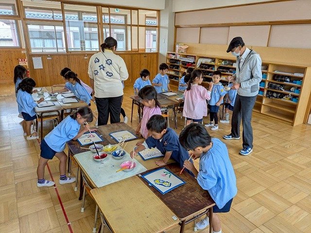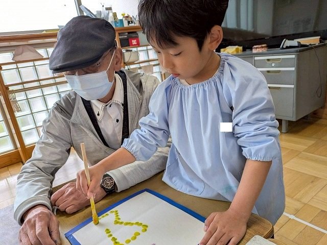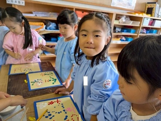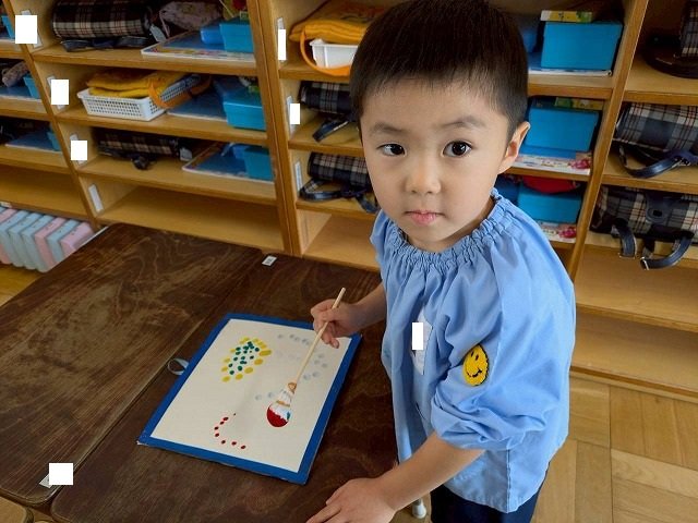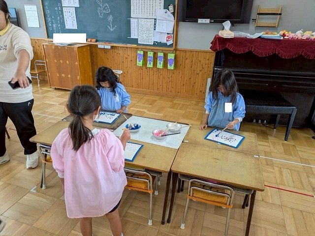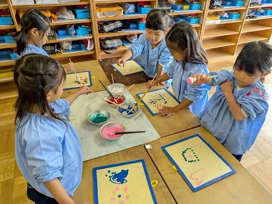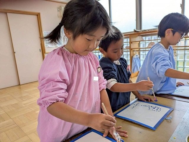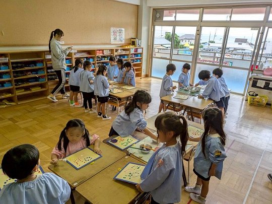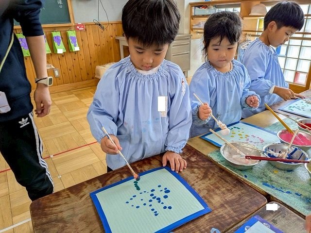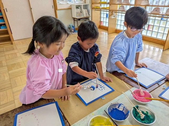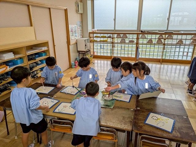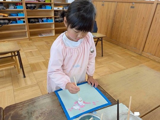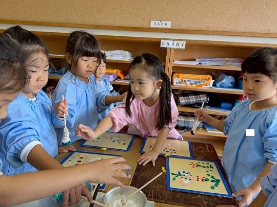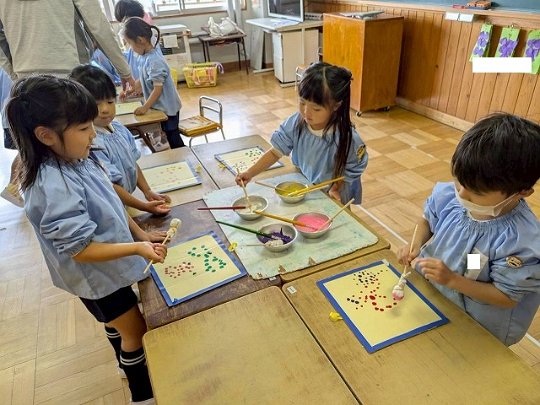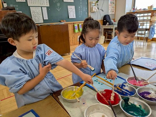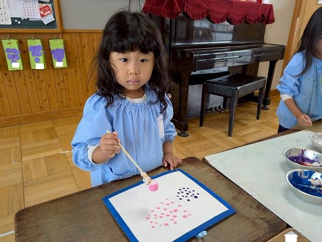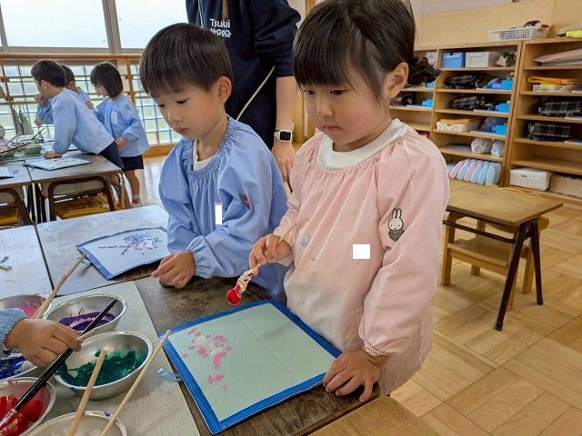 年中組 いろんな色のポスターカラーをポンポンと押して、絵を描きました