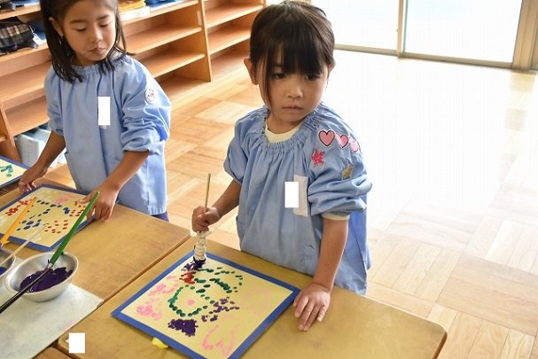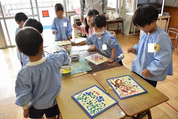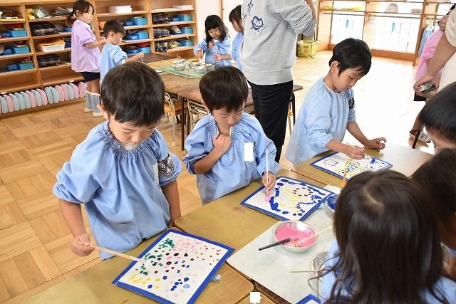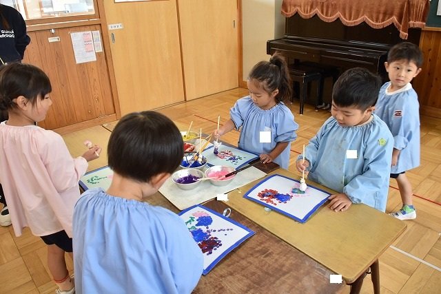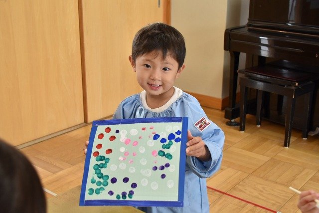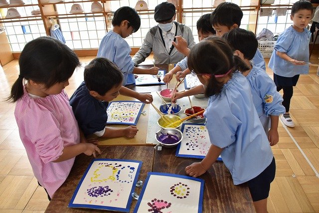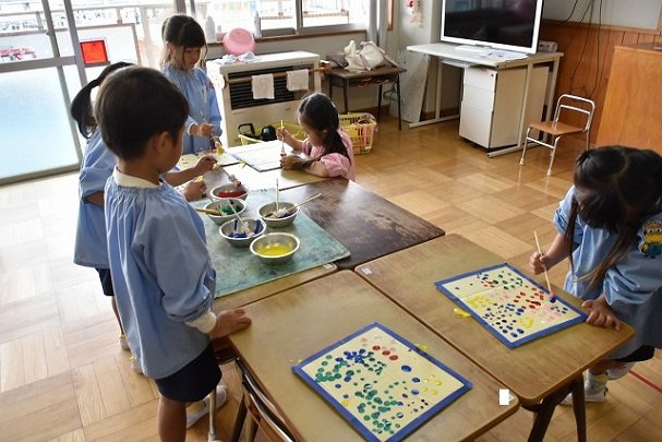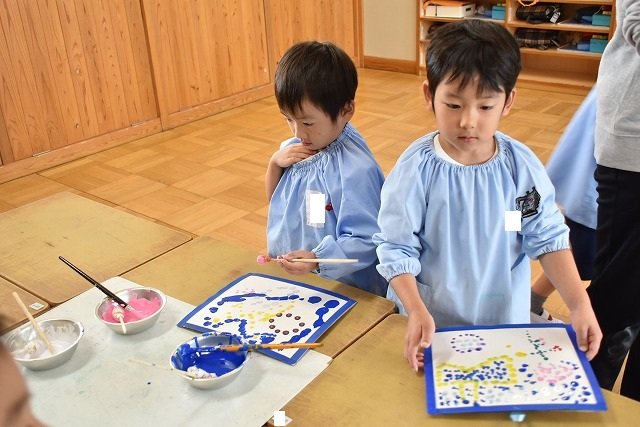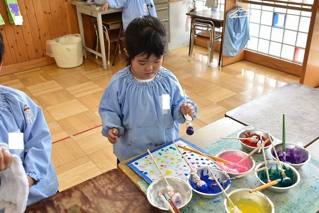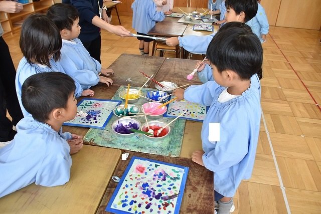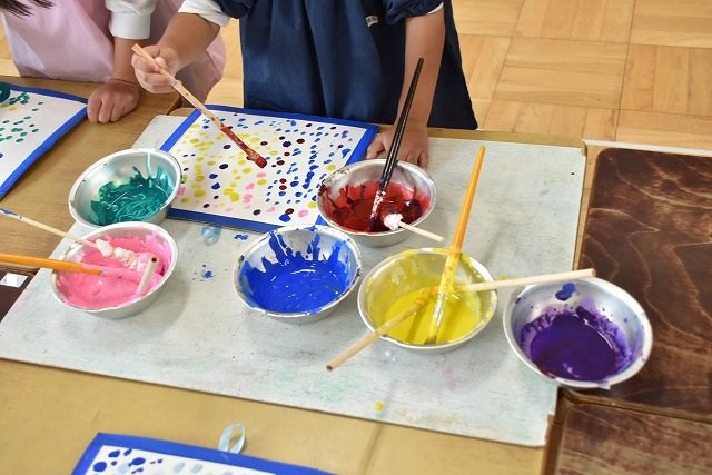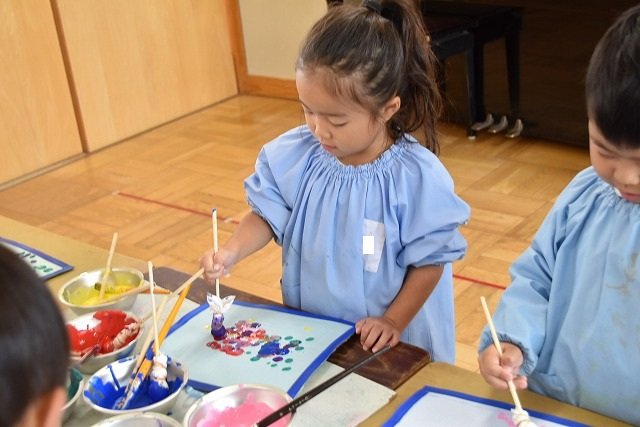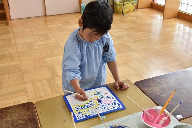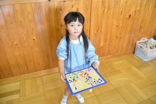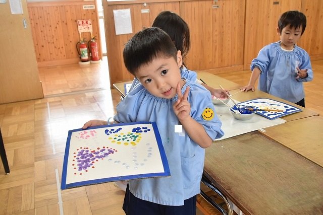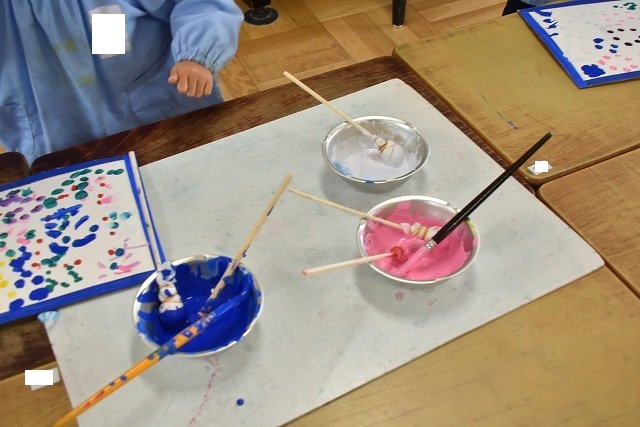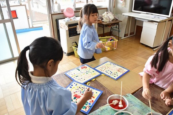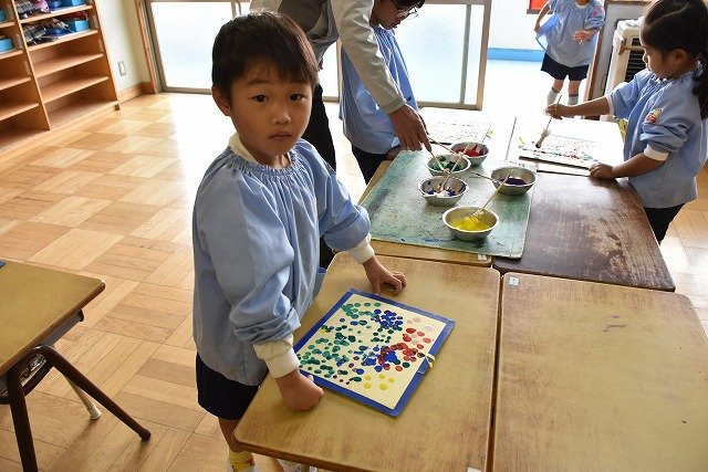 年中組 いろんな色のポスターカラーをポンポンと押して、絵を描きました
