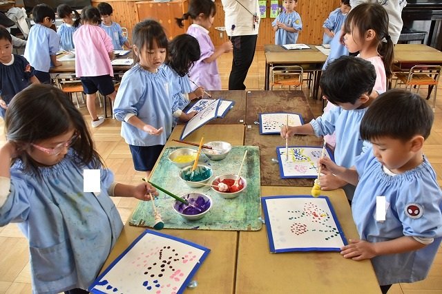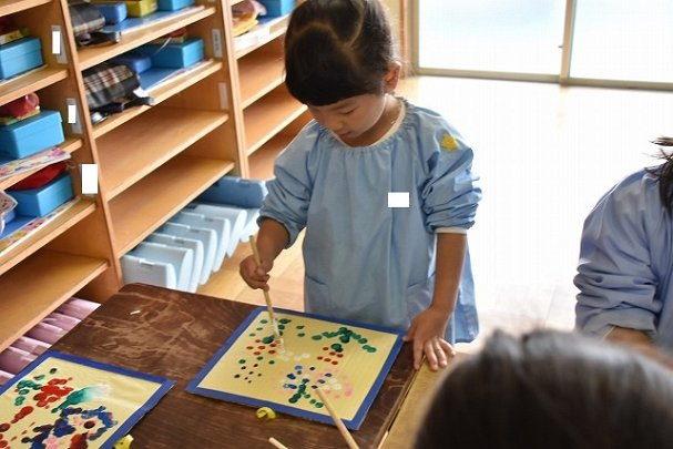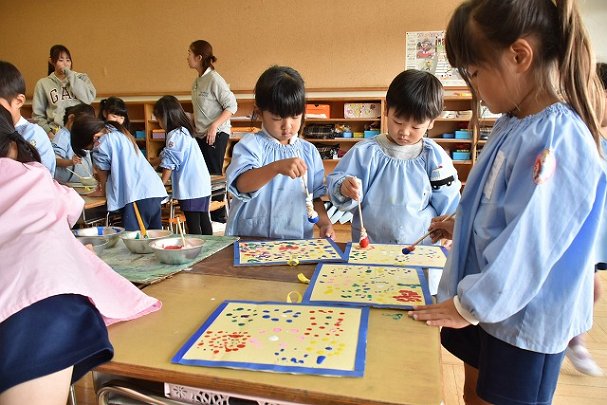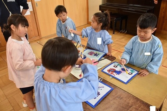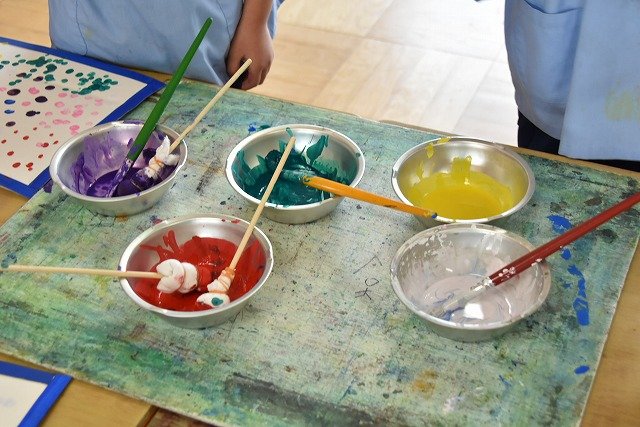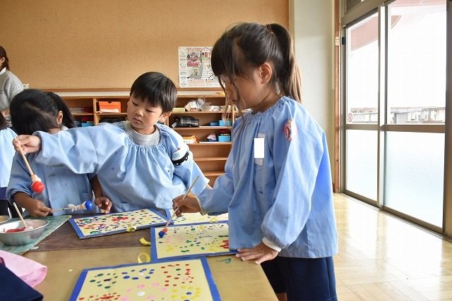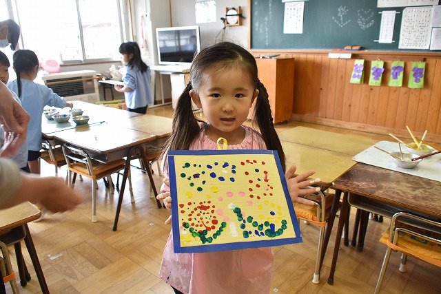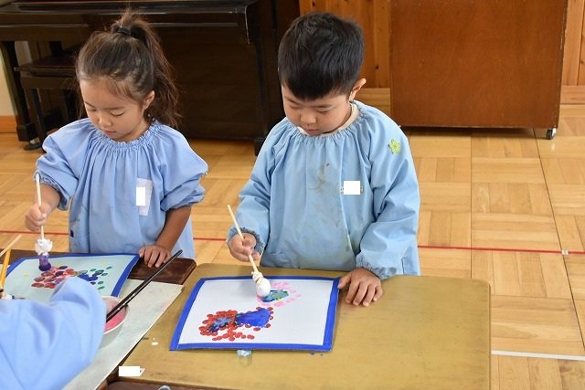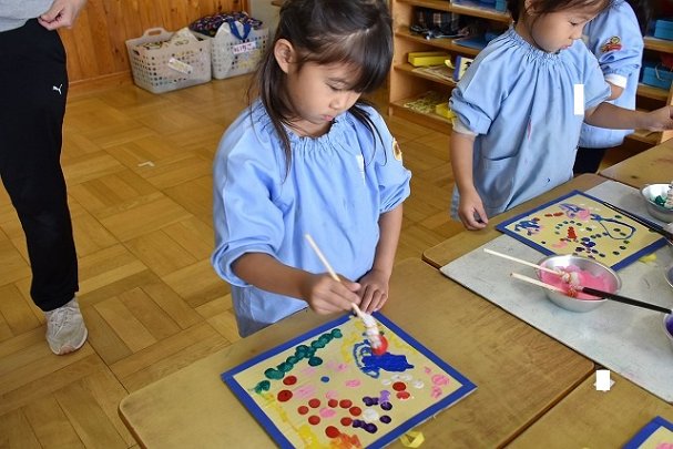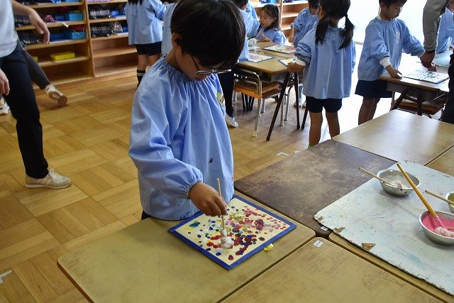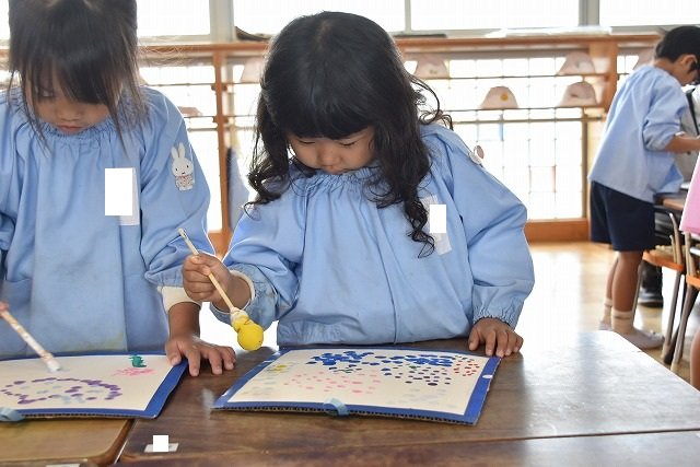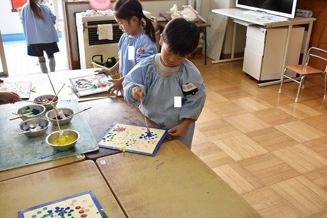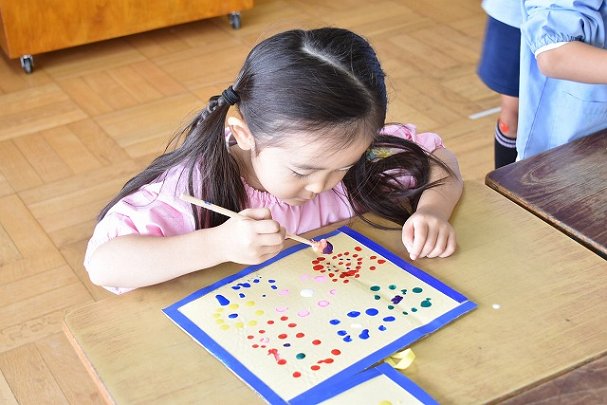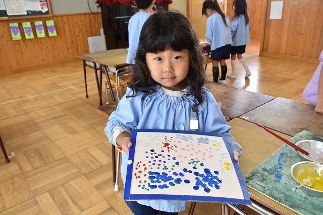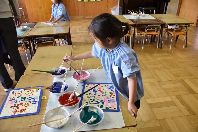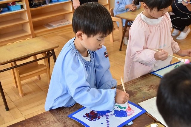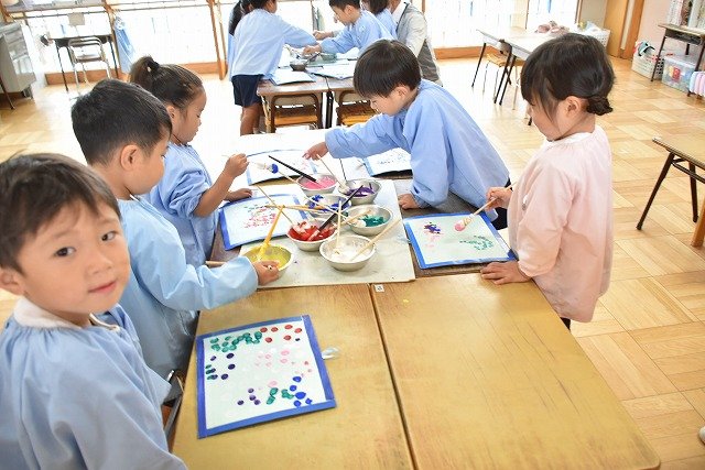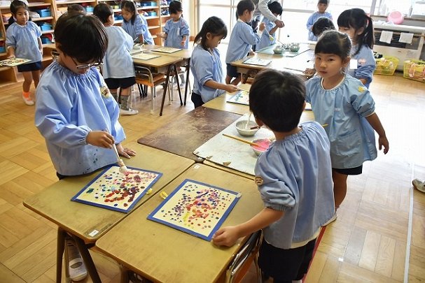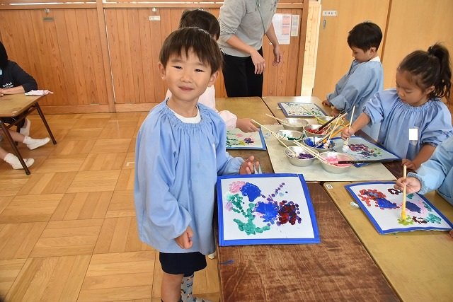 年中組 いろんな色のポスターカラーをポンポンと押して、絵を描きました