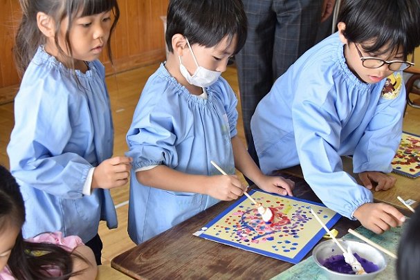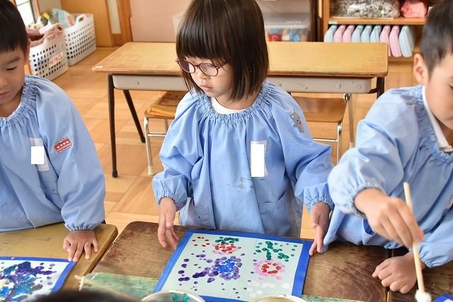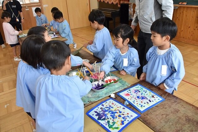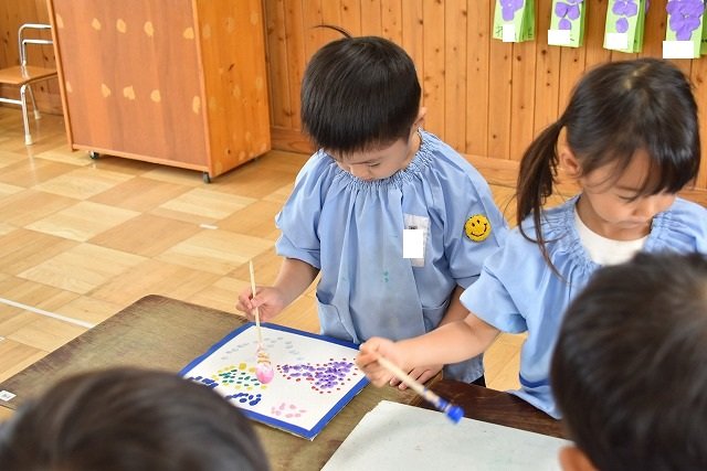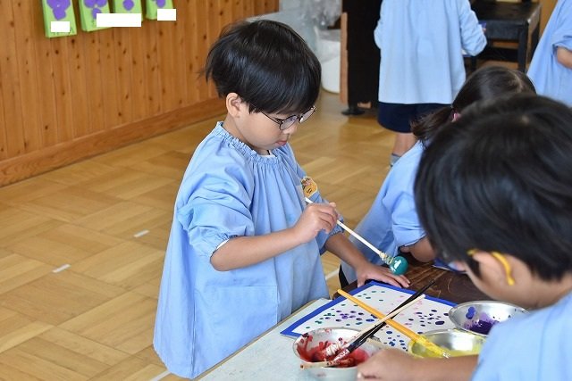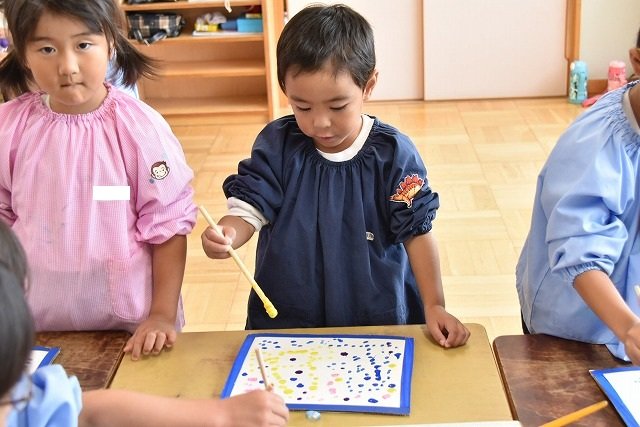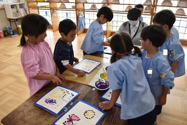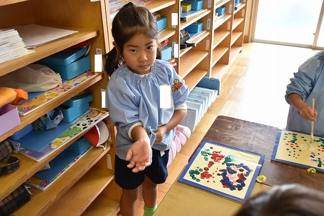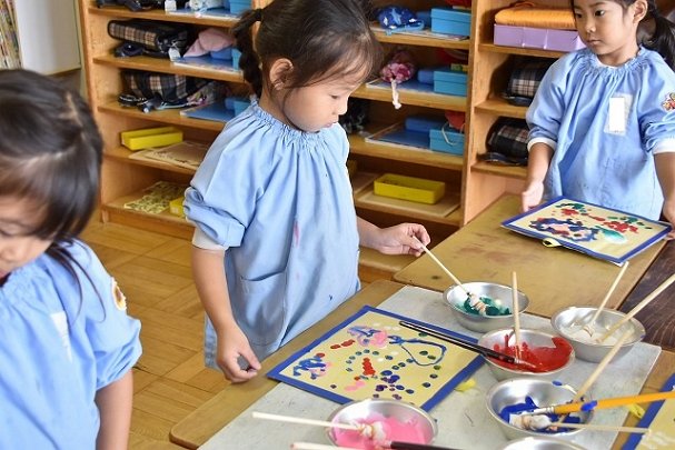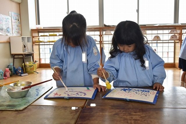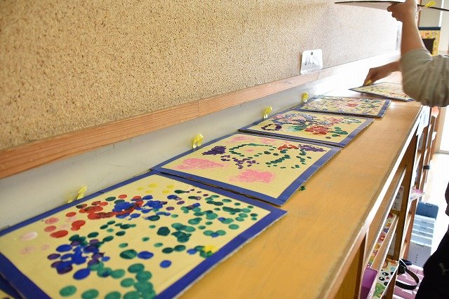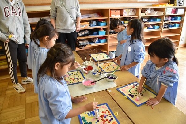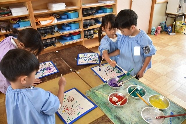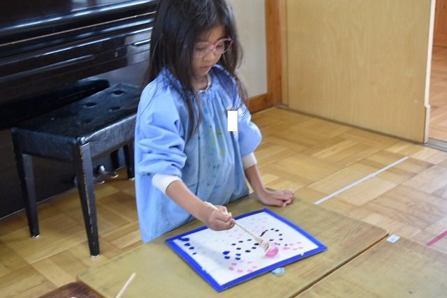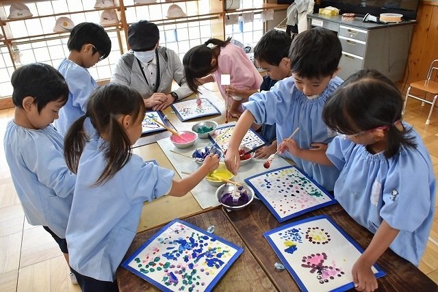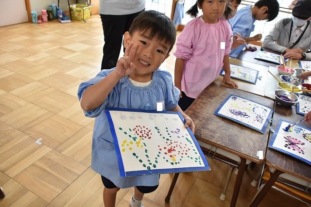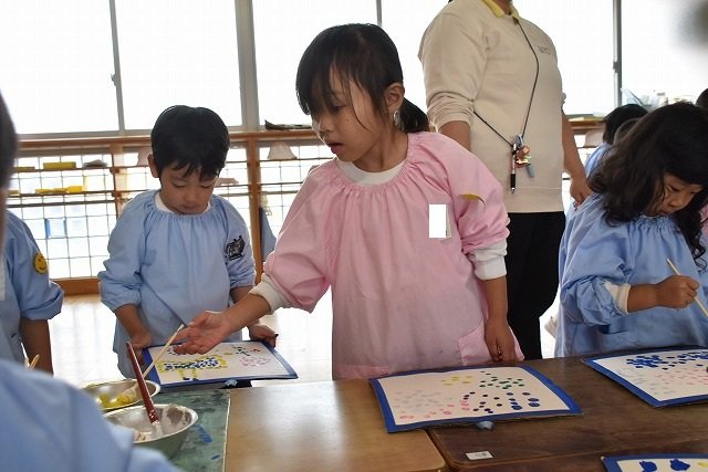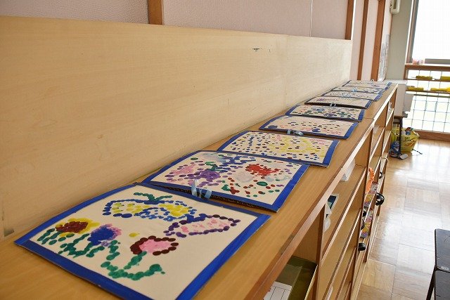 年中組 いろんな色のポスターカラーをポンポンと押して、絵を描きました
