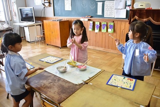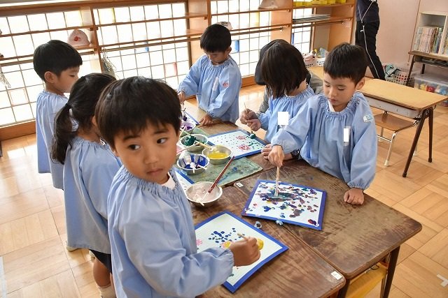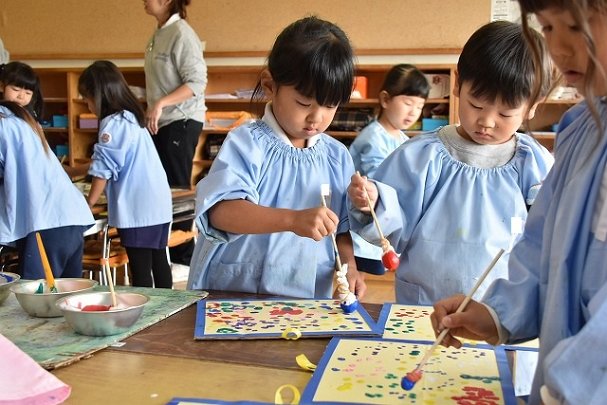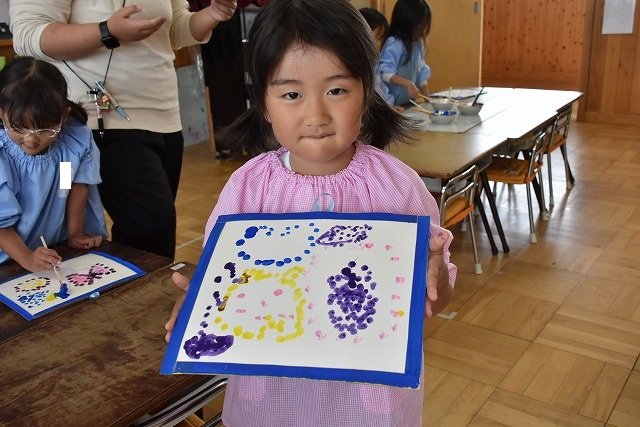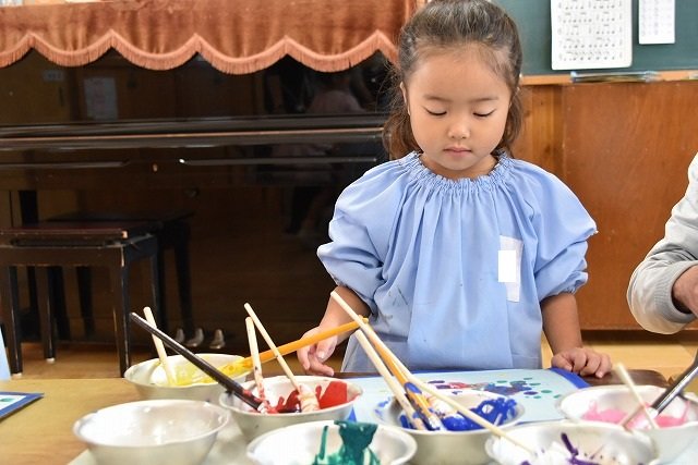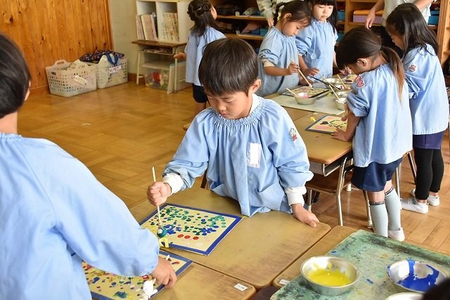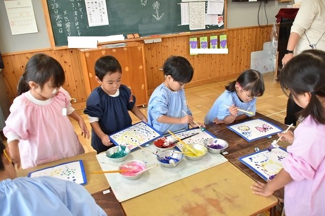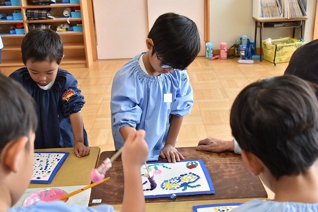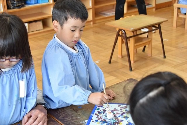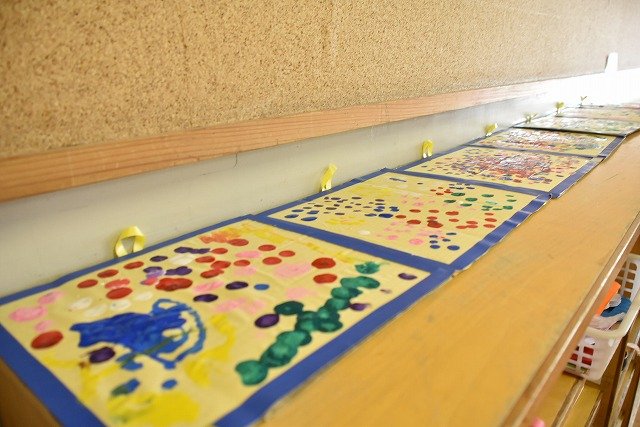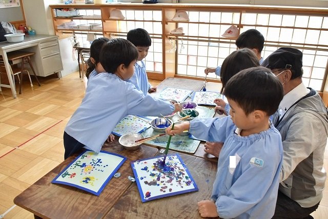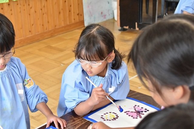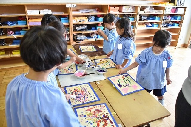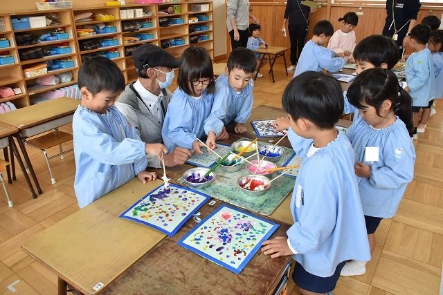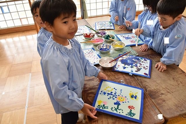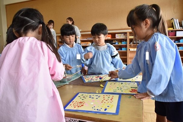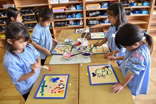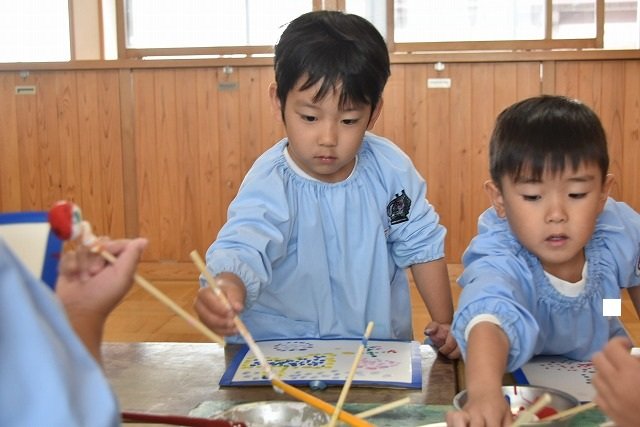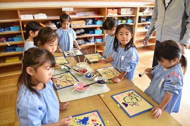 年中組 いろんな色のポスターカラーをポンポンと押して、絵を描きました