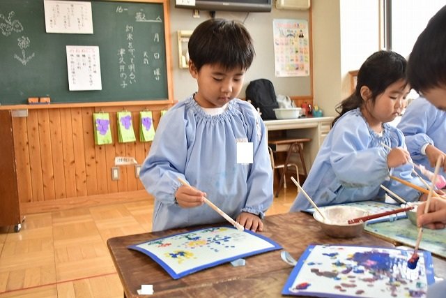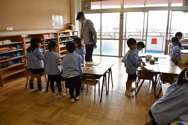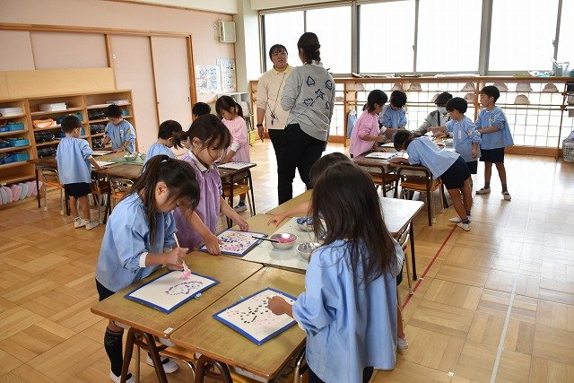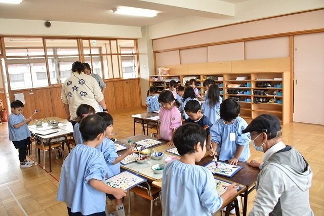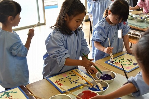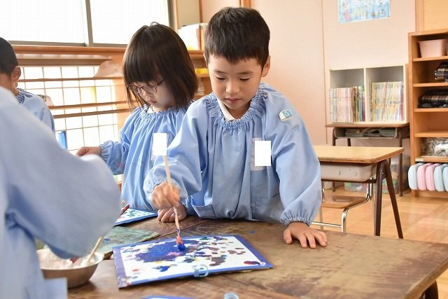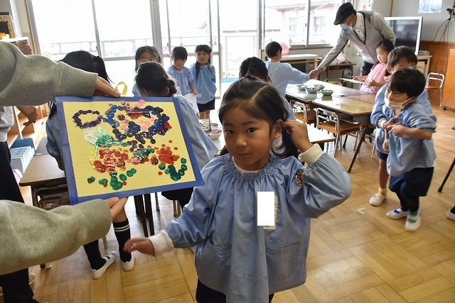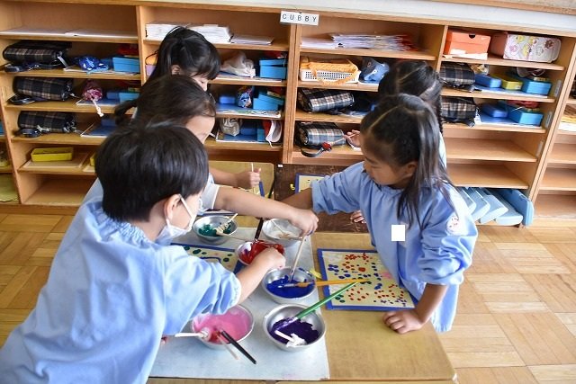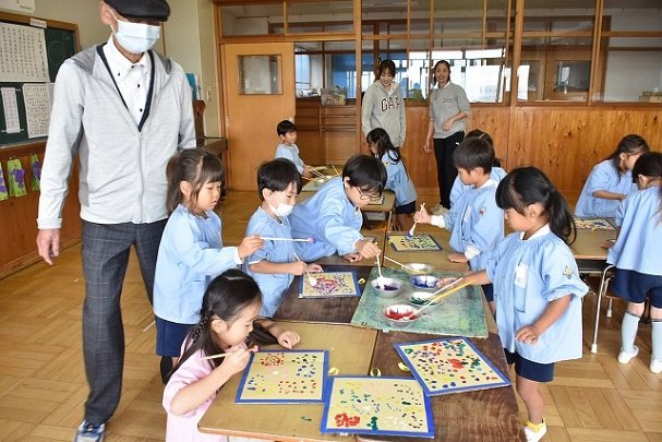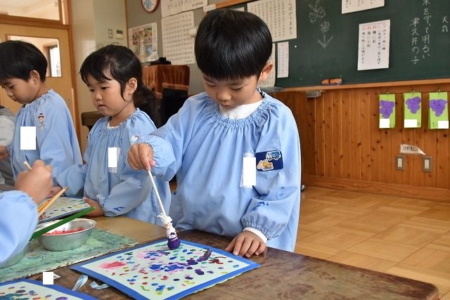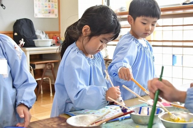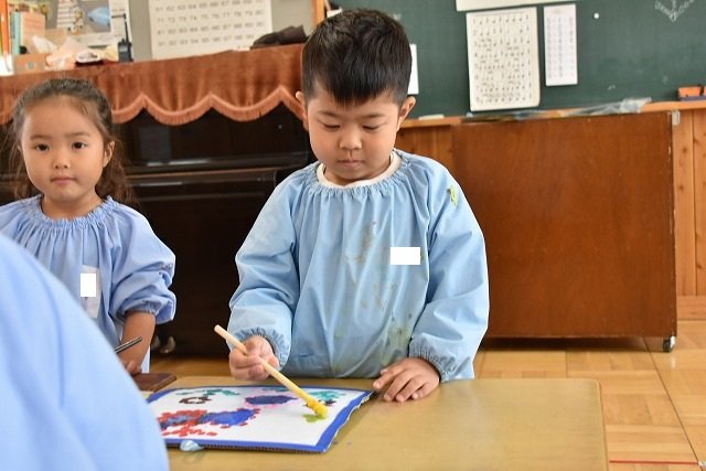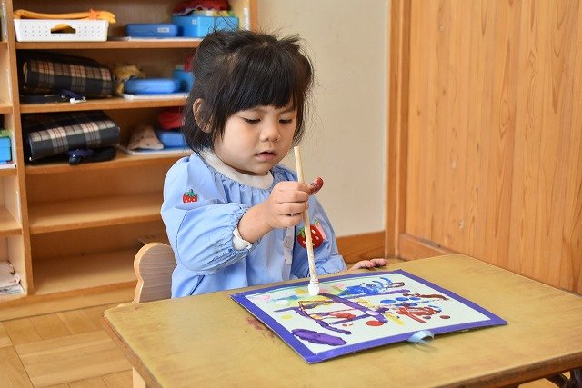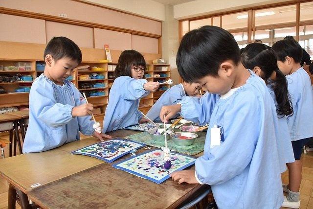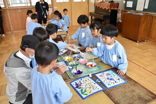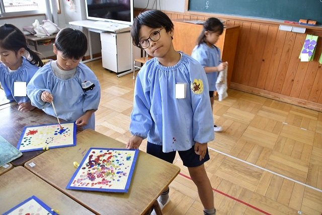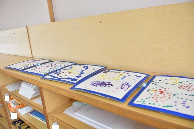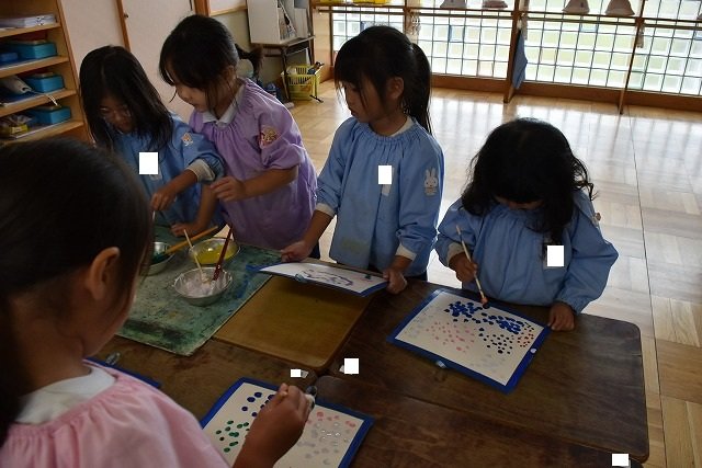 年中組 いろんな色のポスターカラーをポンポンと押して、絵を描きました