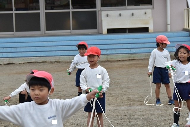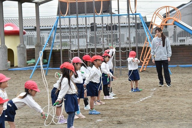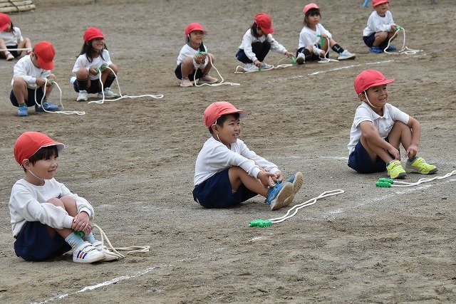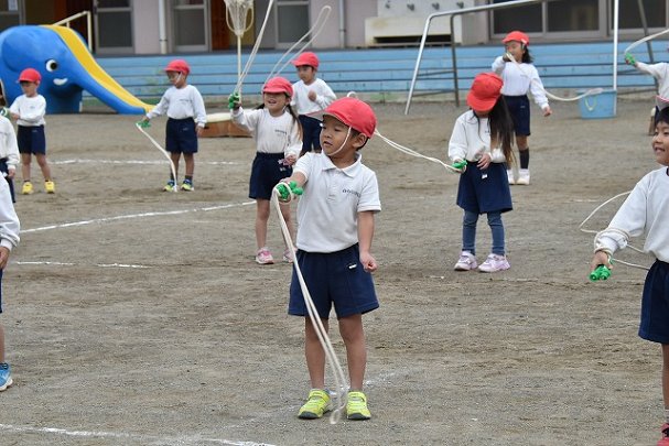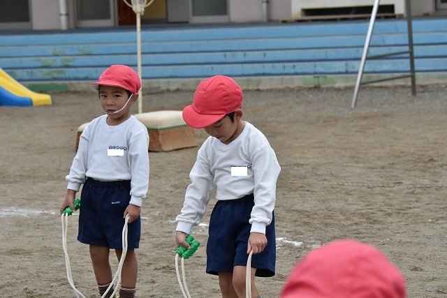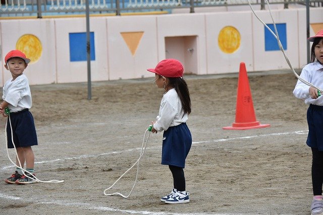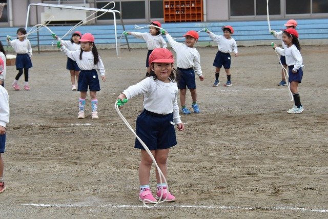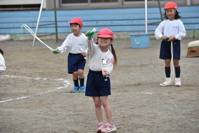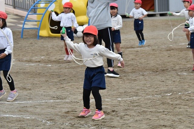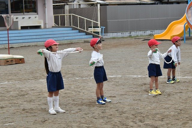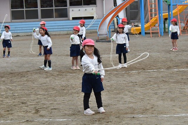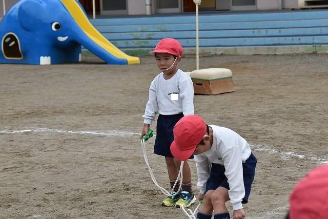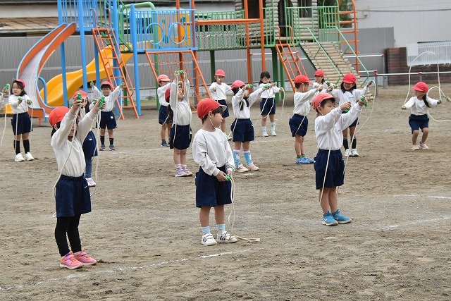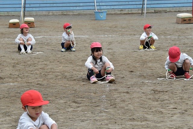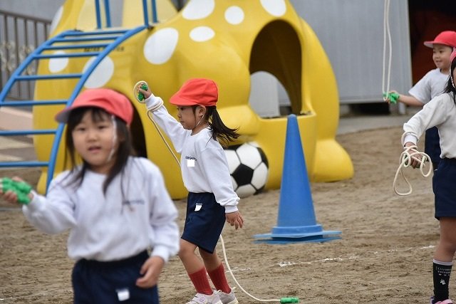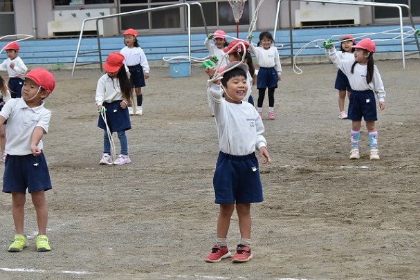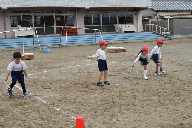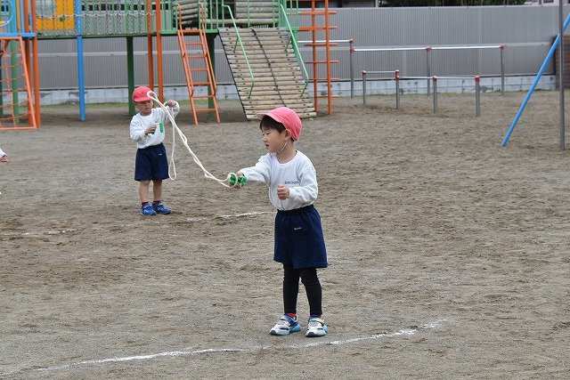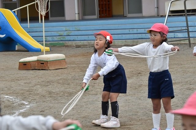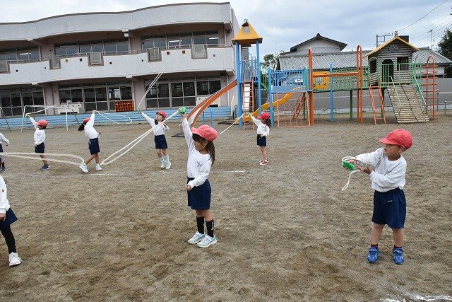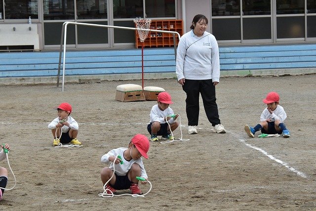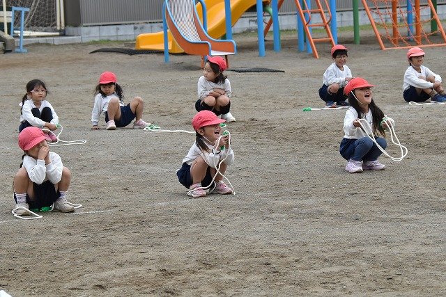 年中組 縄跳びを使っていろんな運動をしました。その後、クラス対抗玉入れゲームをしました。
