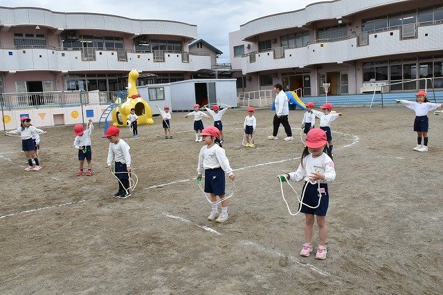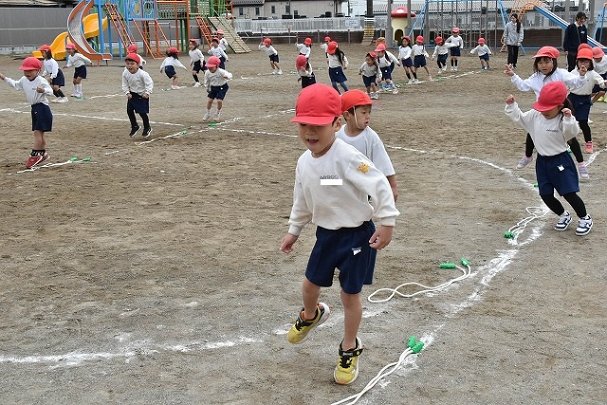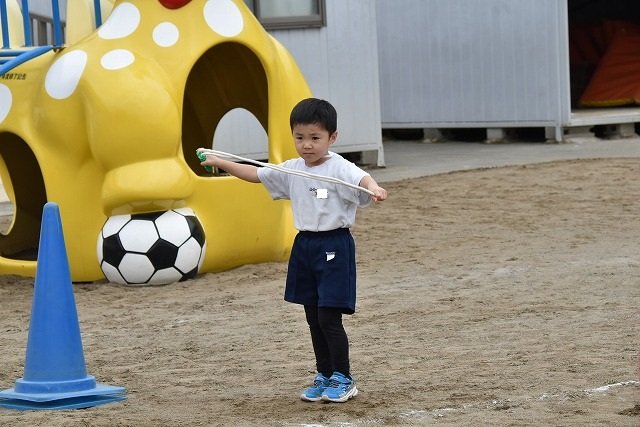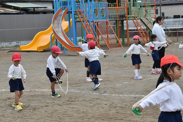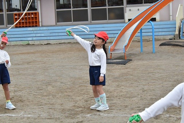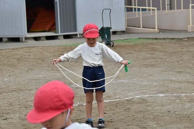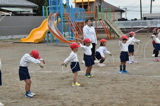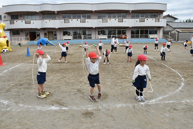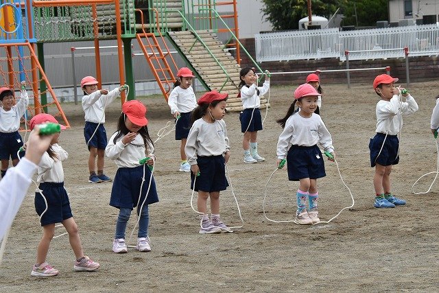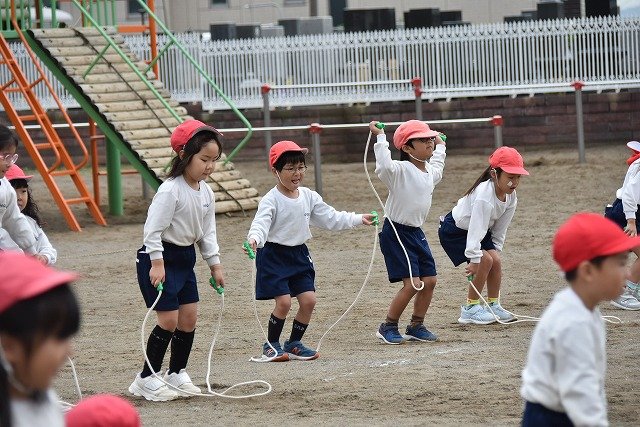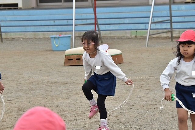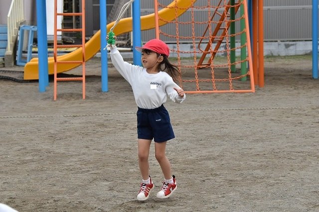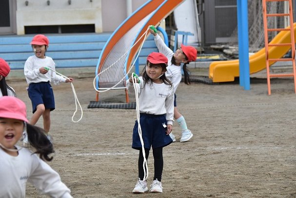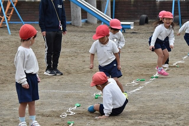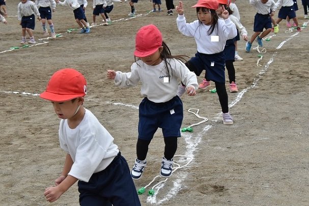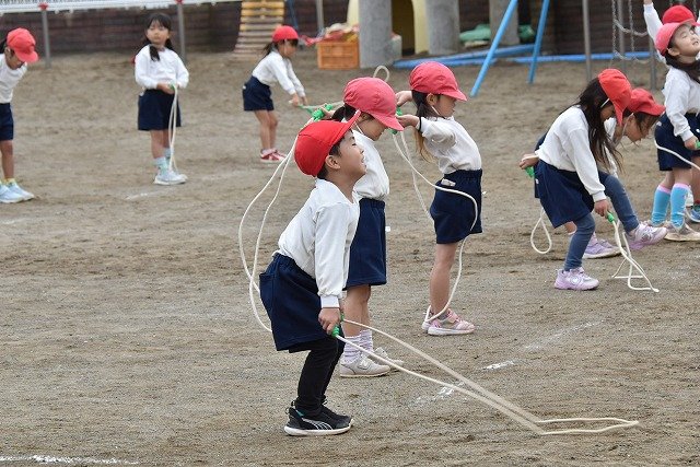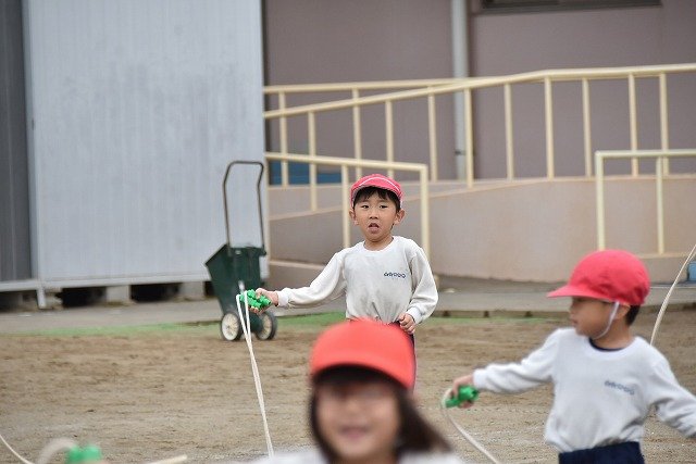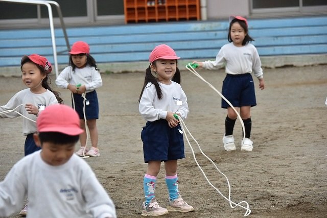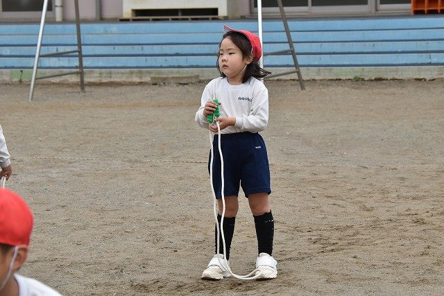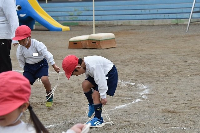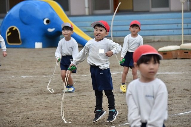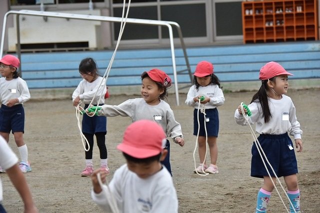 年中組 縄跳びを使っていろんな運動をしました。その後、クラス対抗玉入れゲームをしました。