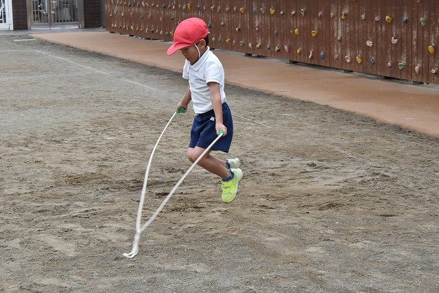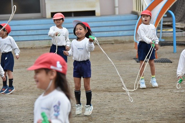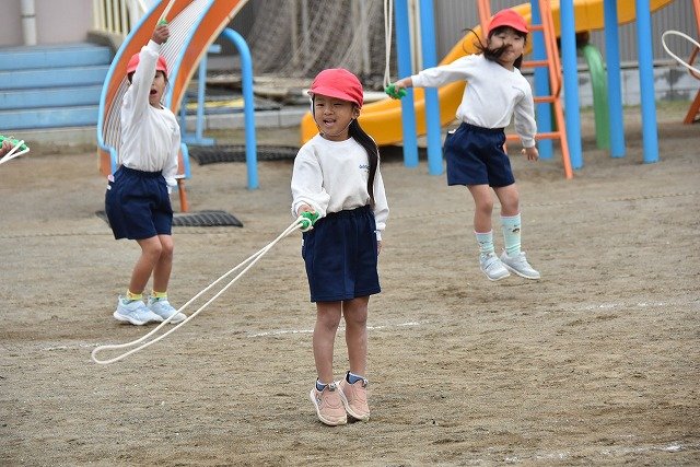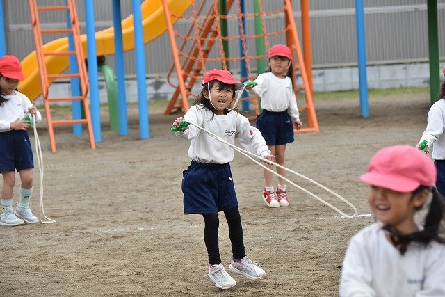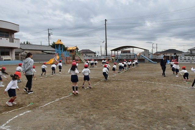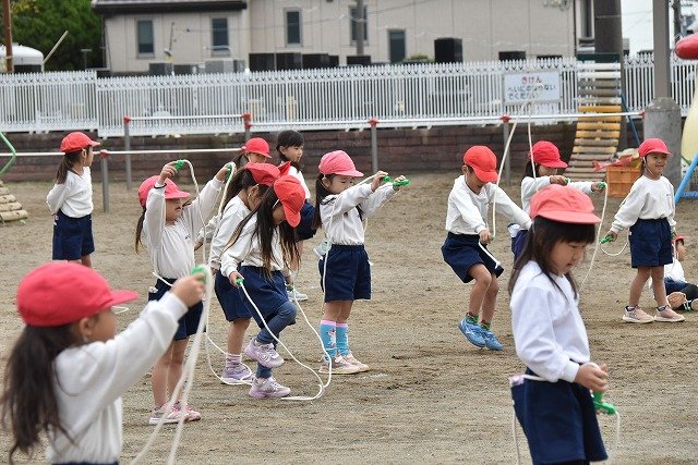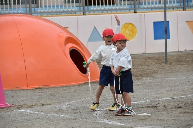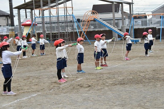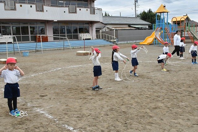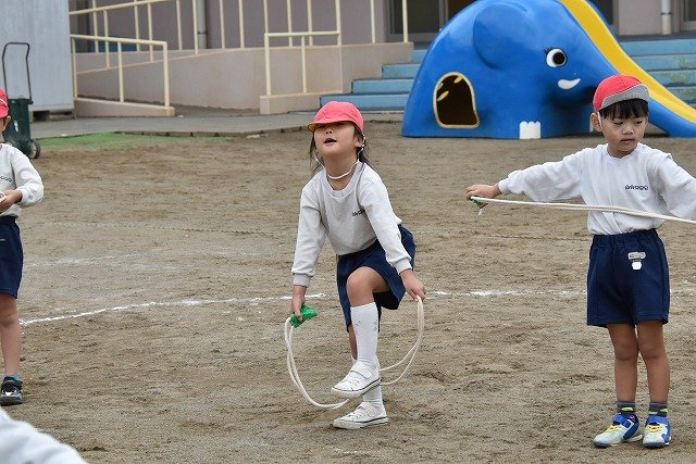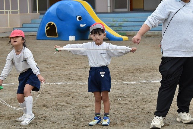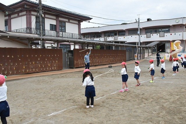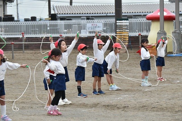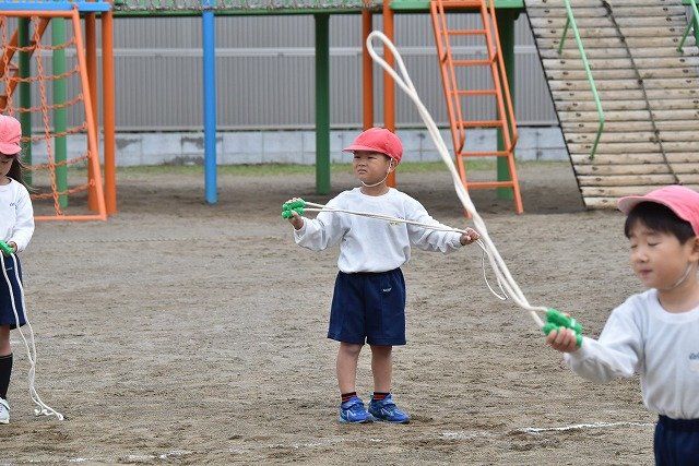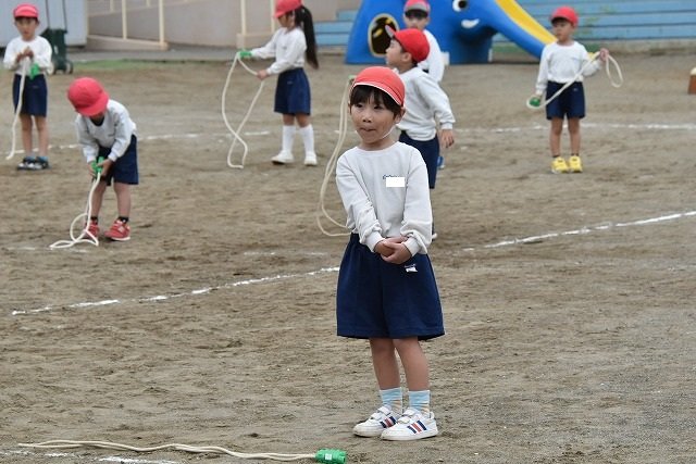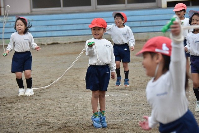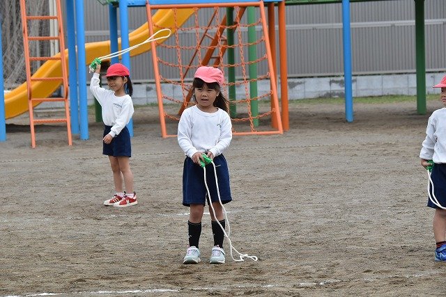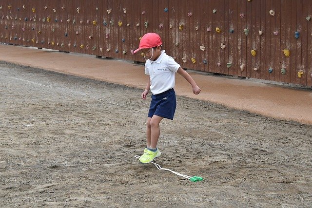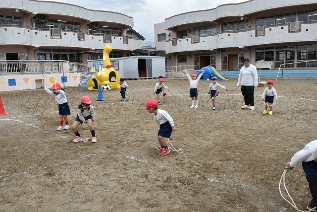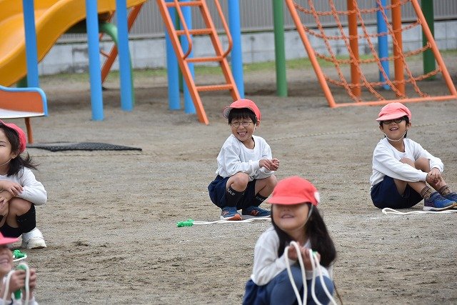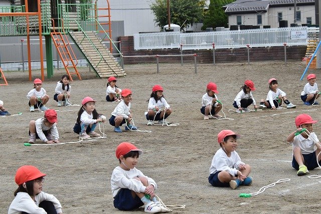 年中組 縄跳びを使っていろんな運動をしました。その後、クラス対抗玉入れゲームをしました。