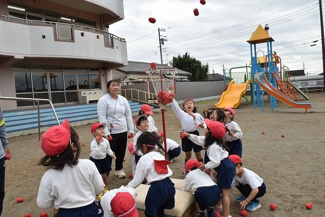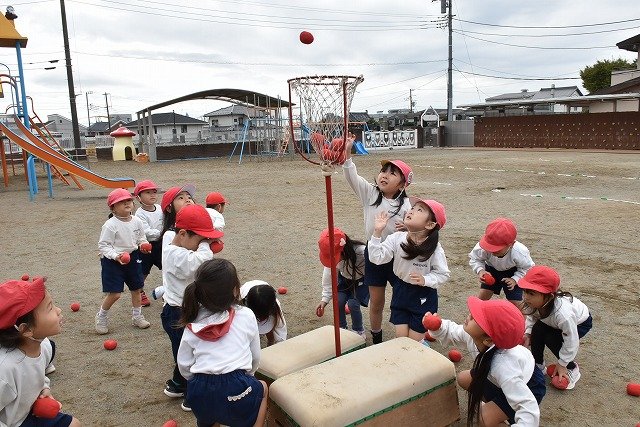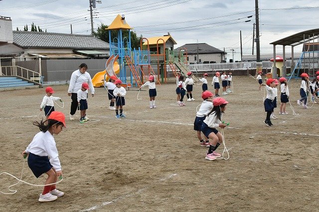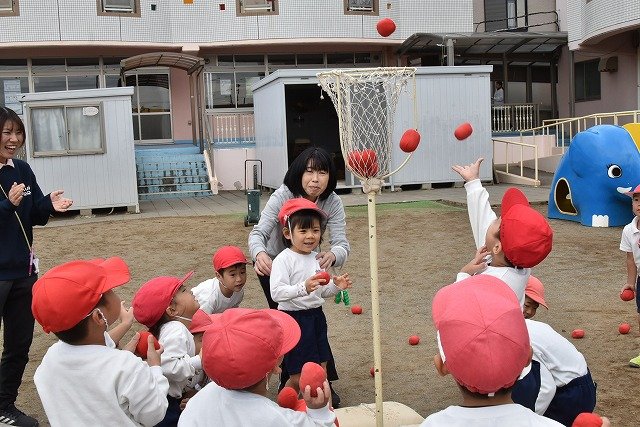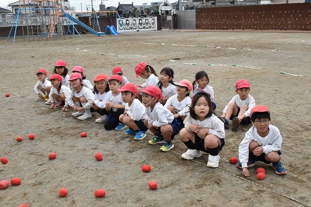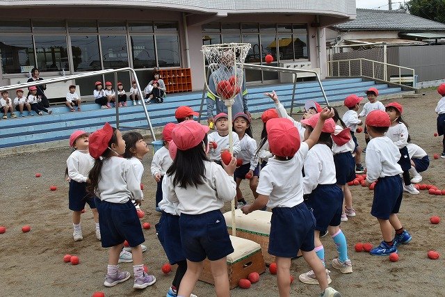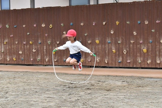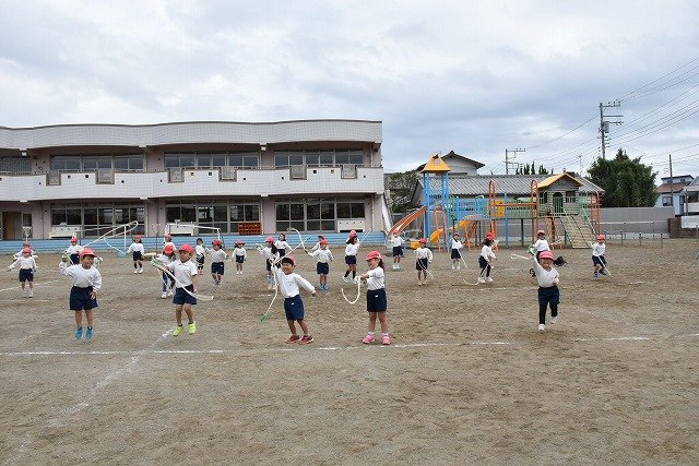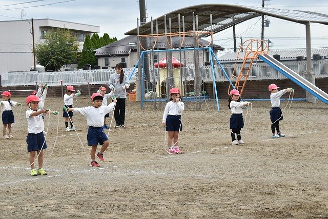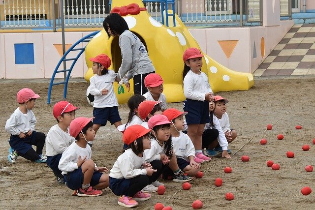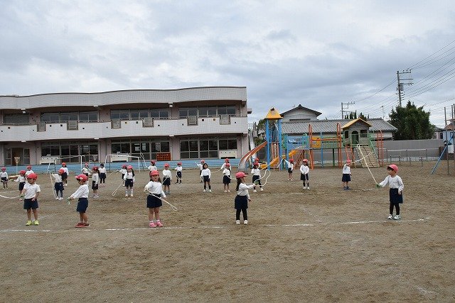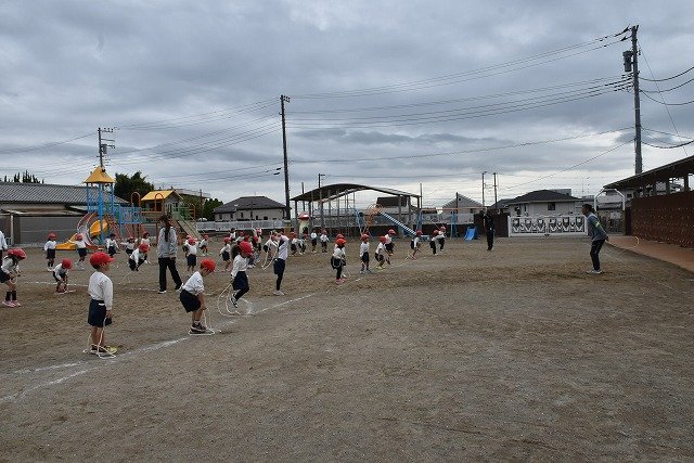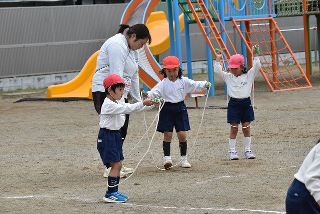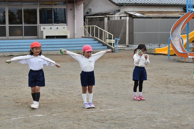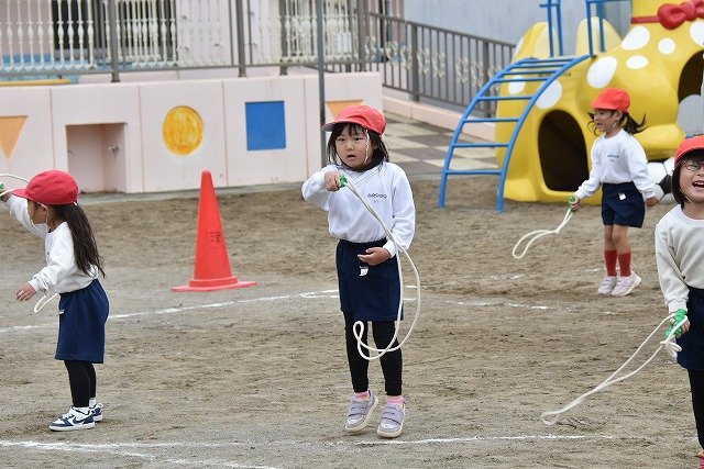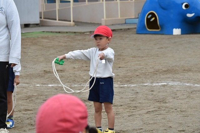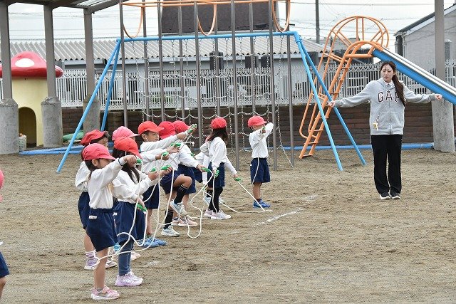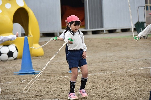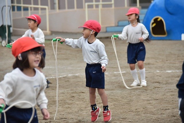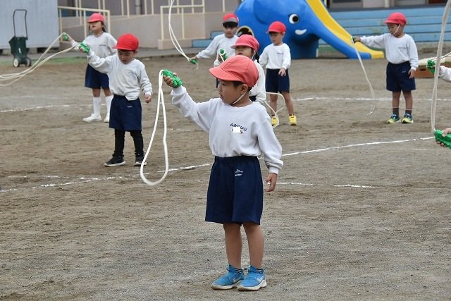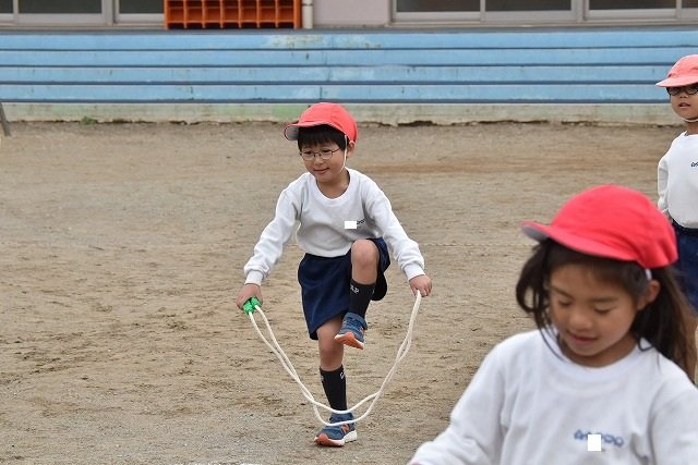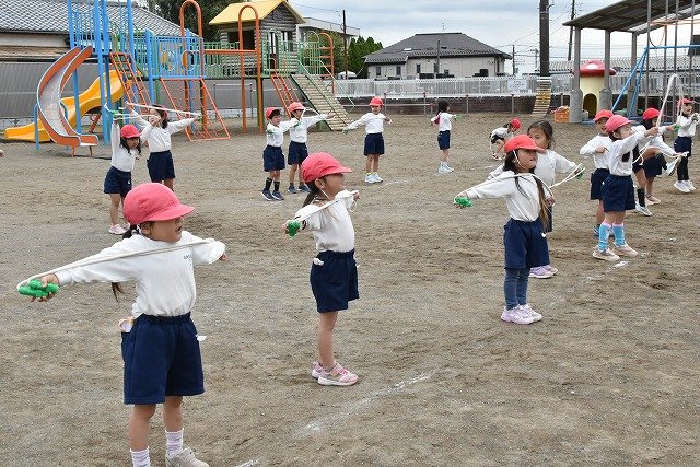 年中組 縄跳びを使っていろんな運動をしました。その後、クラス対抗玉入れゲームをしました。