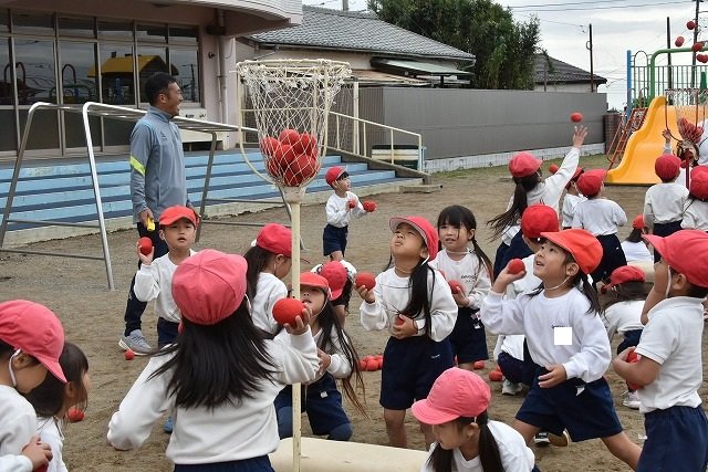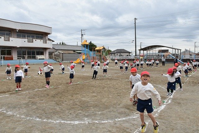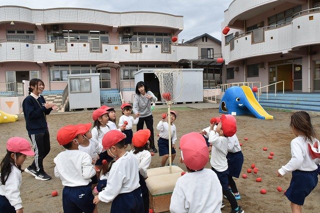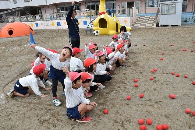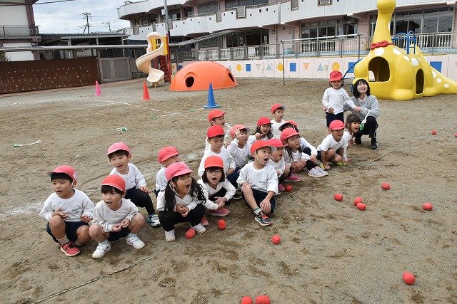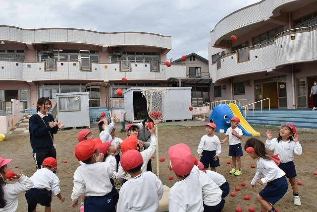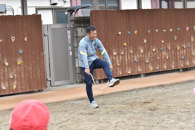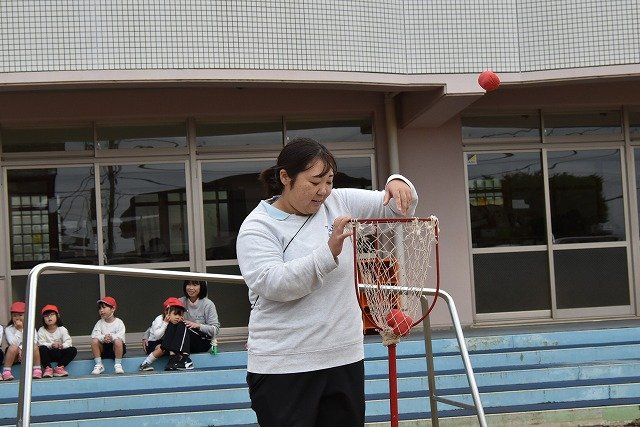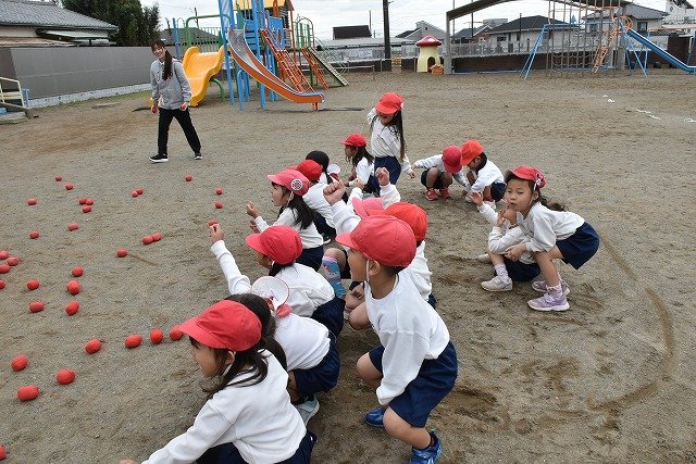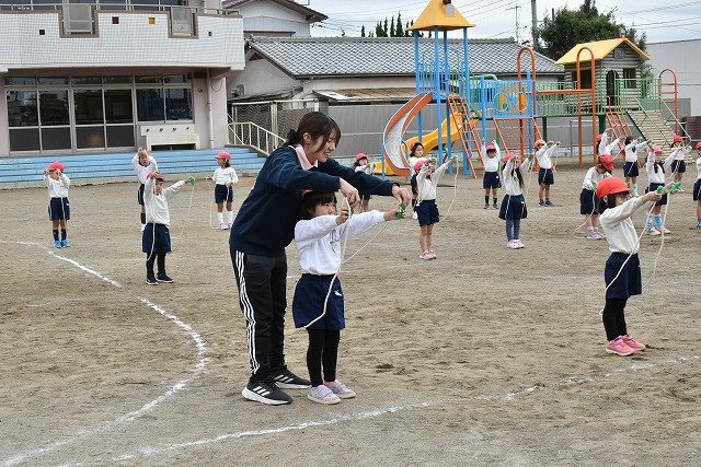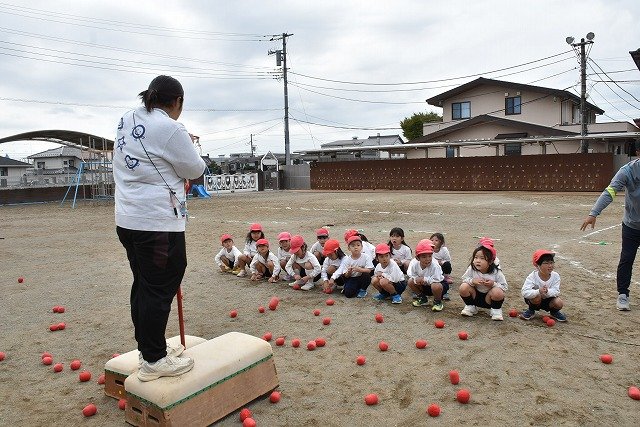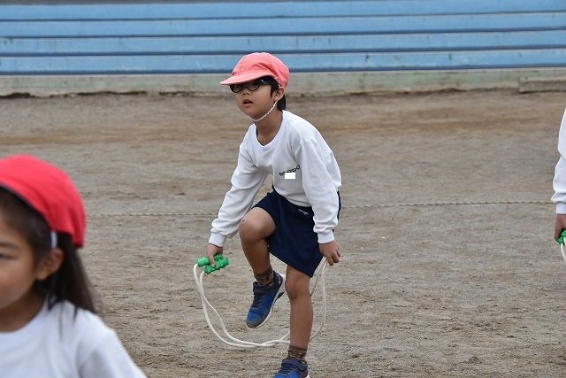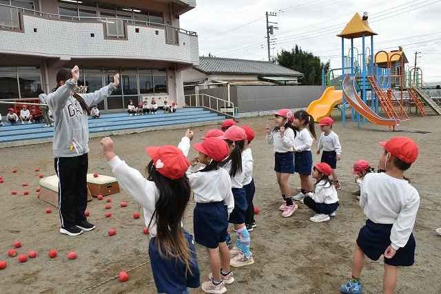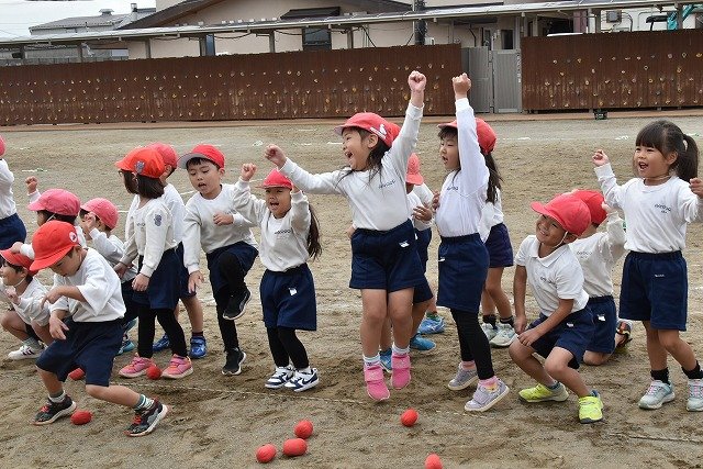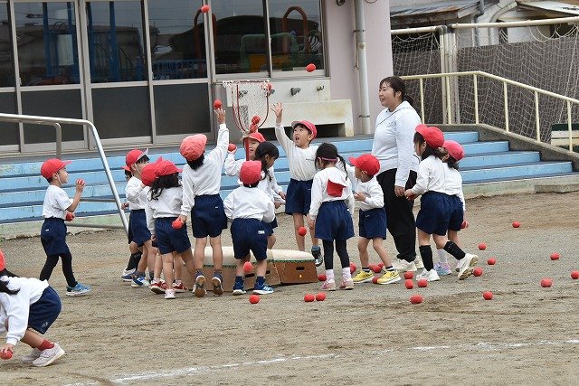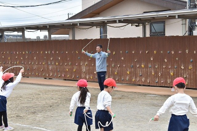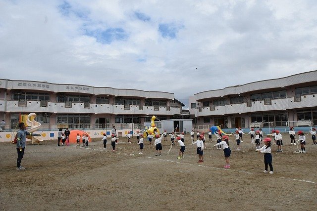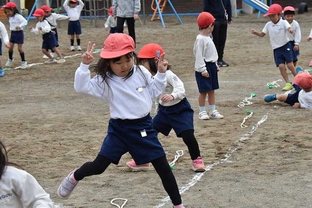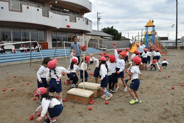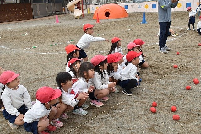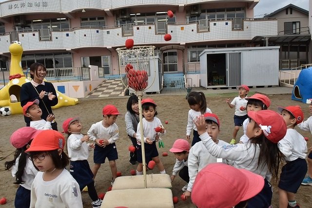 年中組 縄跳びを使っていろんな運動をしました。その後、クラス対抗玉入れゲームをしました。