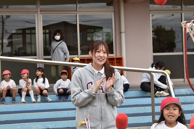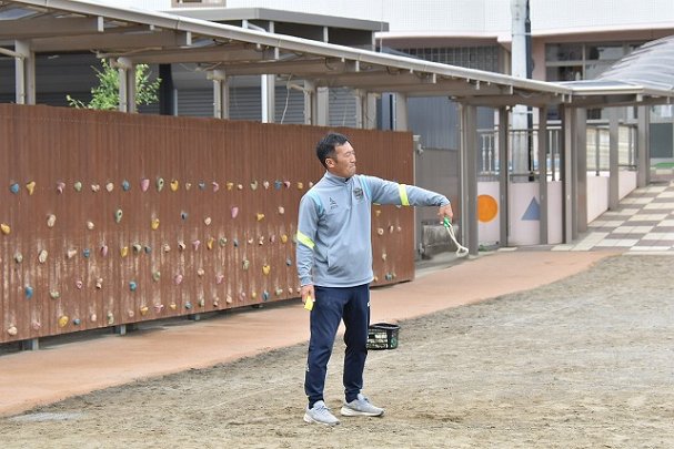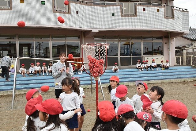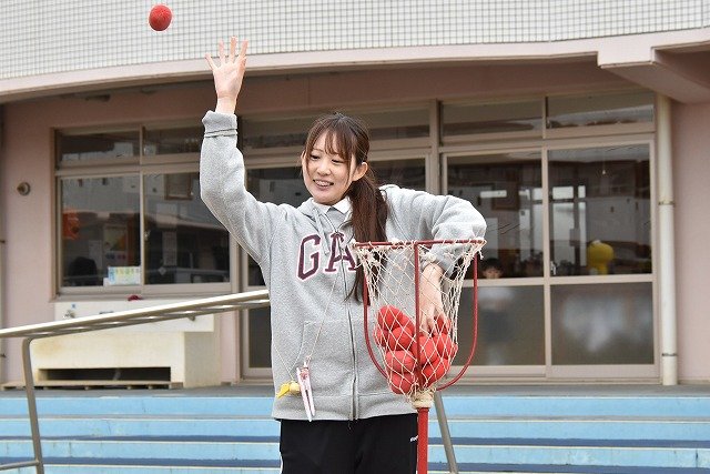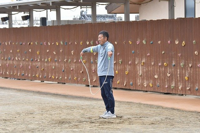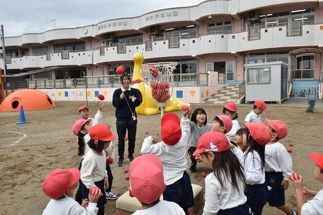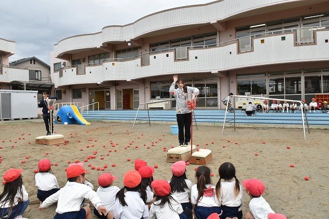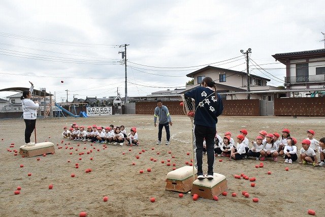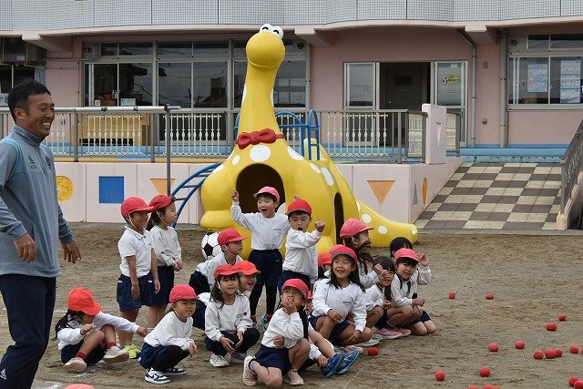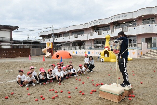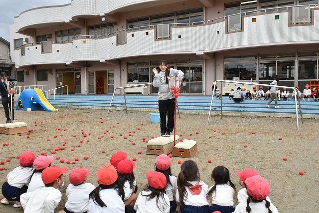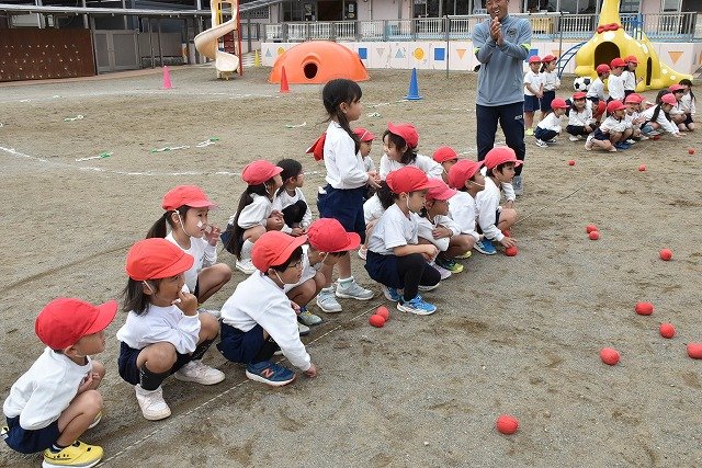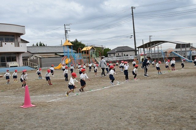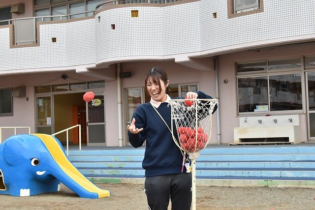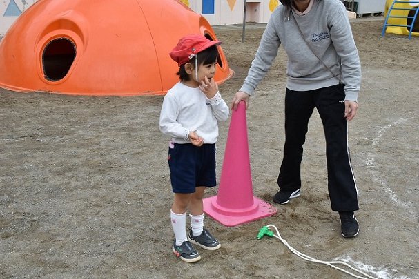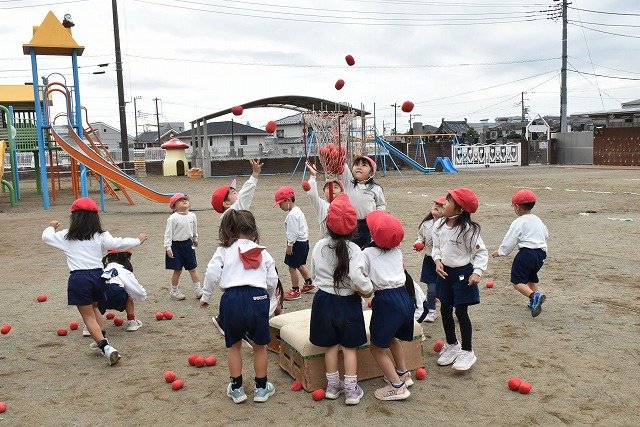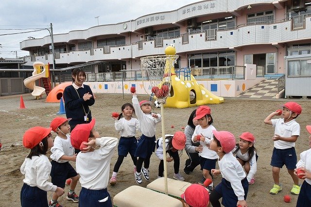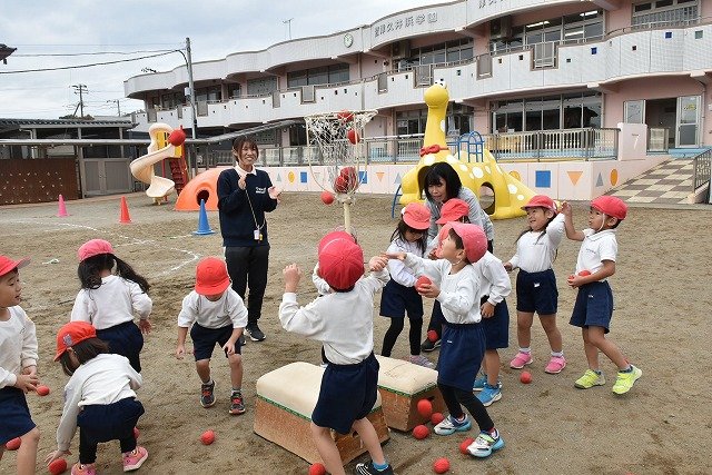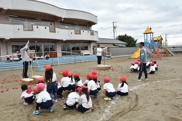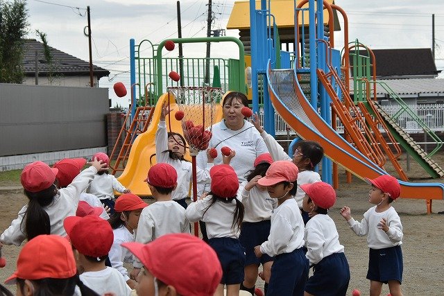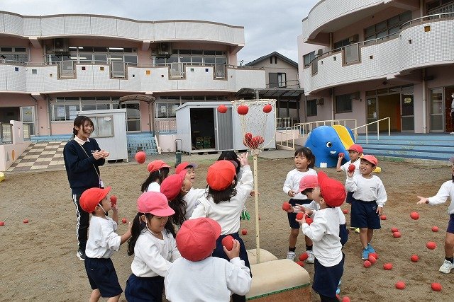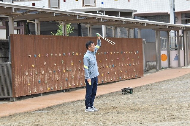 年中組 縄跳びを使っていろんな運動をしました。その後、クラス対抗玉入れゲームをしました。