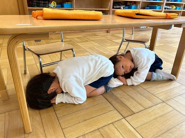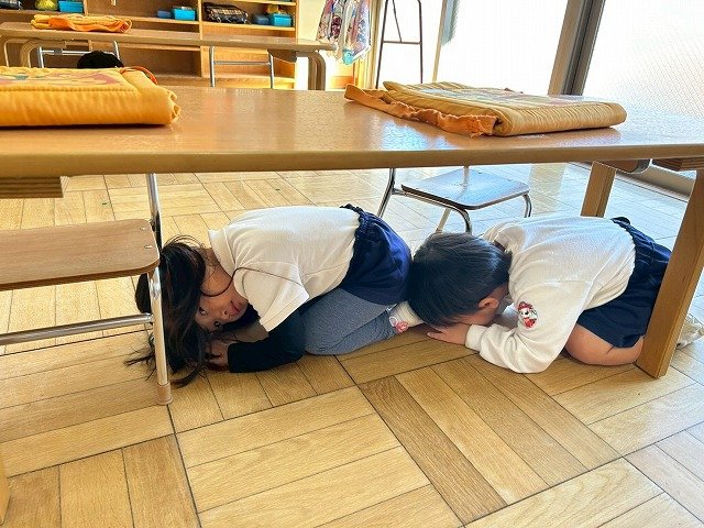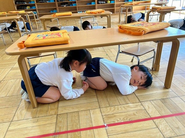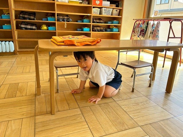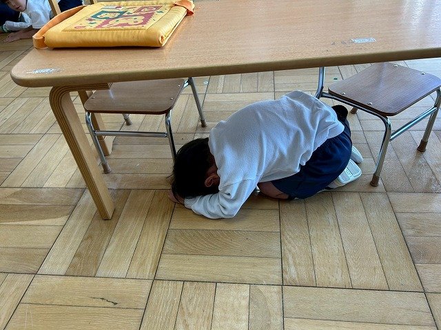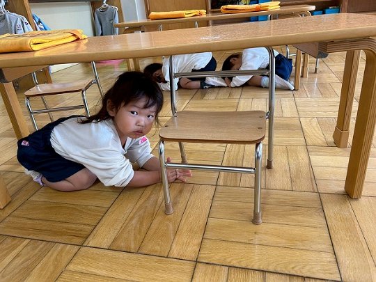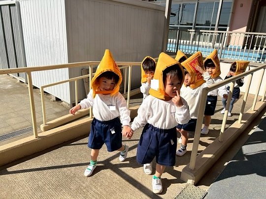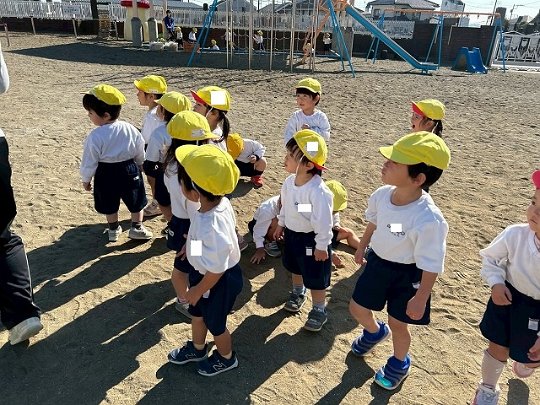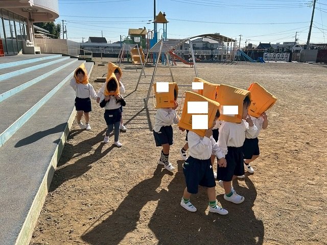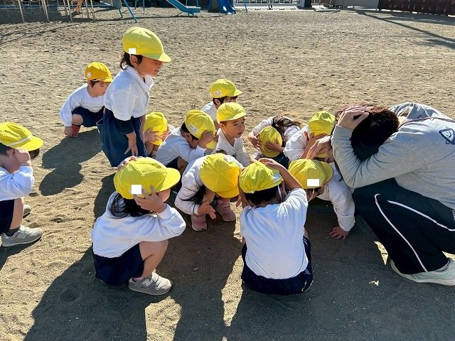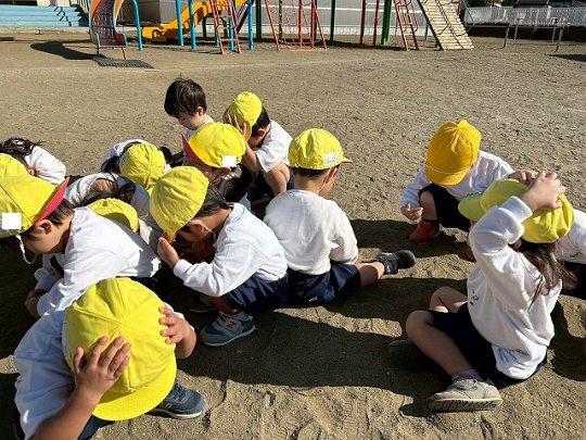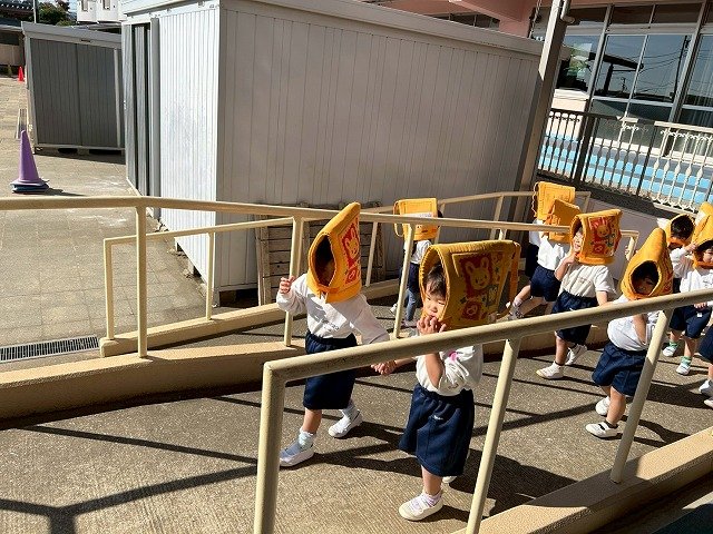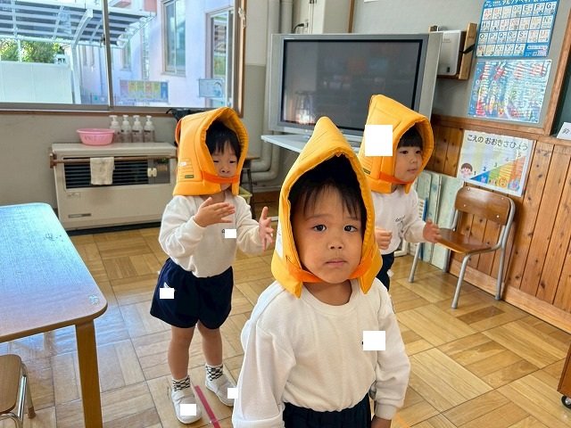 Penguin組 防災頭巾をかぶって園庭に避難する練習をしました
