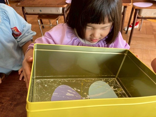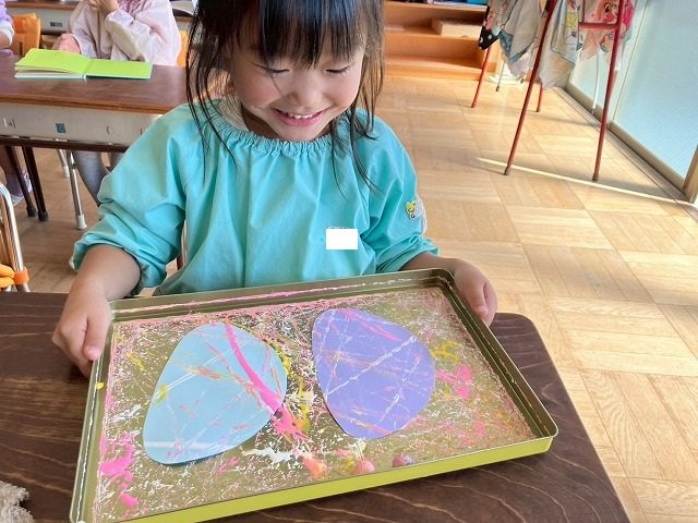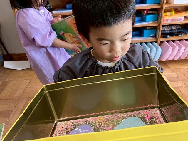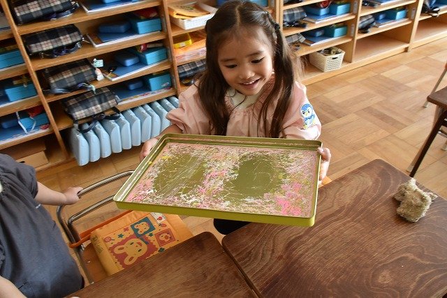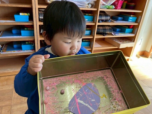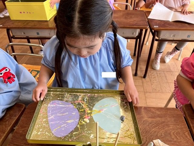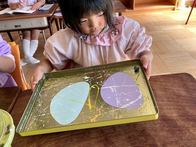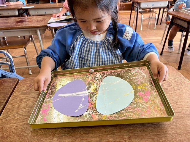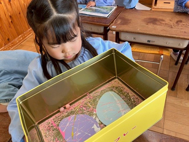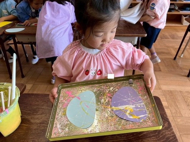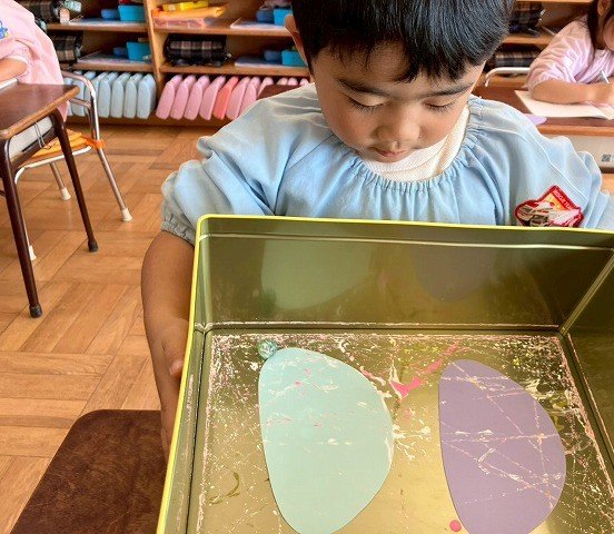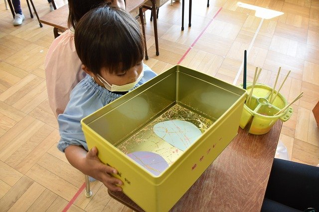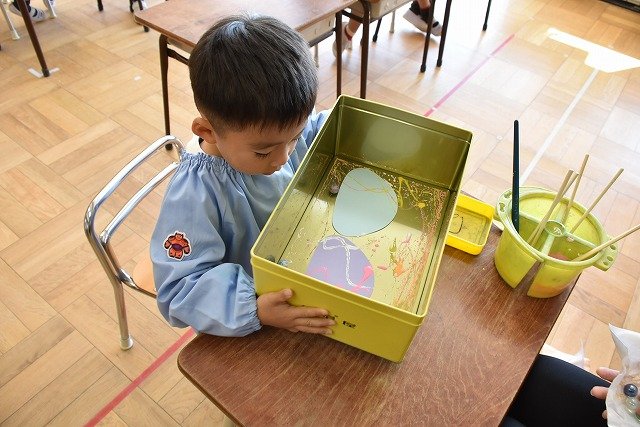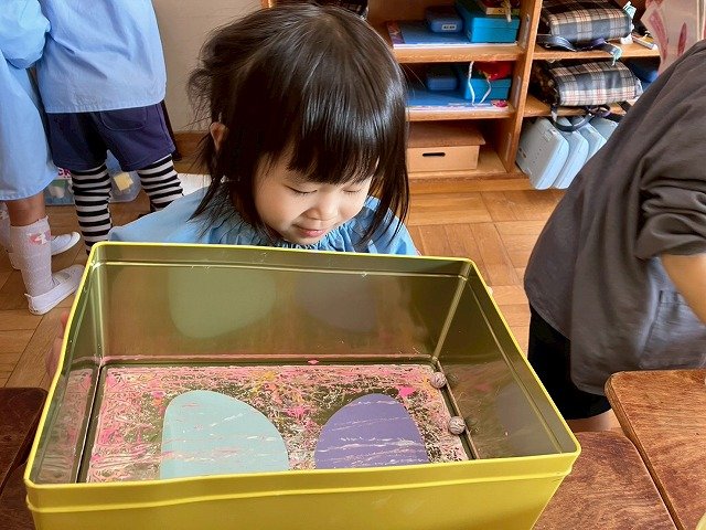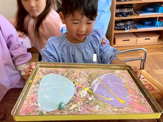 年少組 色をつけたビー玉を転がして模様をつけました。