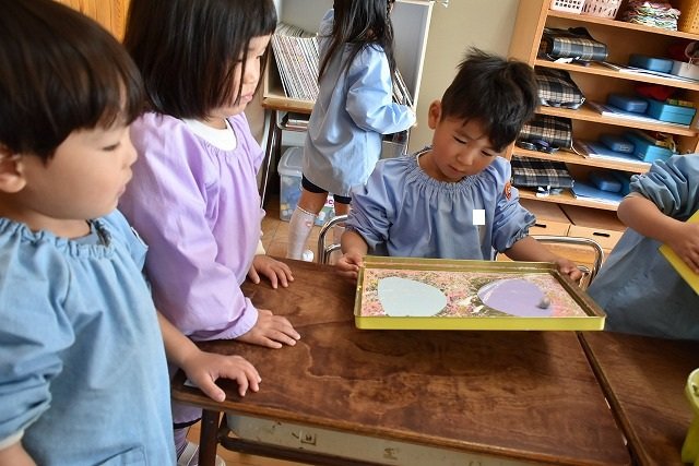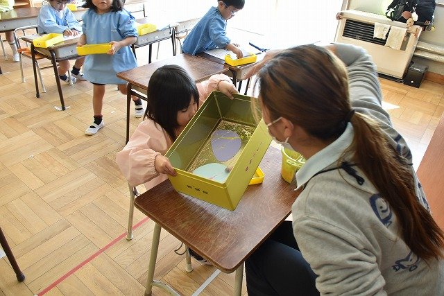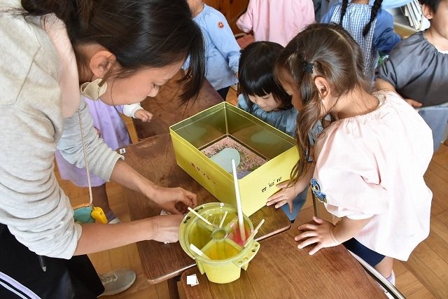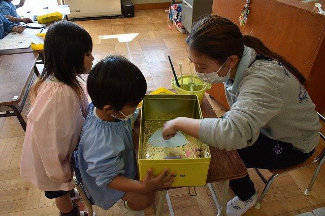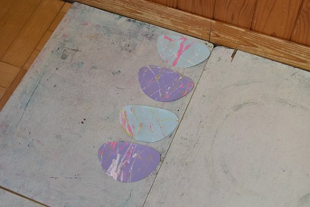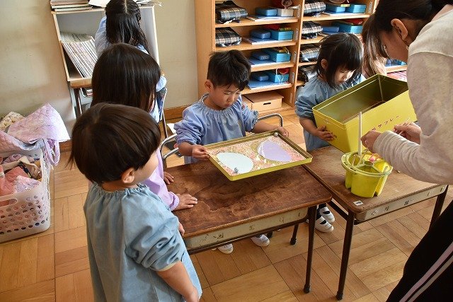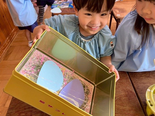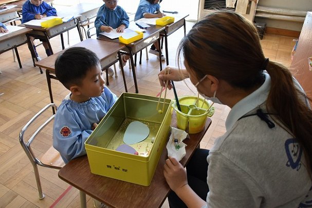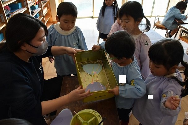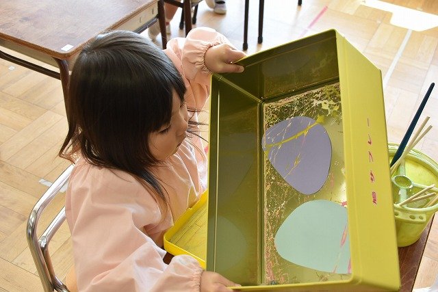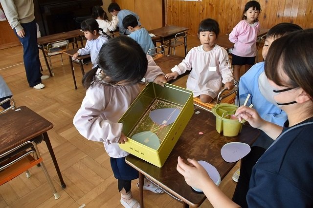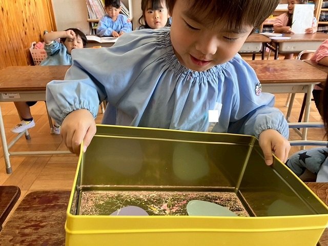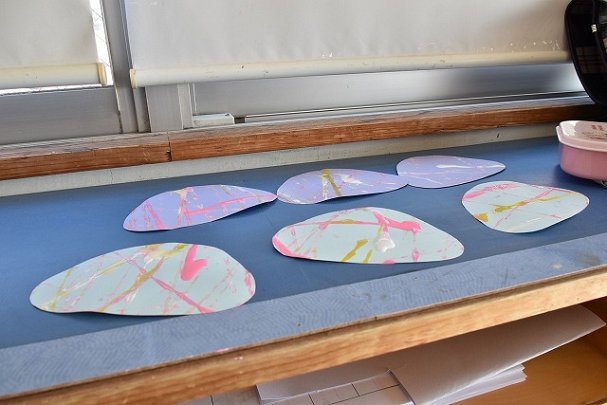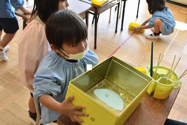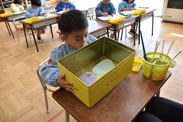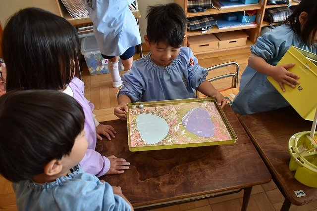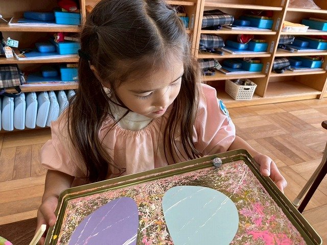 年少組 色をつけたビー玉を転がして模様をつけました。