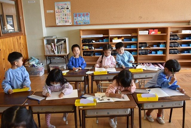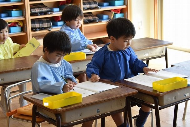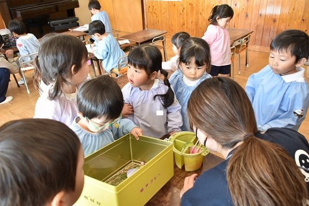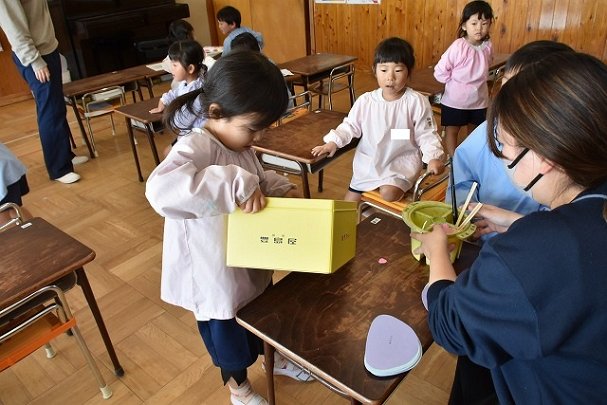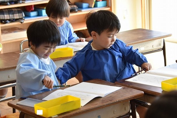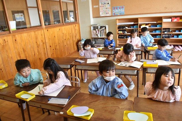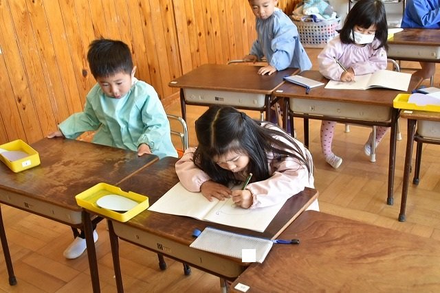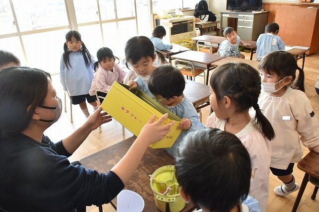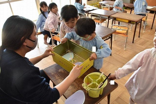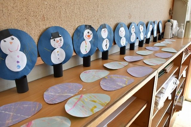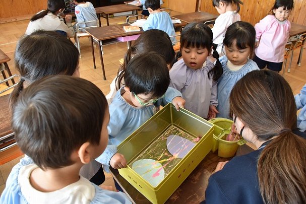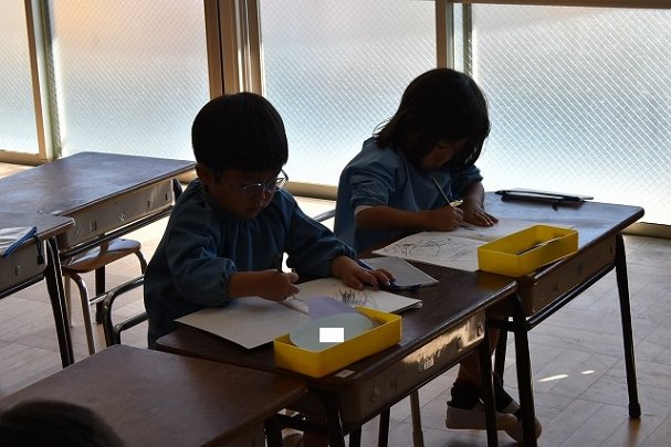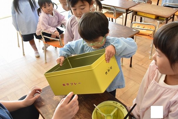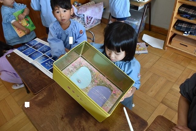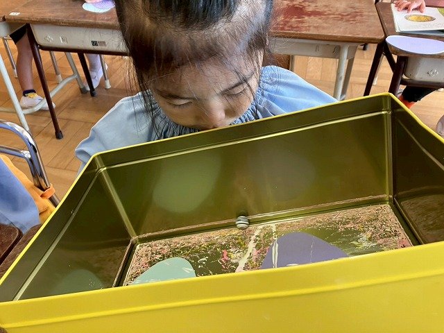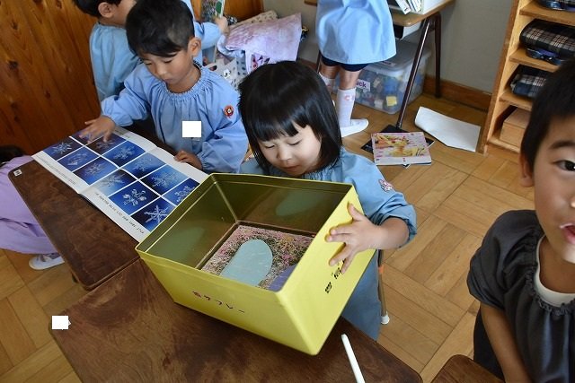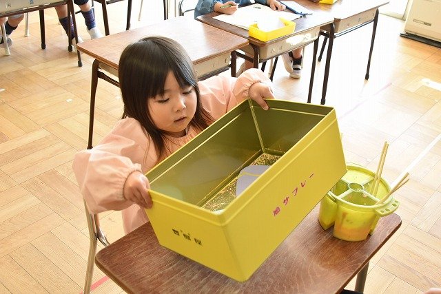 年少組 色をつけたビー玉を転がして模様をつけました。