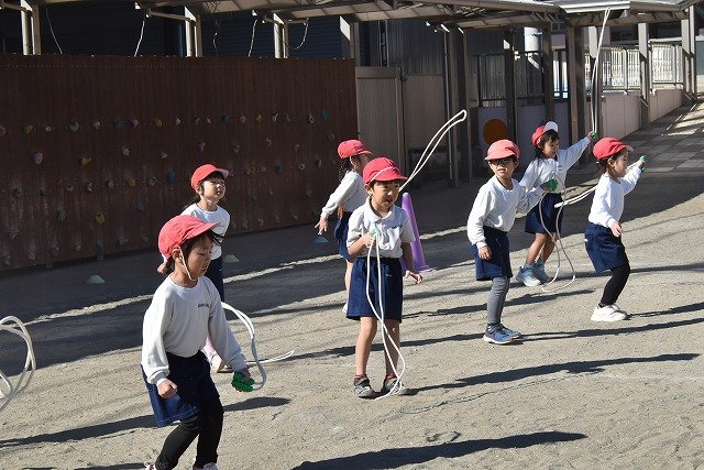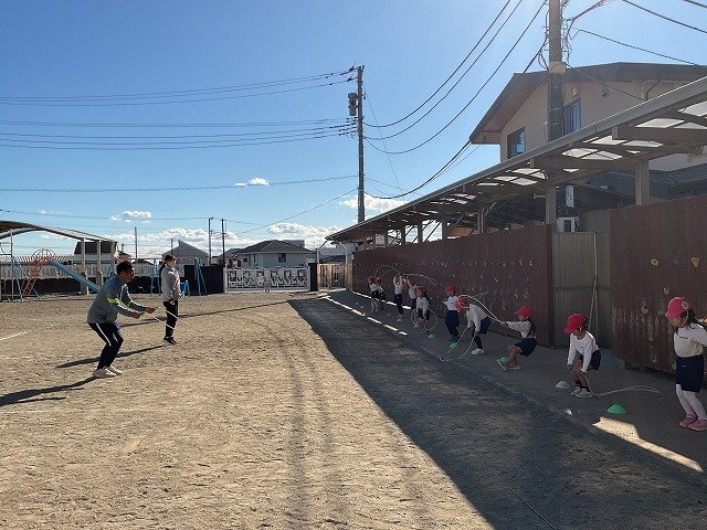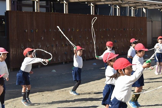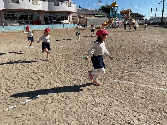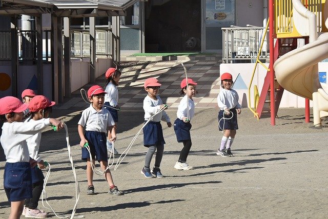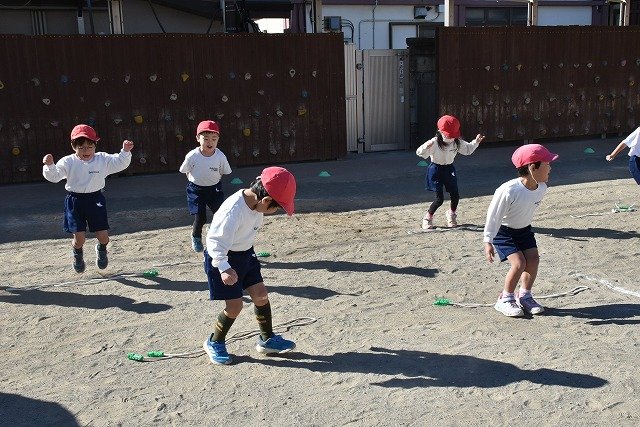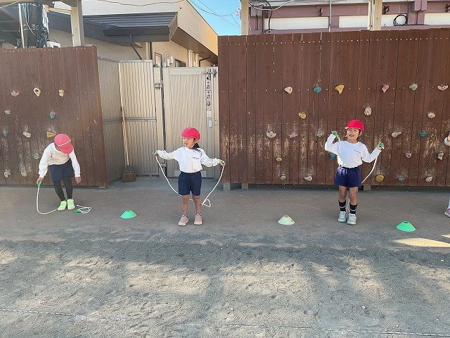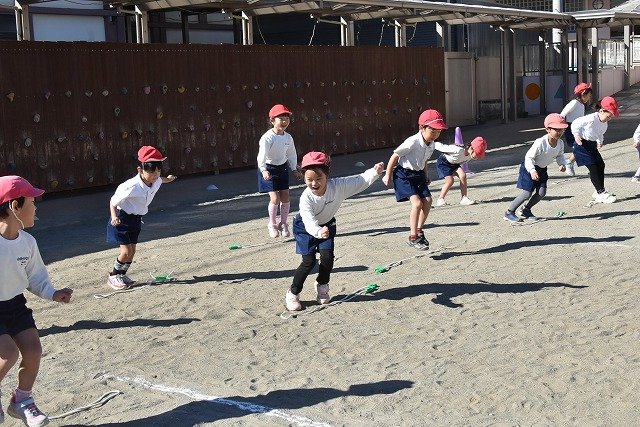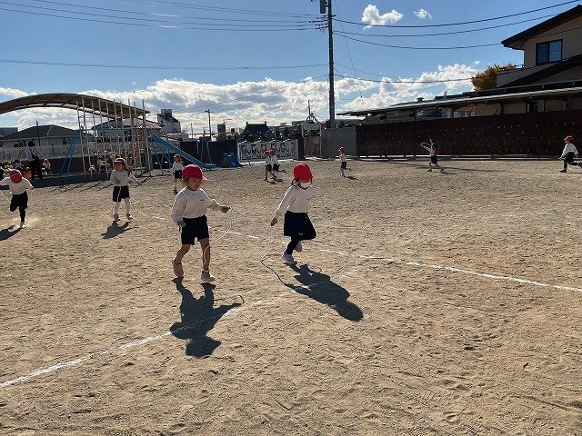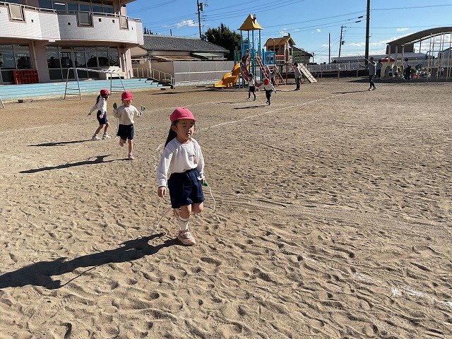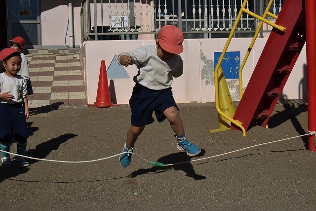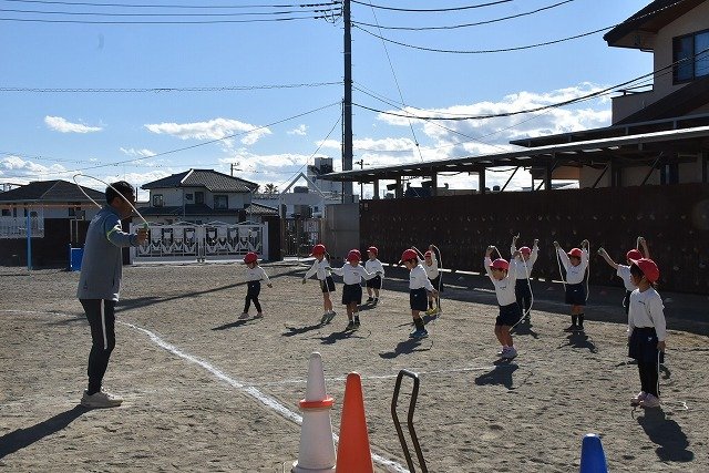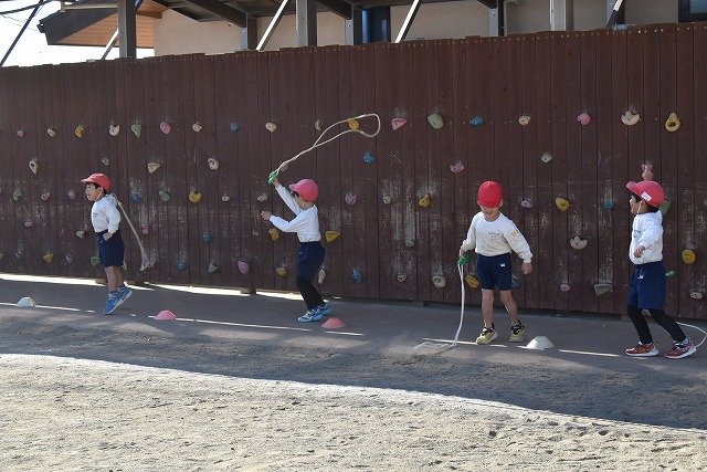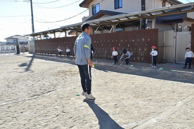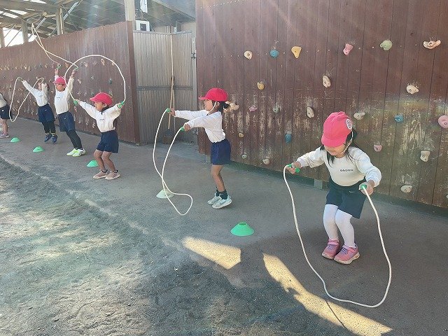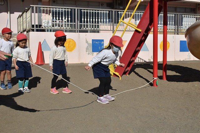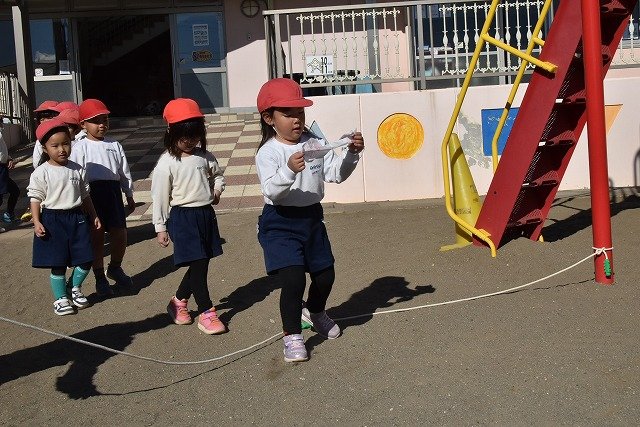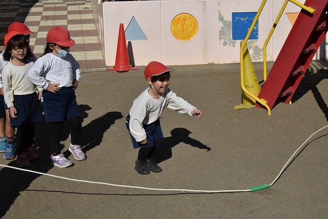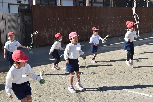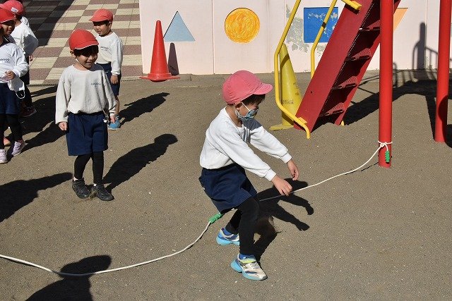年中組 なわとびを使って体を動かしました。最後にリレーをしました。