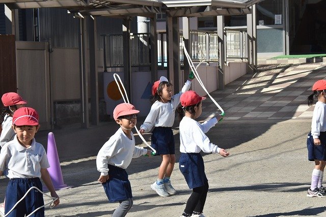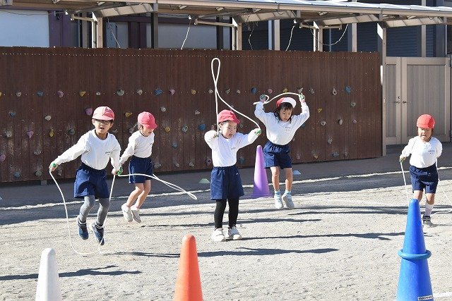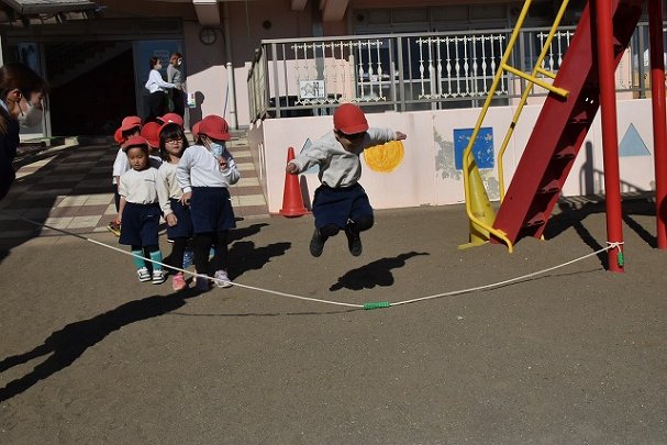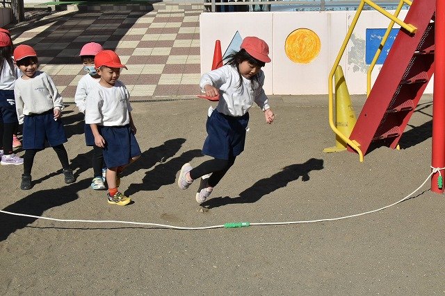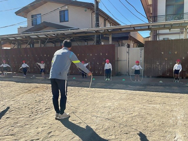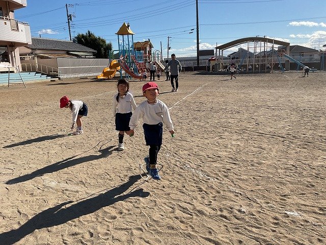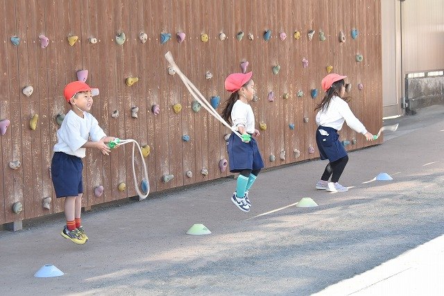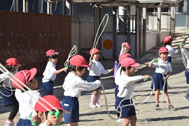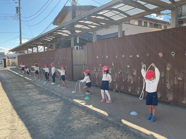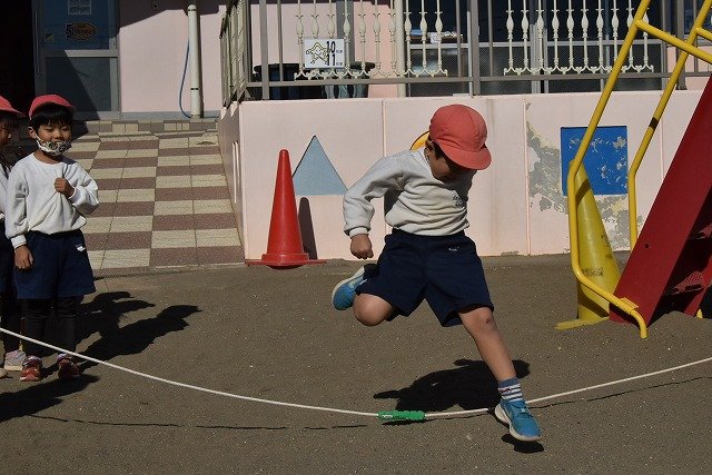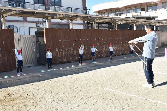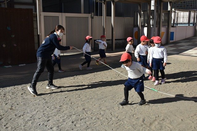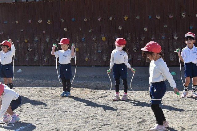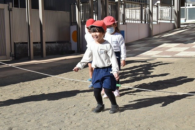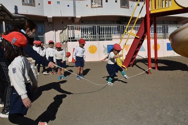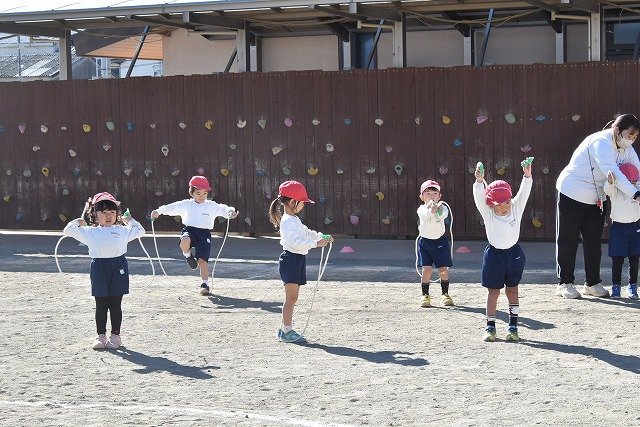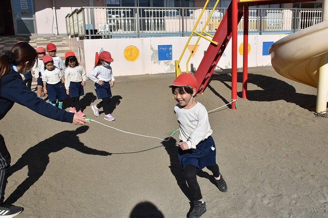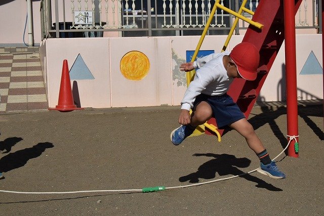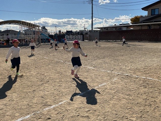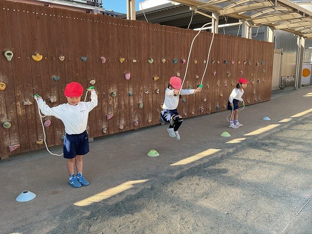 年中組 なわとびを使って体を動かしました。最後にリレーをしました。