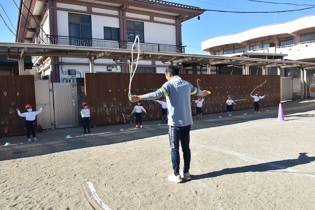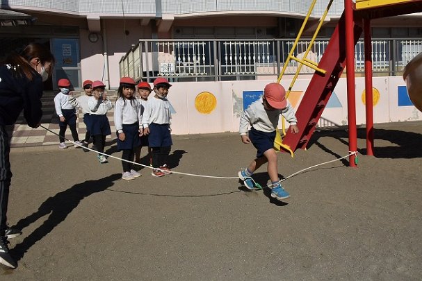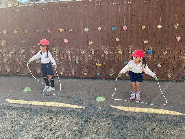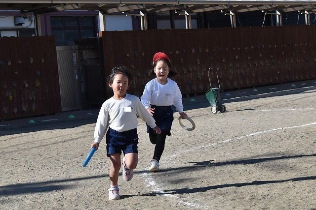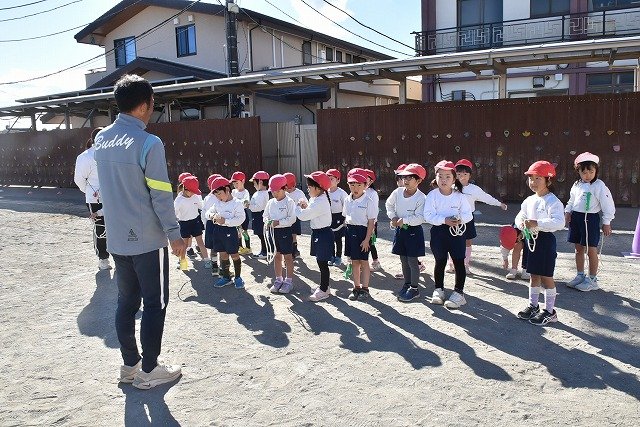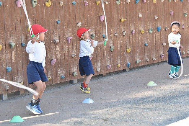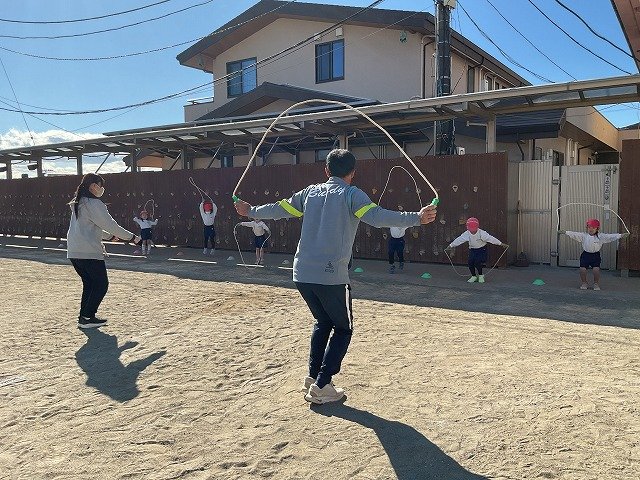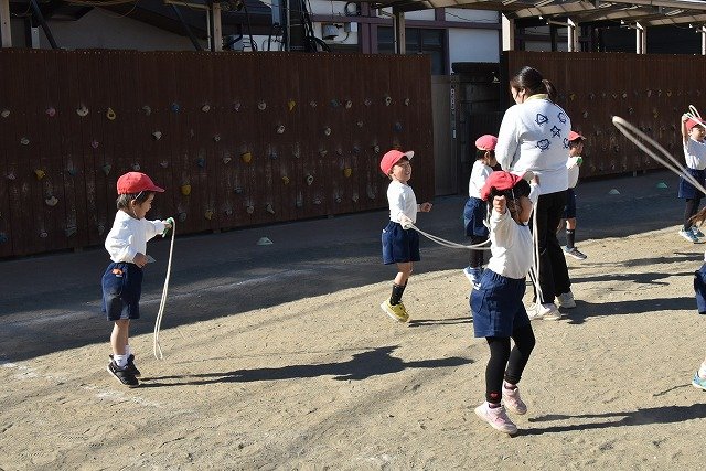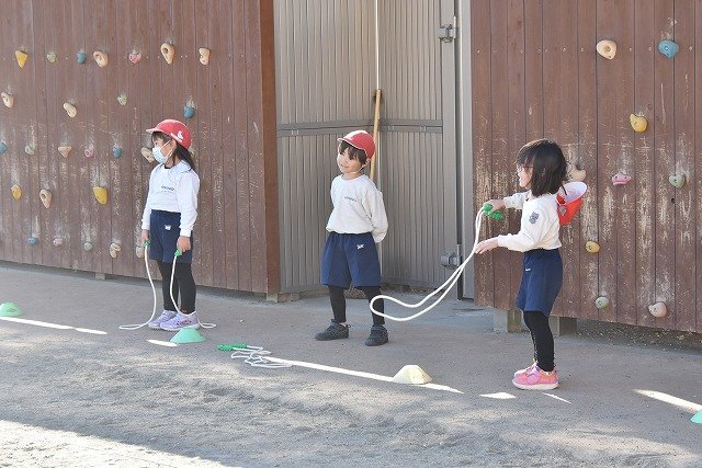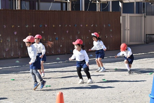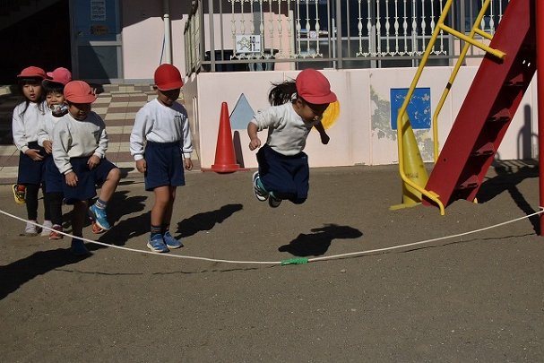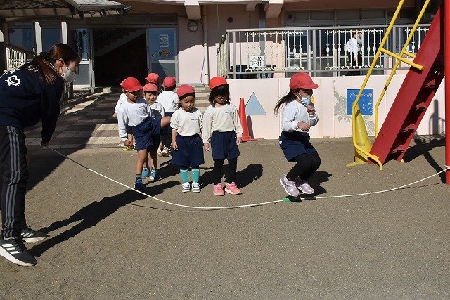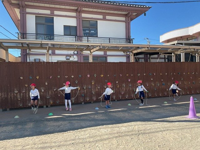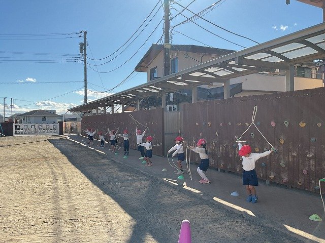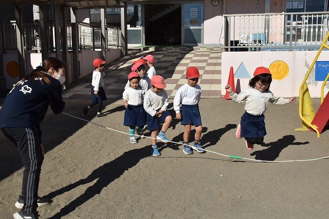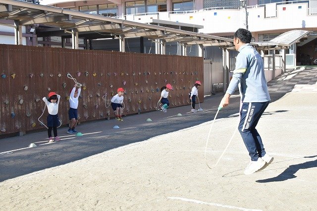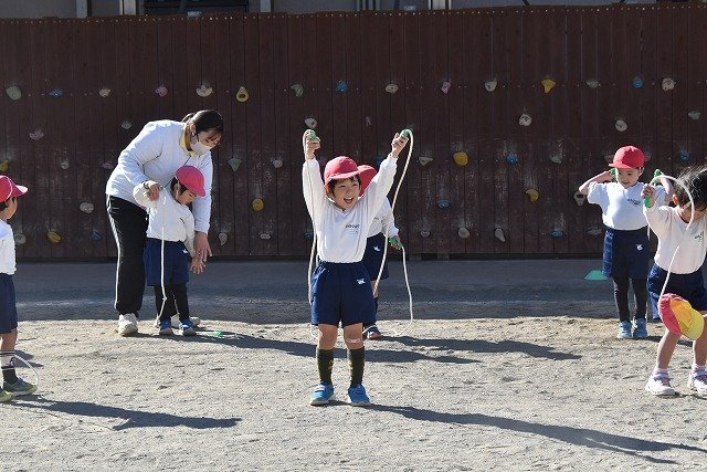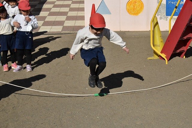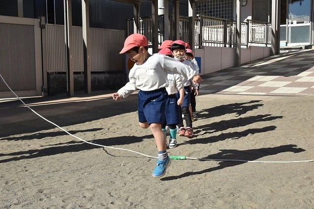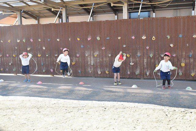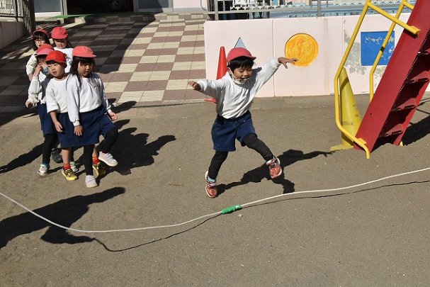 年中組 なわとびを使って体を動かしました。最後にリレーをしました。