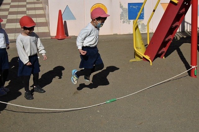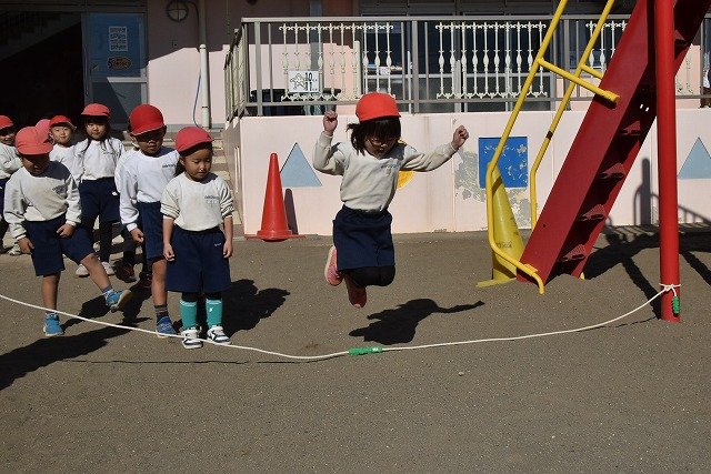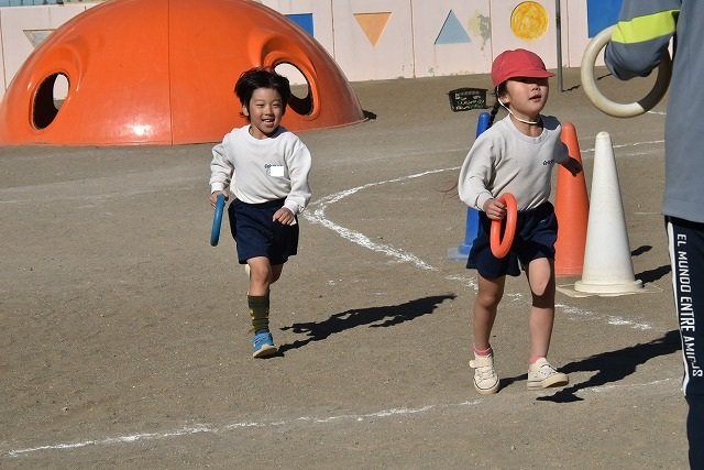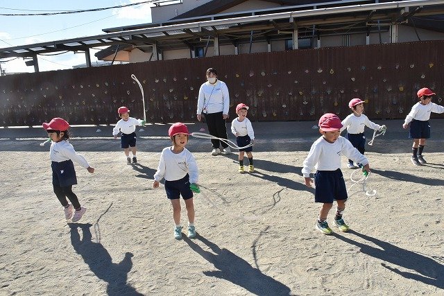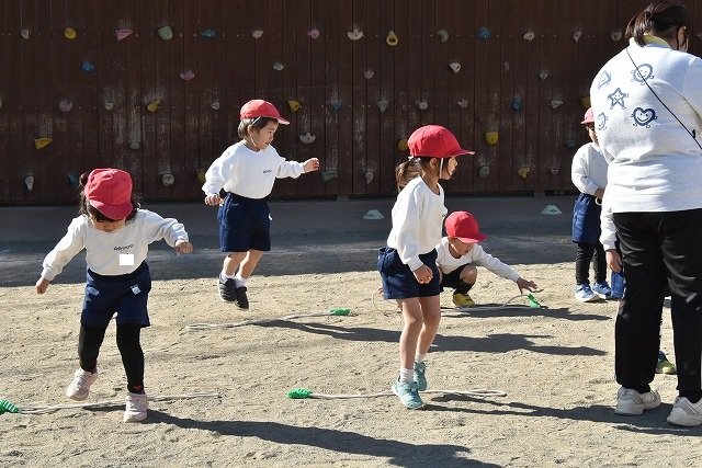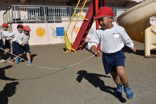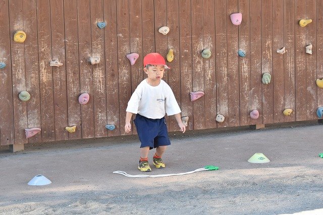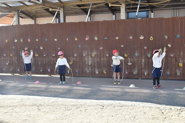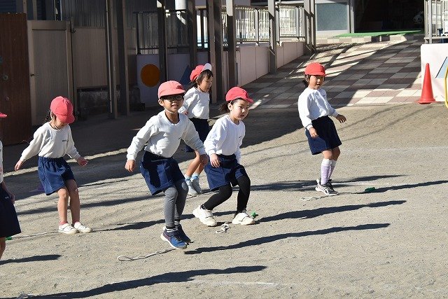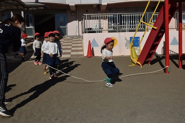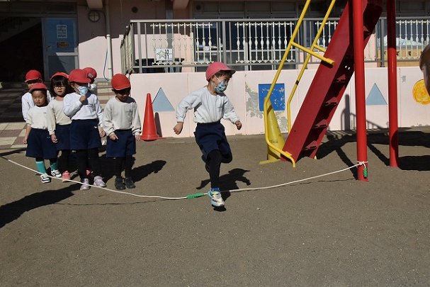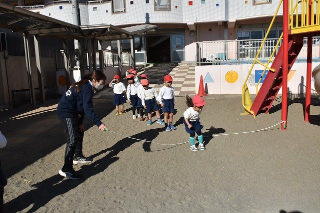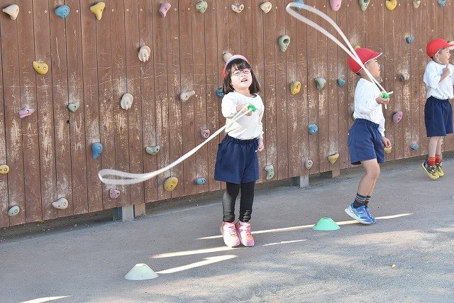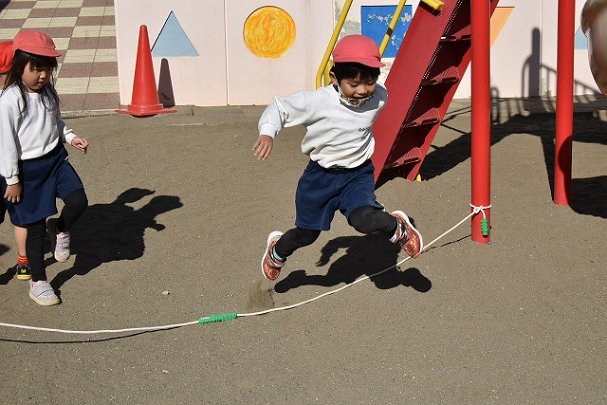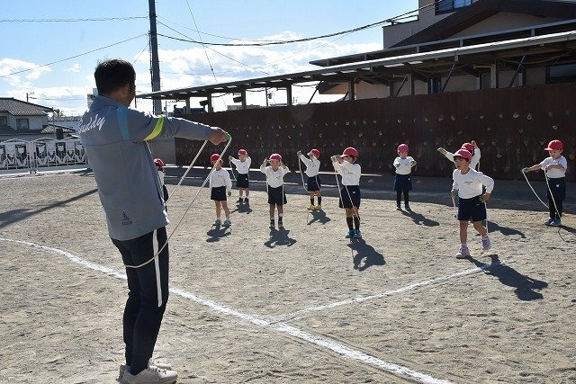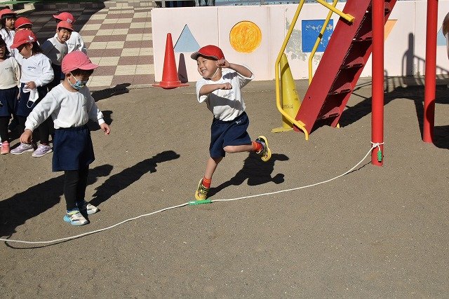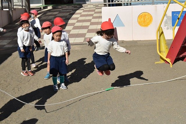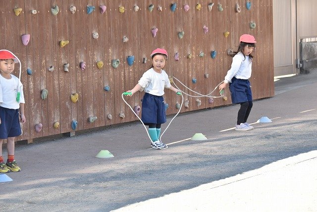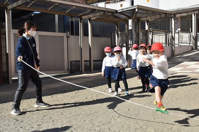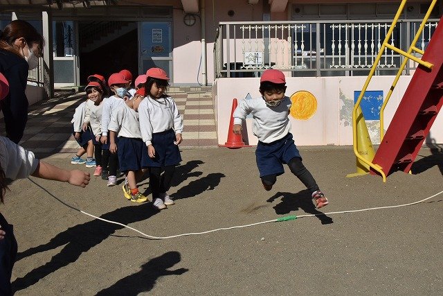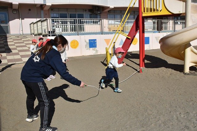 年中組 なわとびを使って体を動かしました。最後にリレーをしました。