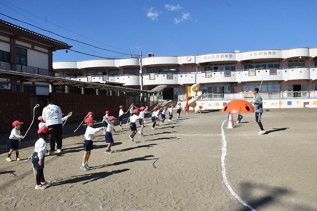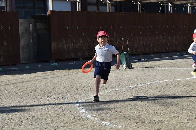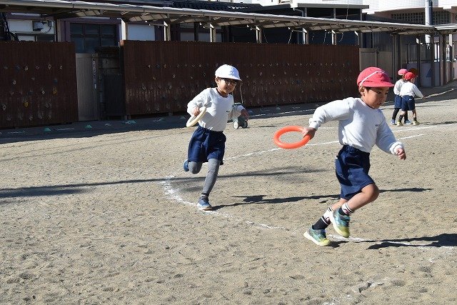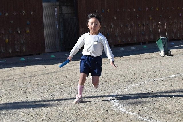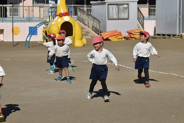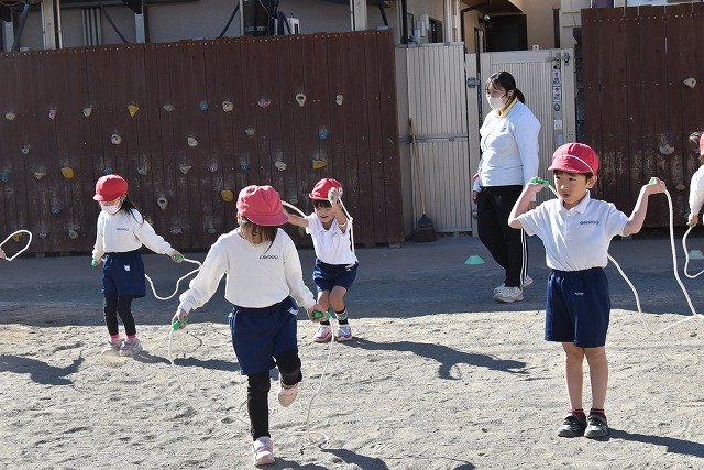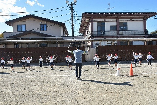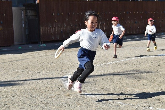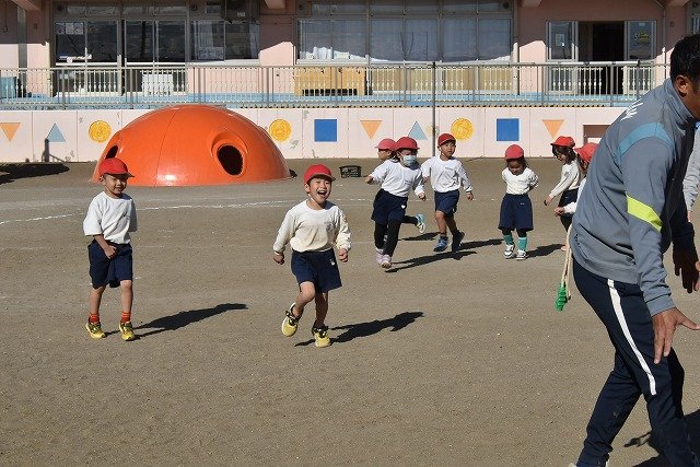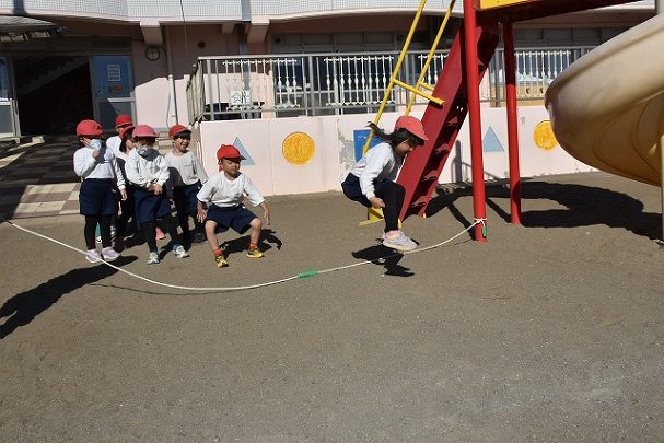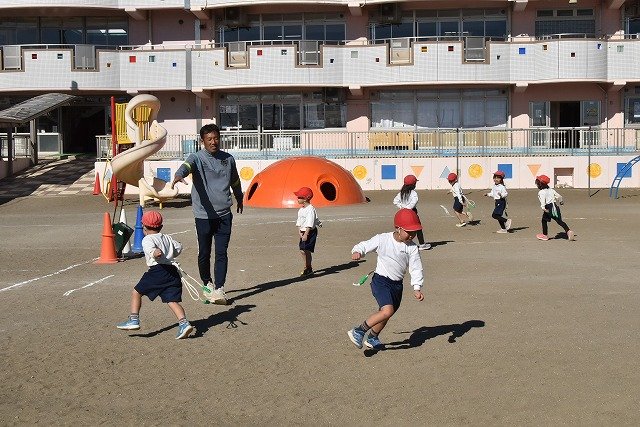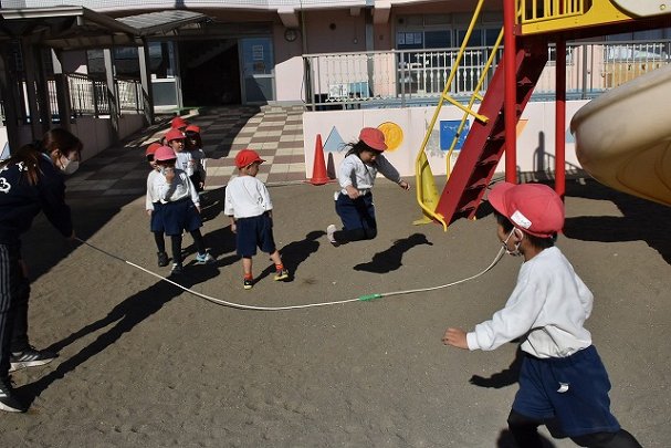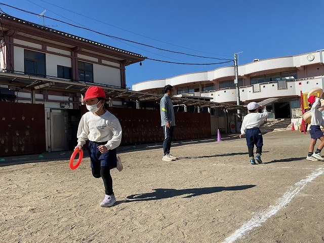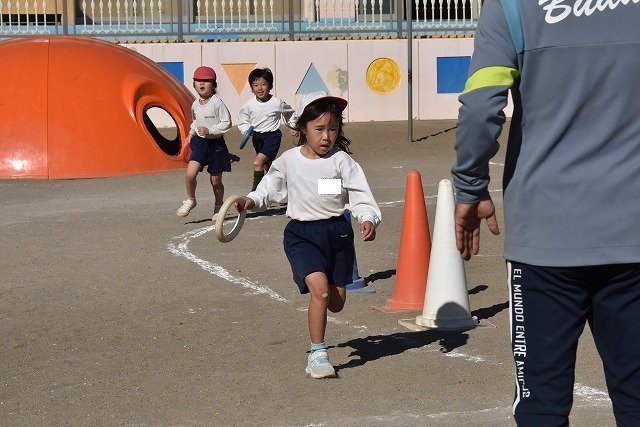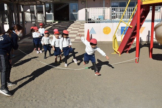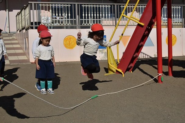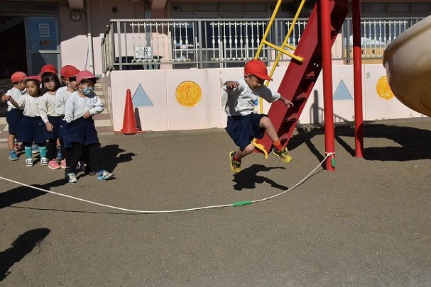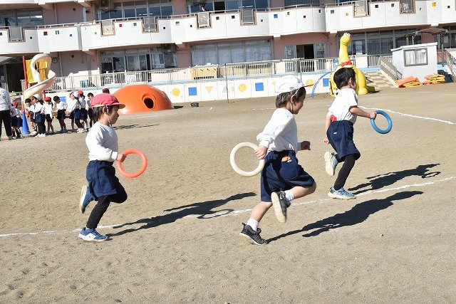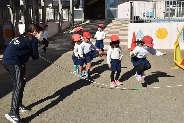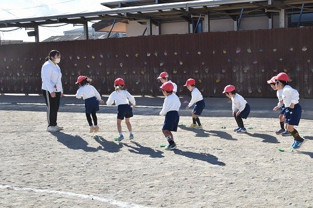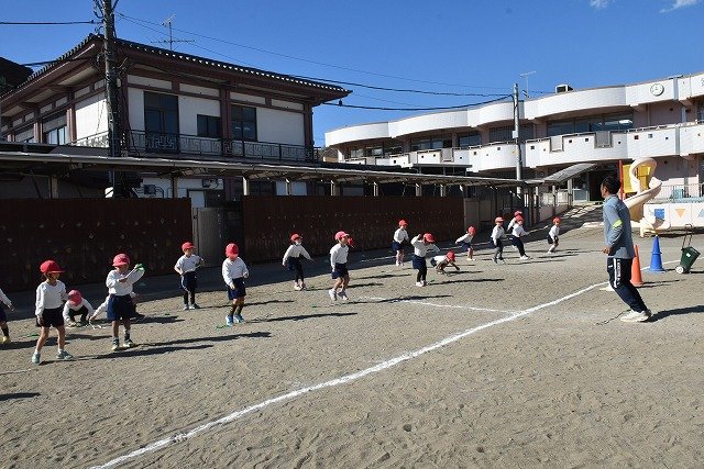 年中組 なわとびを使って体を動かしました。最後にリレーをしました。