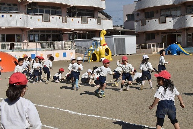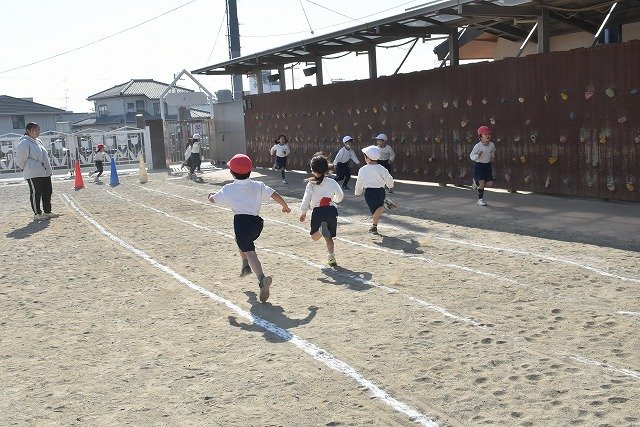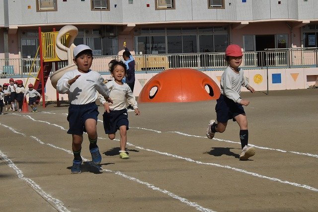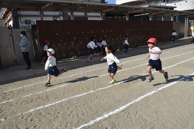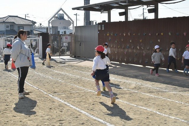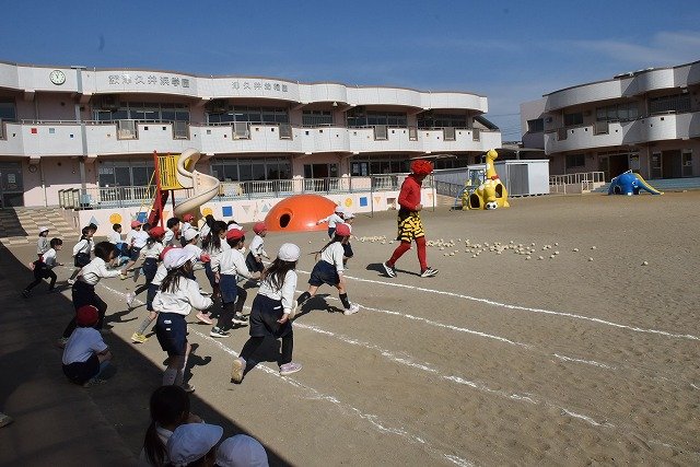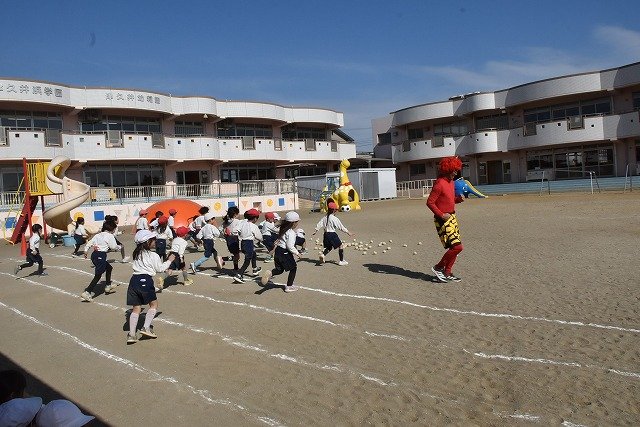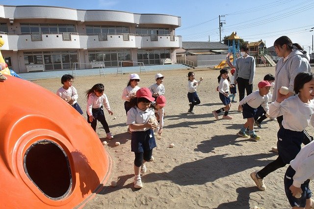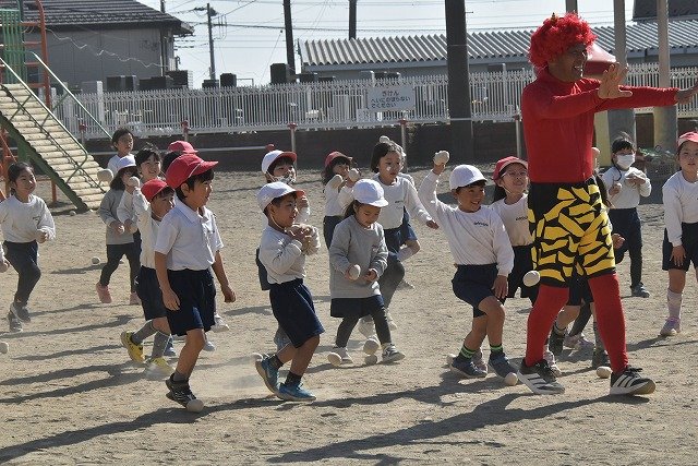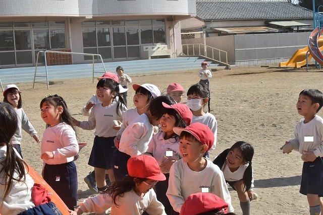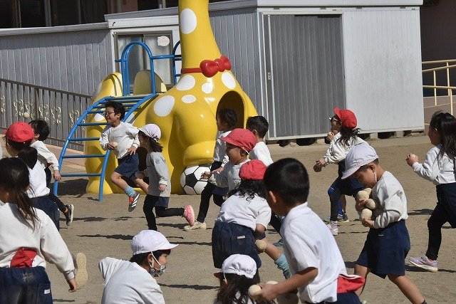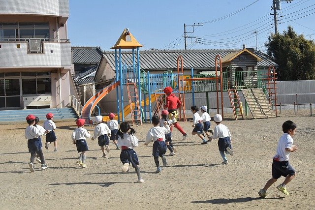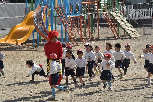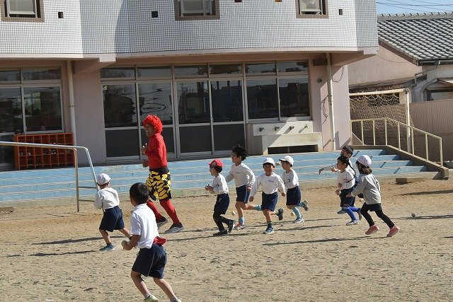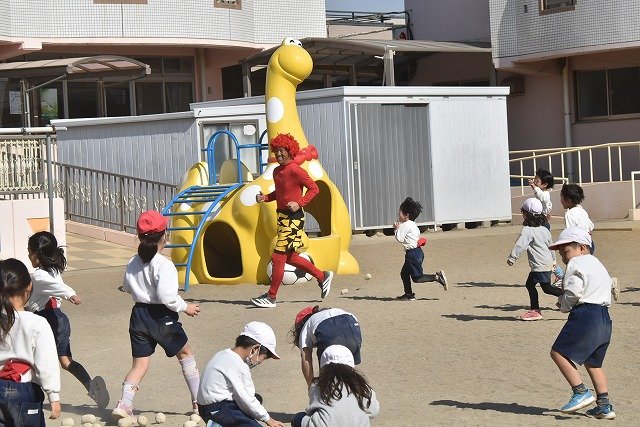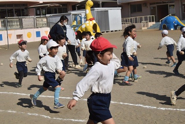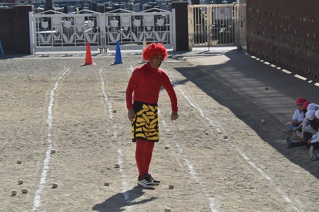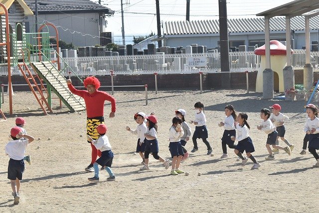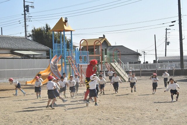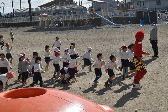 年中組 50m走の練習をした後、鬼に扮した関口先生に玉を投げるゲームをしました。とても楽しそうでした♪