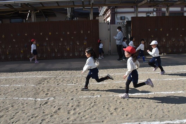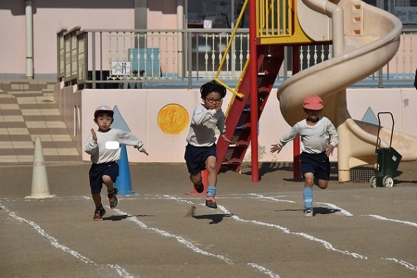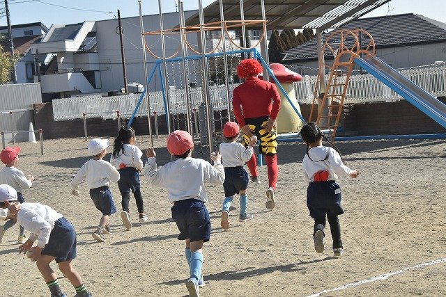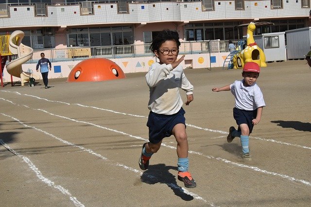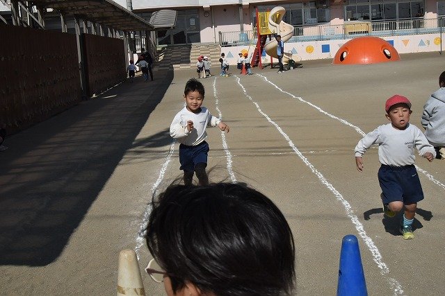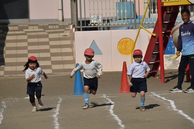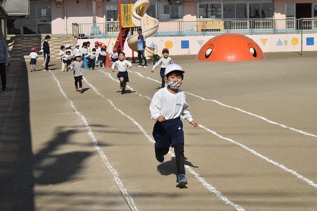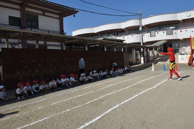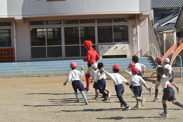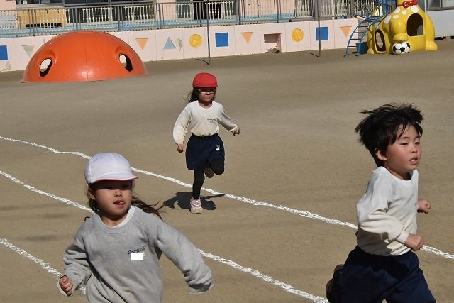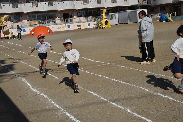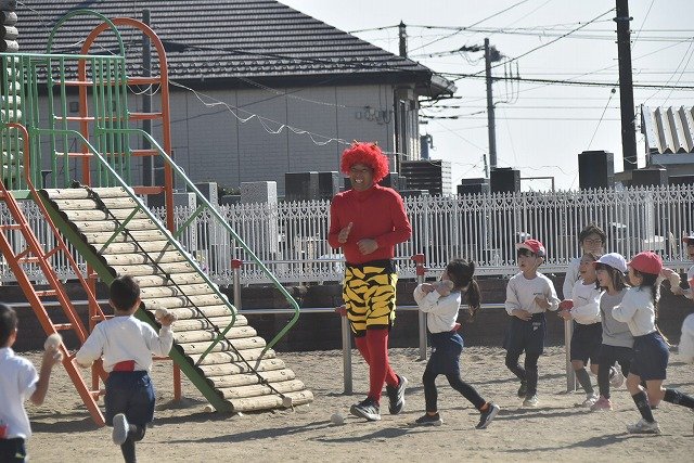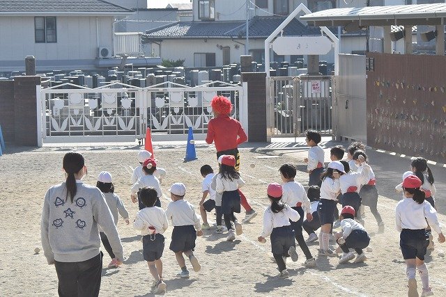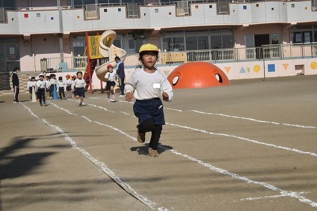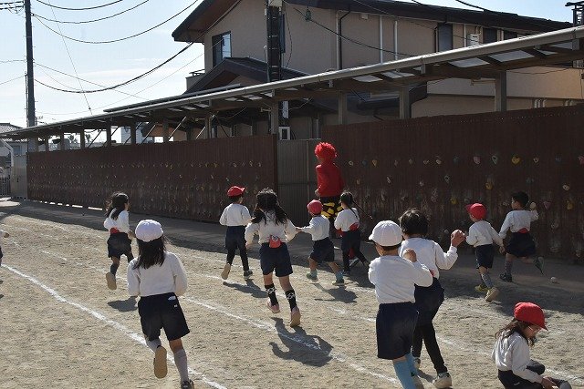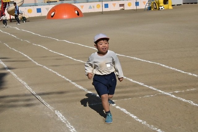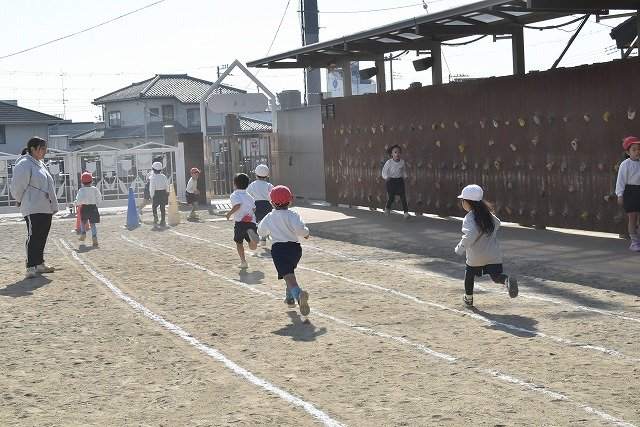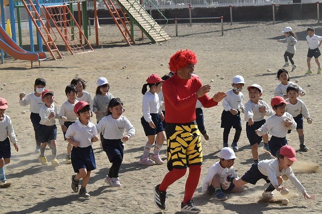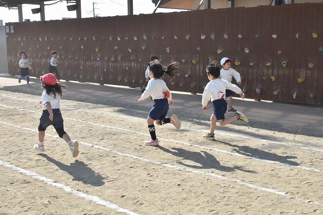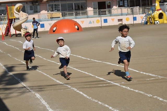 年中組 50m走の練習をした後、鬼に扮した関口先生に玉を投げるゲームをしました。とても楽しそうでした♪