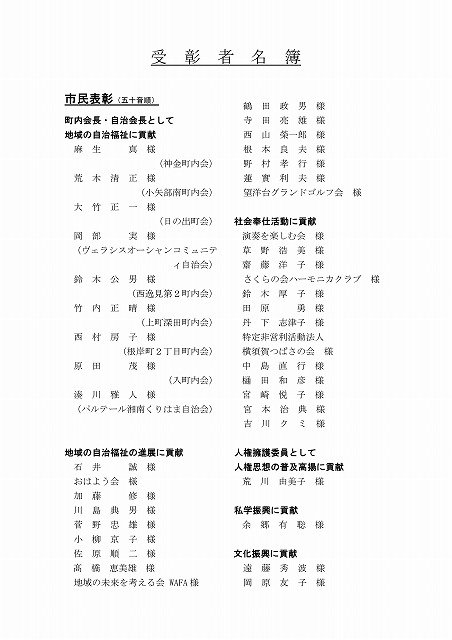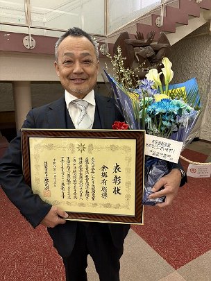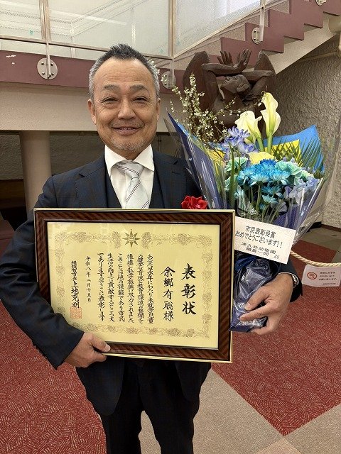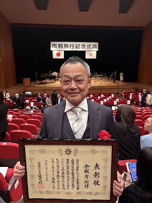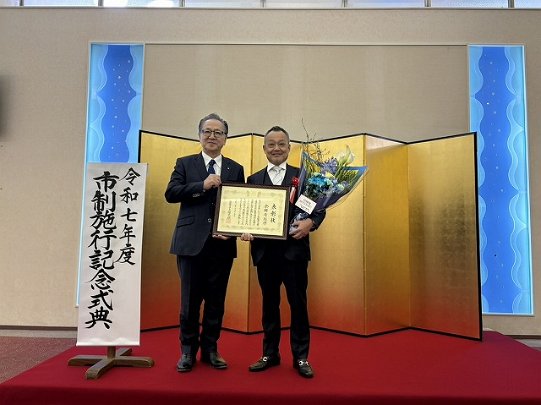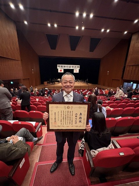 余郷園長が市民表彰されました。市民表彰は、住みよい社会づくりに尽力し、市民生活の向上に貢献された方々をたたえる表彰です。令和8年2月15日(日曜日)に横須賀市文化会館大ホールで行われた市制施行記念式典において、市長から表彰状と記念品が贈られました。