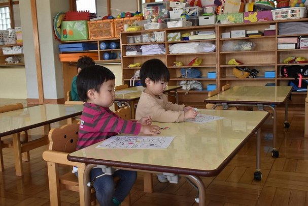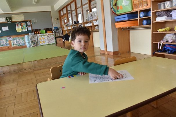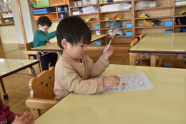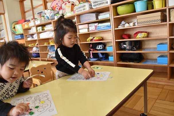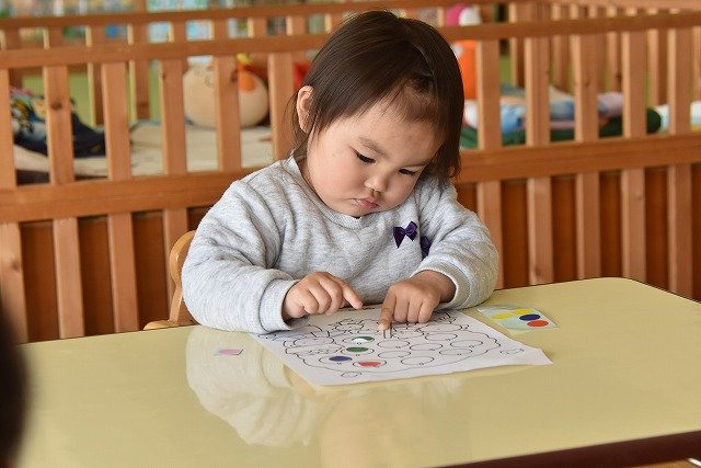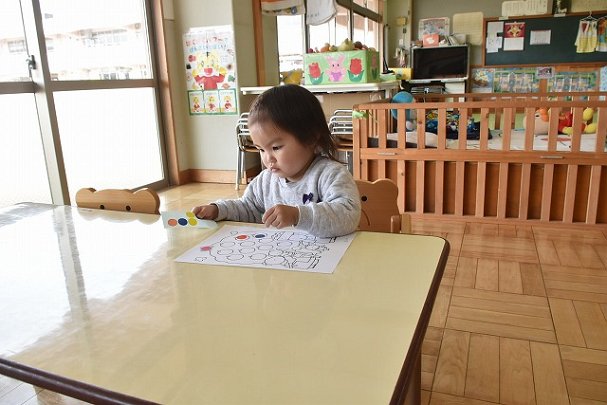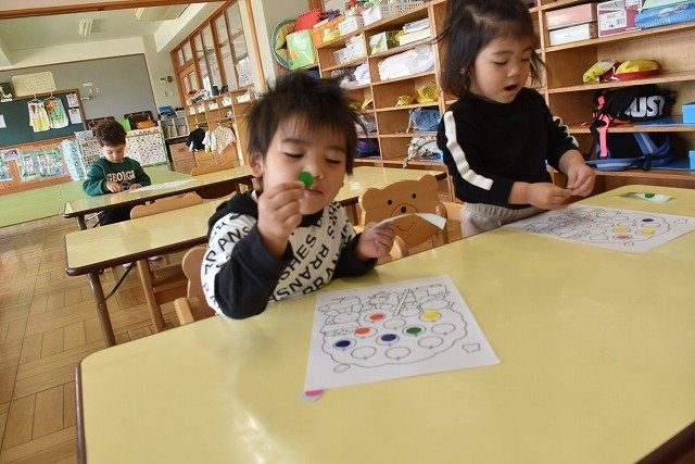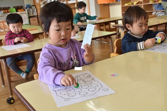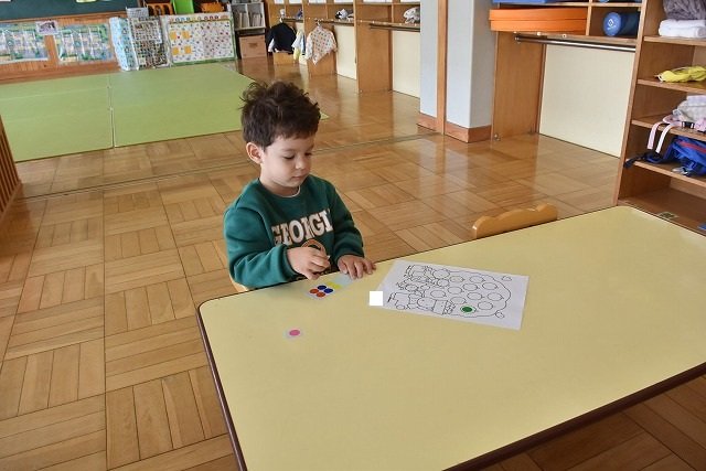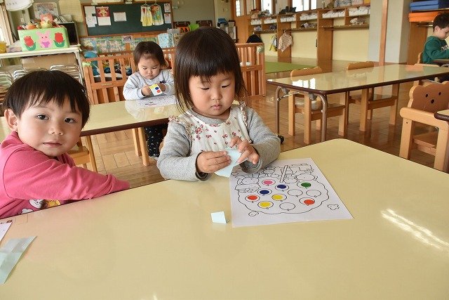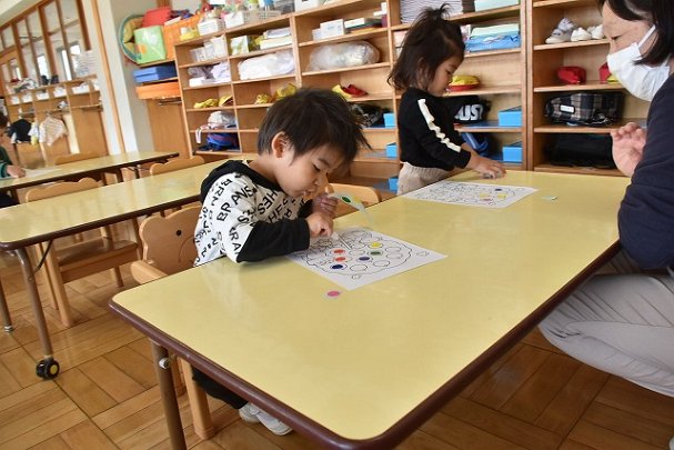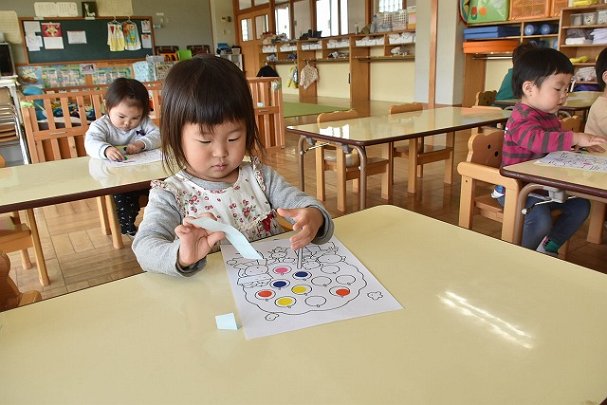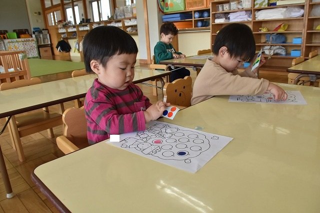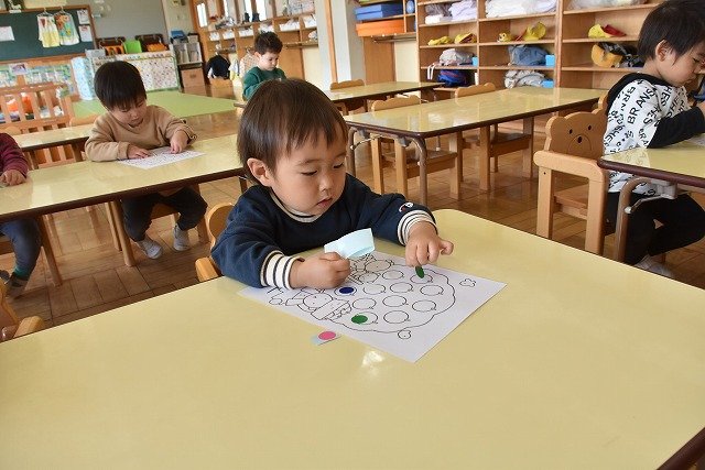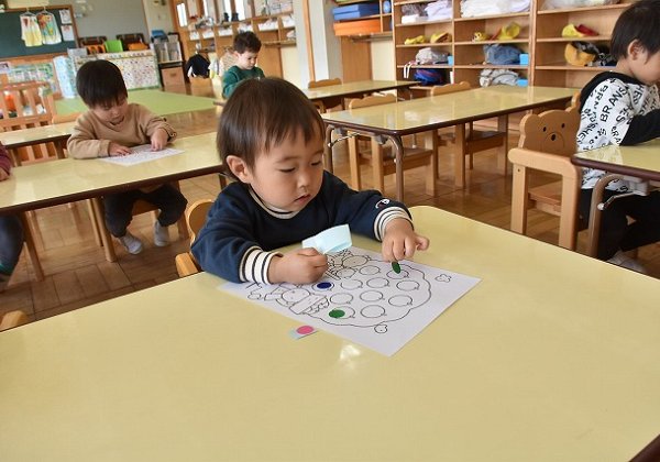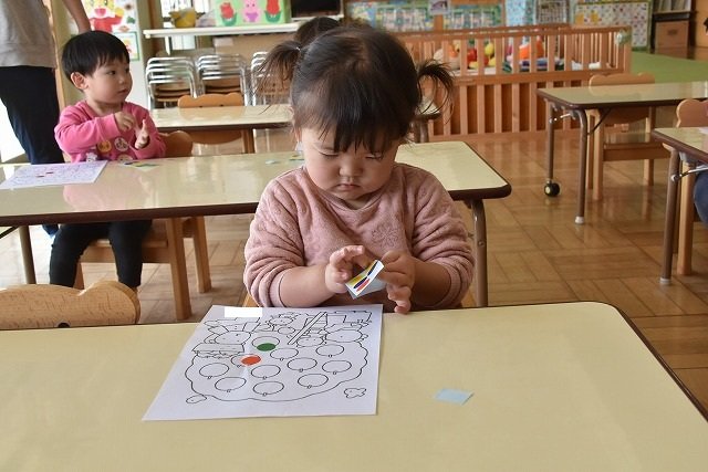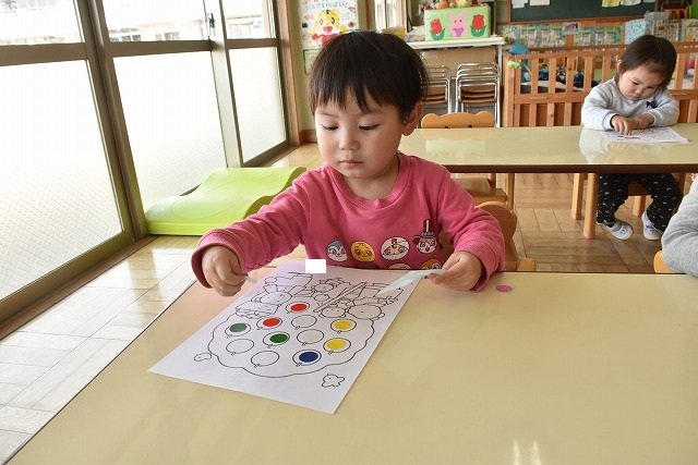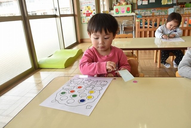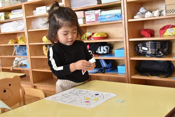 シール遊びをしました。指先が器用に使えるようになり上手に貼れました。