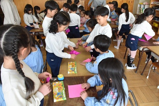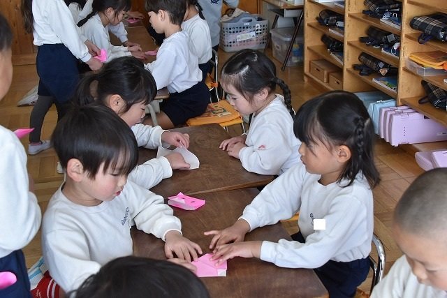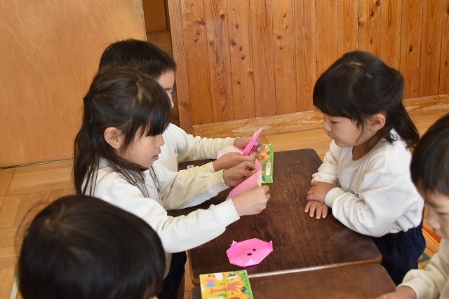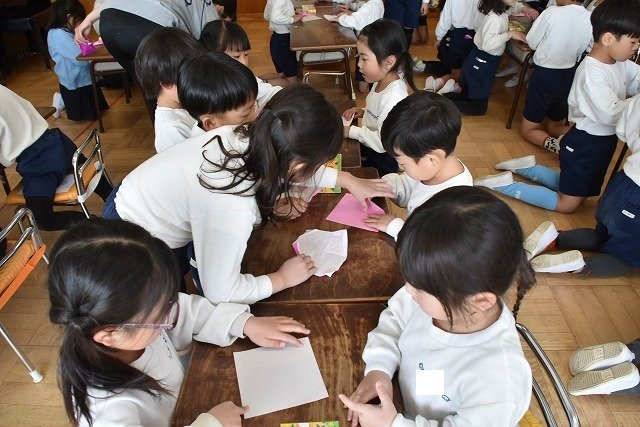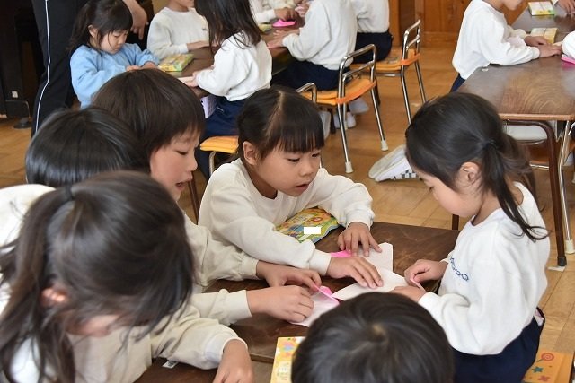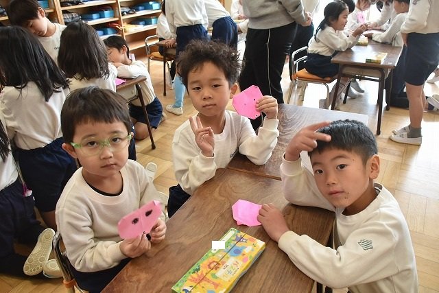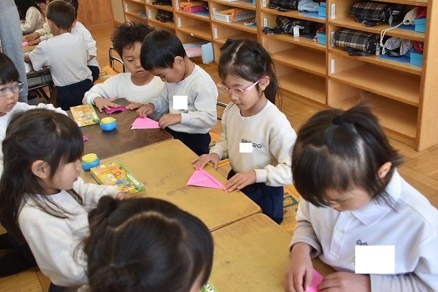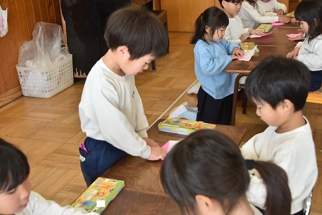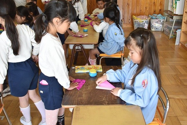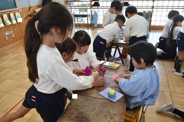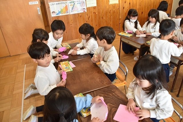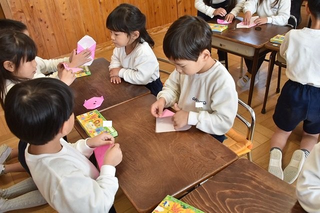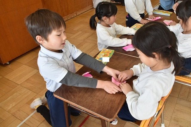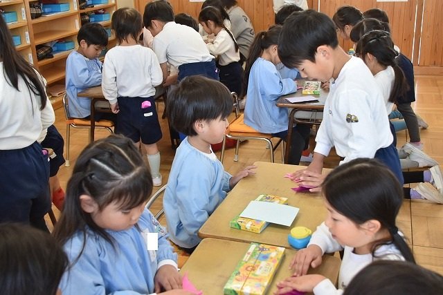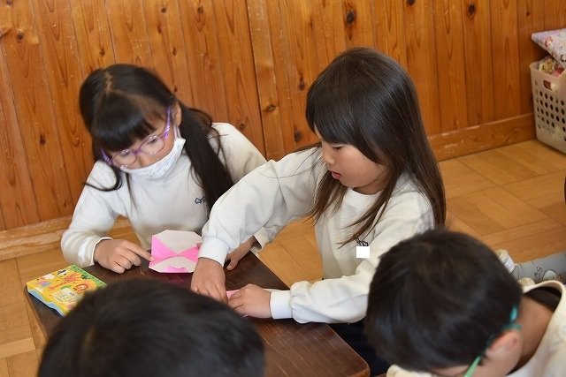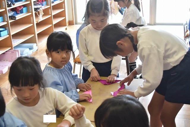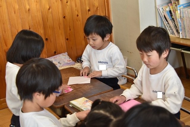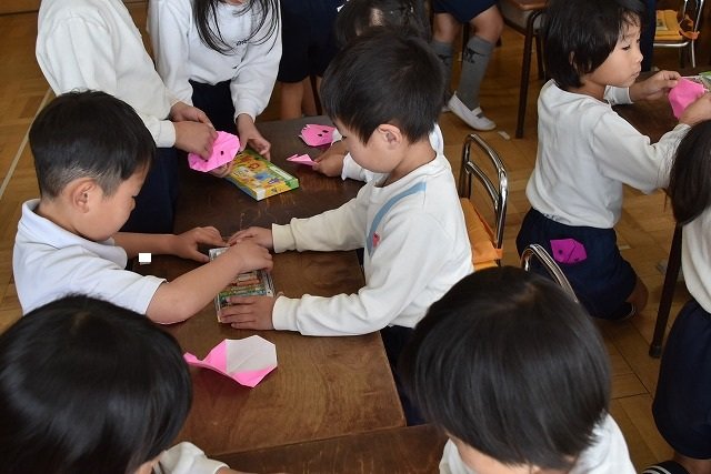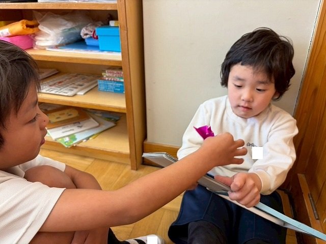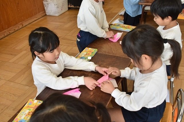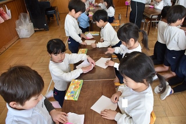 年長のお友だちが各クラスをまわり、一緒に折り紙をおったり、絵本を読んであげたりして楽しい時間を過ごしました