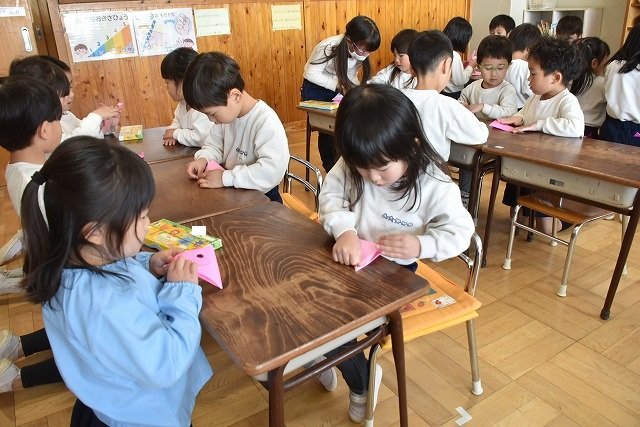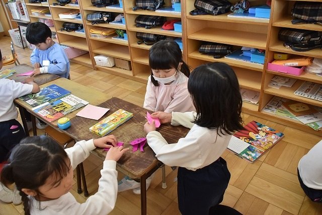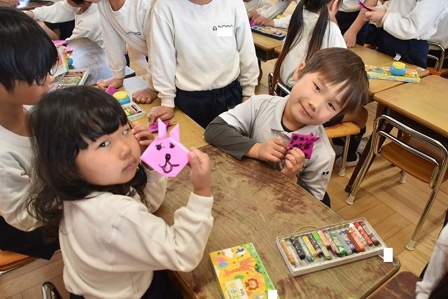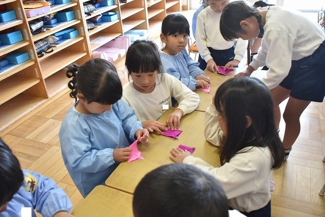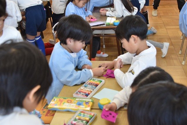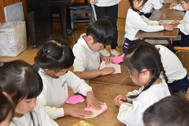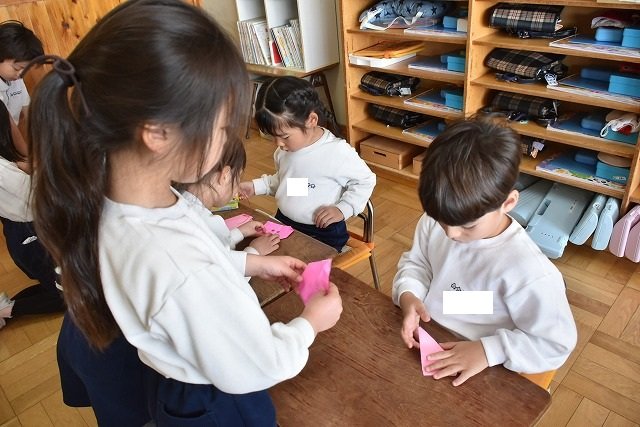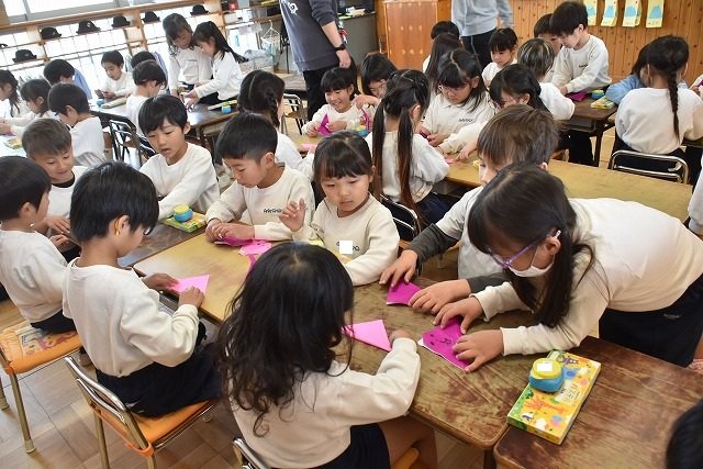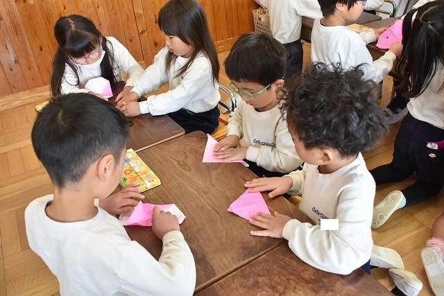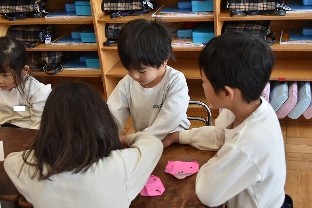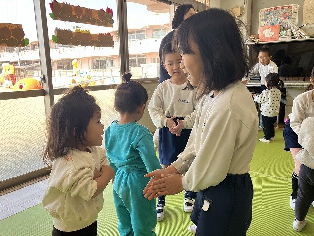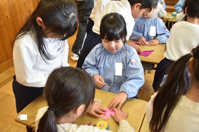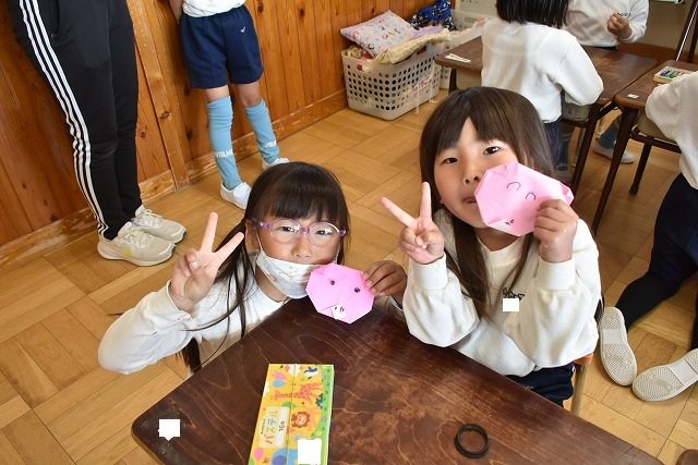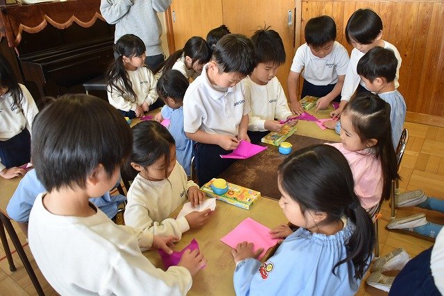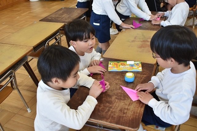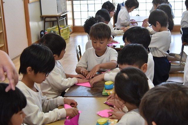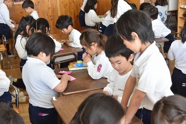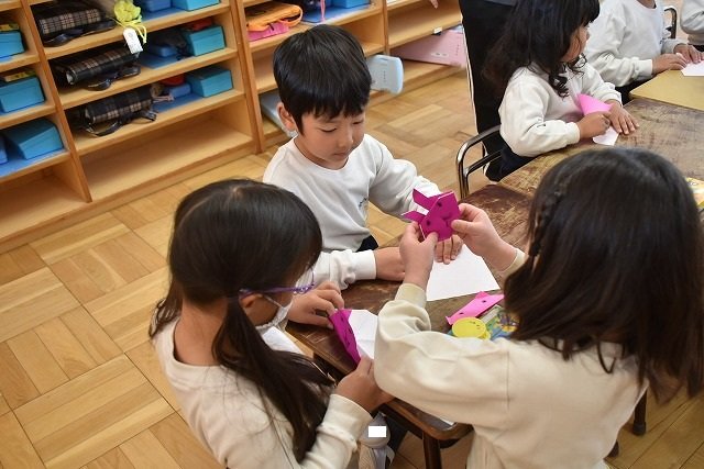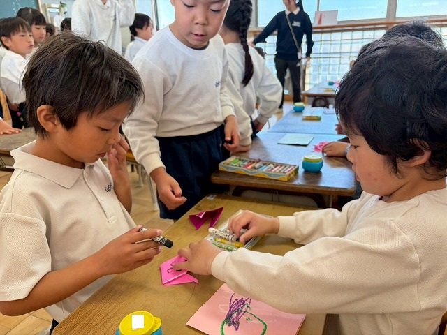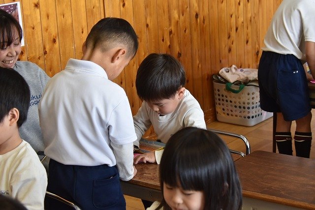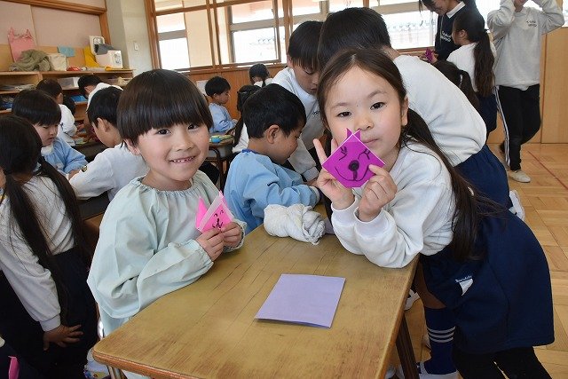 年長のお友だちが各クラスをまわり、一緒に折り紙をおったり、絵本を読んであげたりして楽しい時間を過ごしました