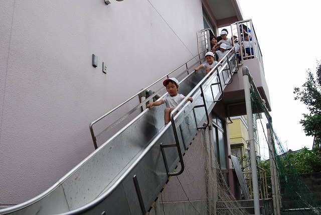避難訓練 年長組のお友達が避難用滑り台使用の避難訓練をしました