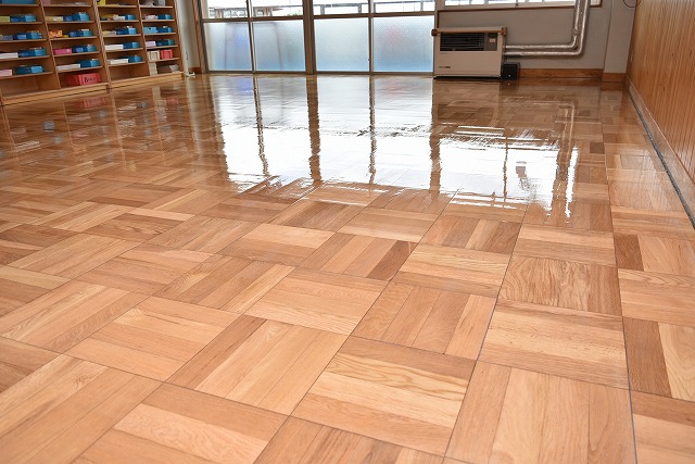 本園舎、東園舎、南園舎 全ての園舎の木床改修工事を実施。古い表皮をすべて剥離しウレタン樹脂を塗布しました。お蔭様で床面はピカピカに仕上がりました!